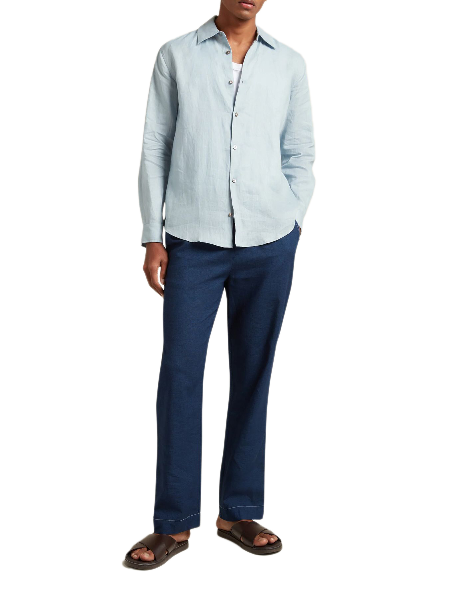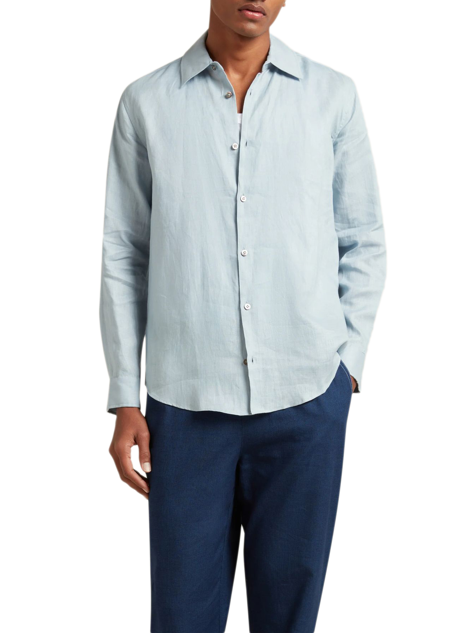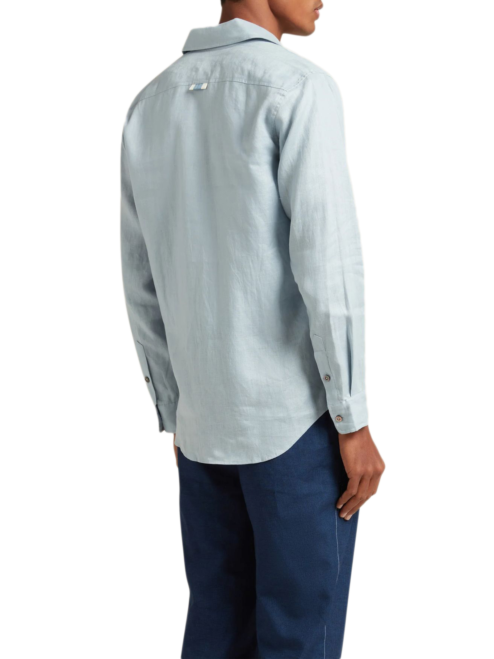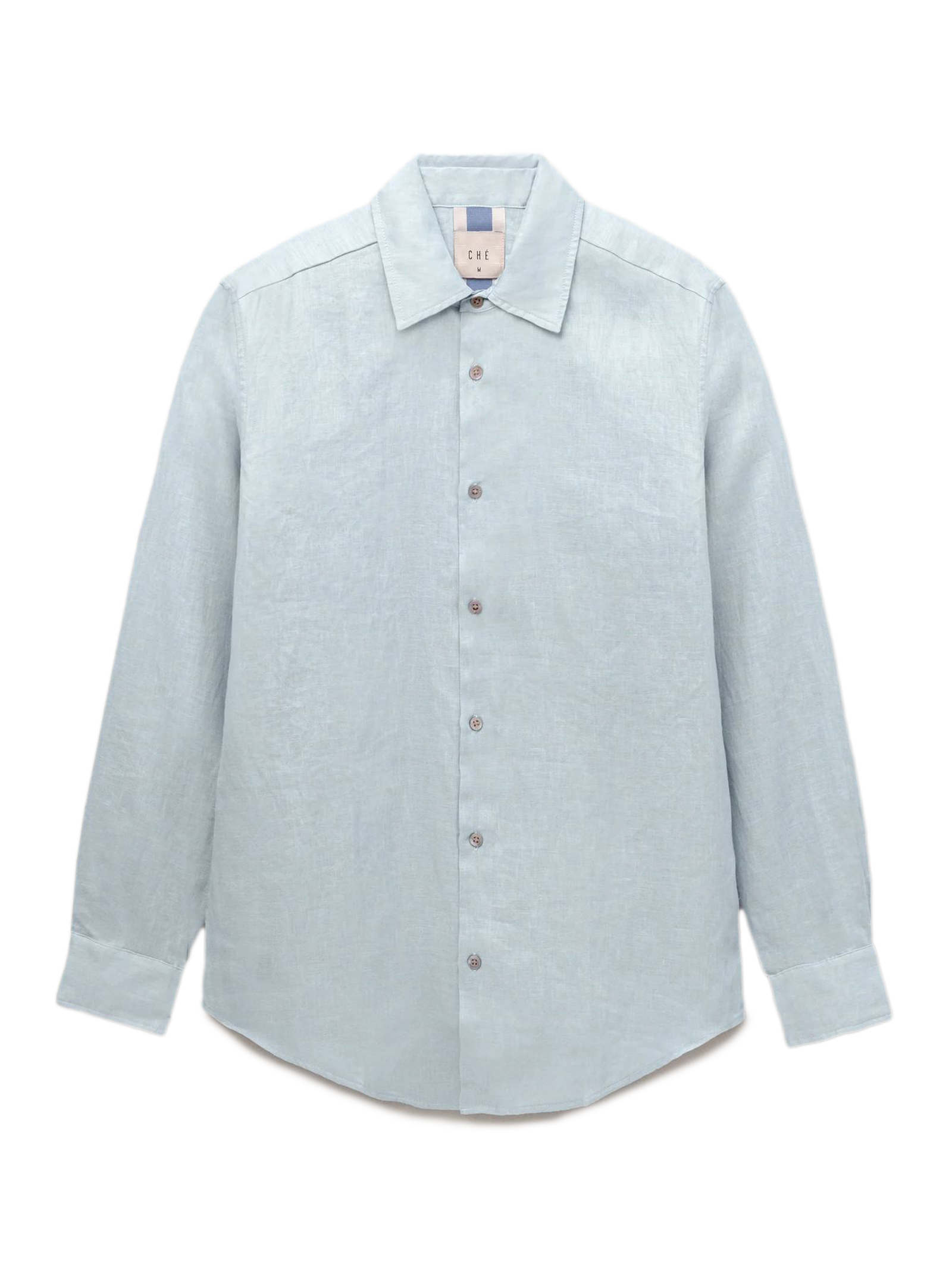 Camicia in lino blu polvere. Realizzata in lino naturalmente biodegradabile, la nostra camicia estiva dalla vestibilità slim è sostenibile, leggera e traspirante. Presenta i caratteristici dettagli a nastro sul carré posteriore e allinterno del collo, oltre ai bottoni a forma di conchiglia con il marchio CHÉ