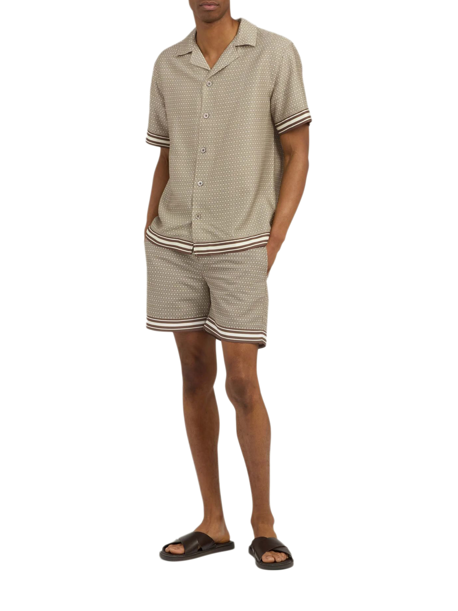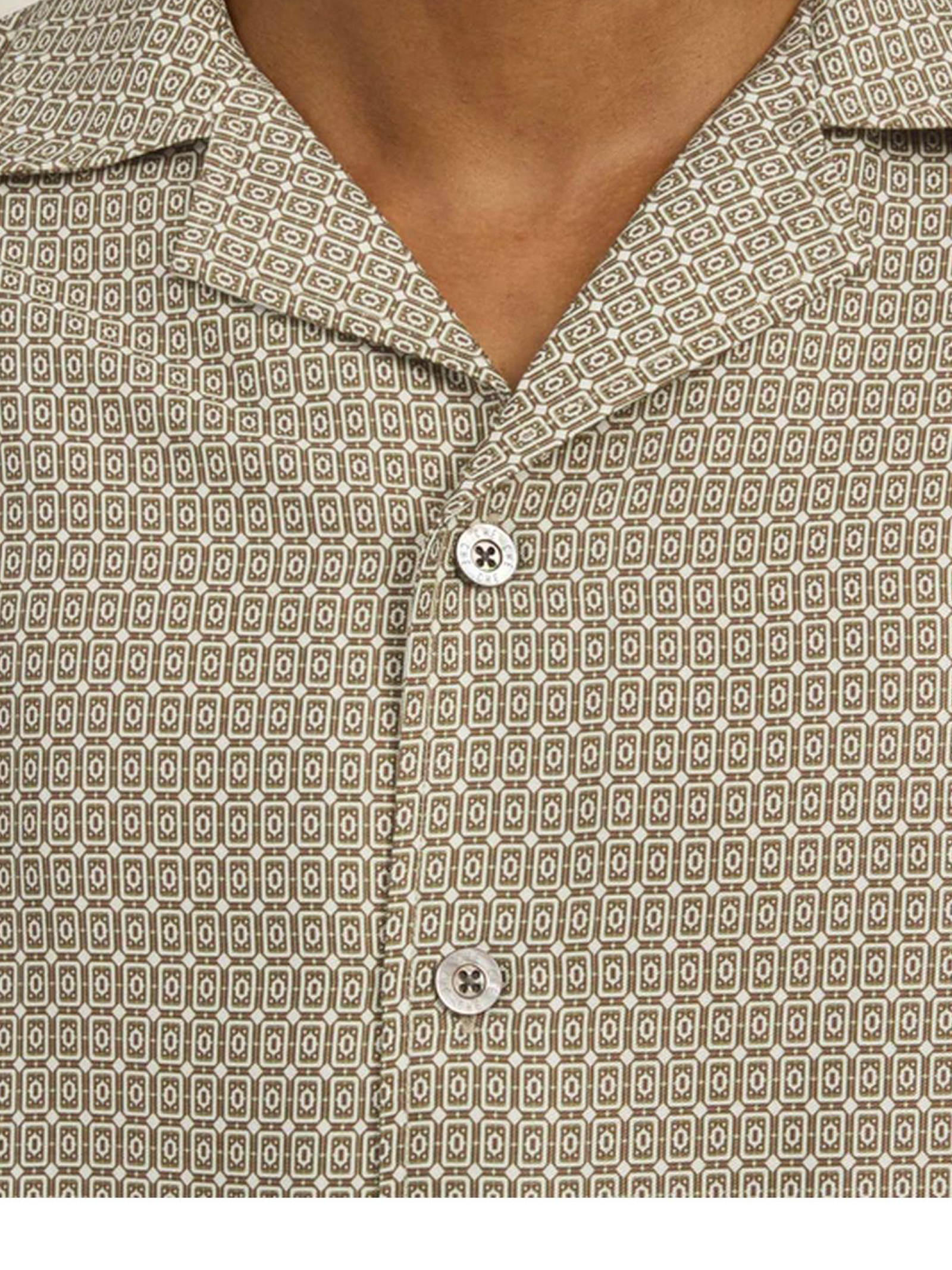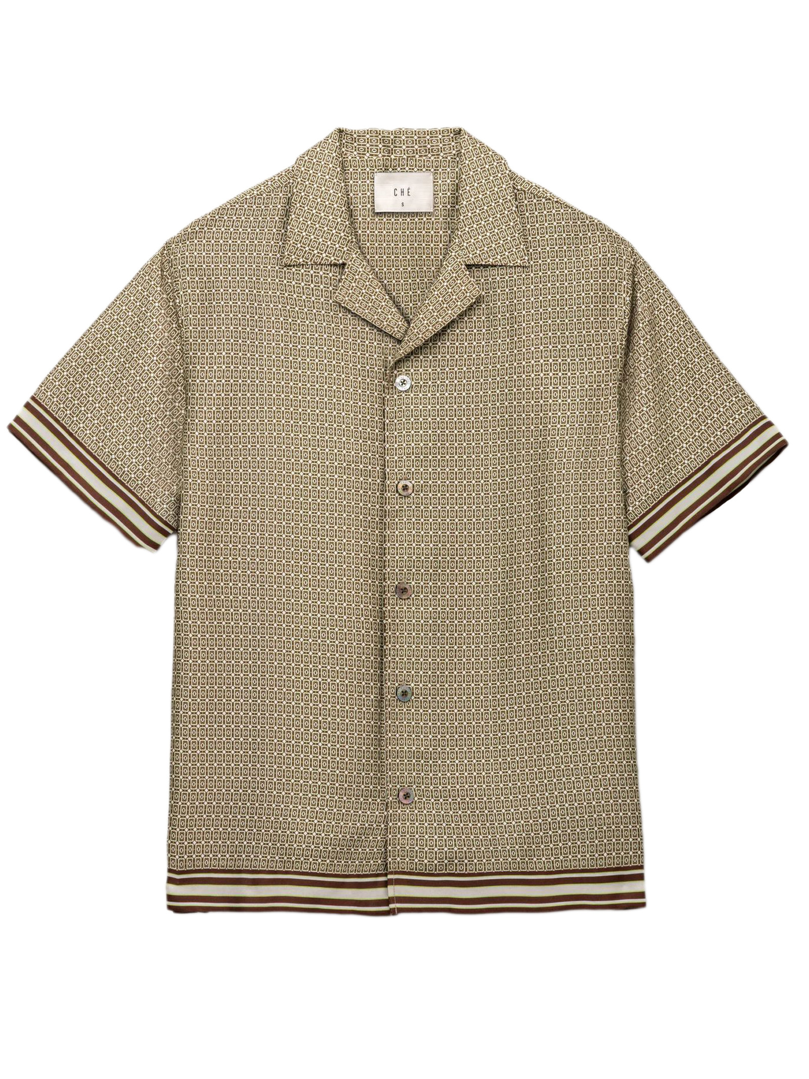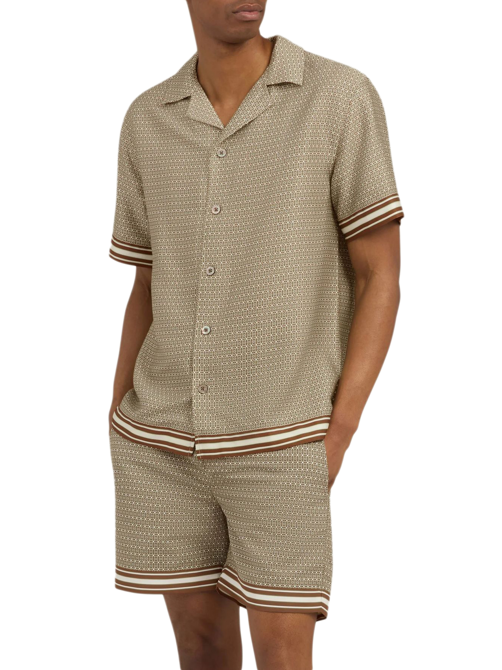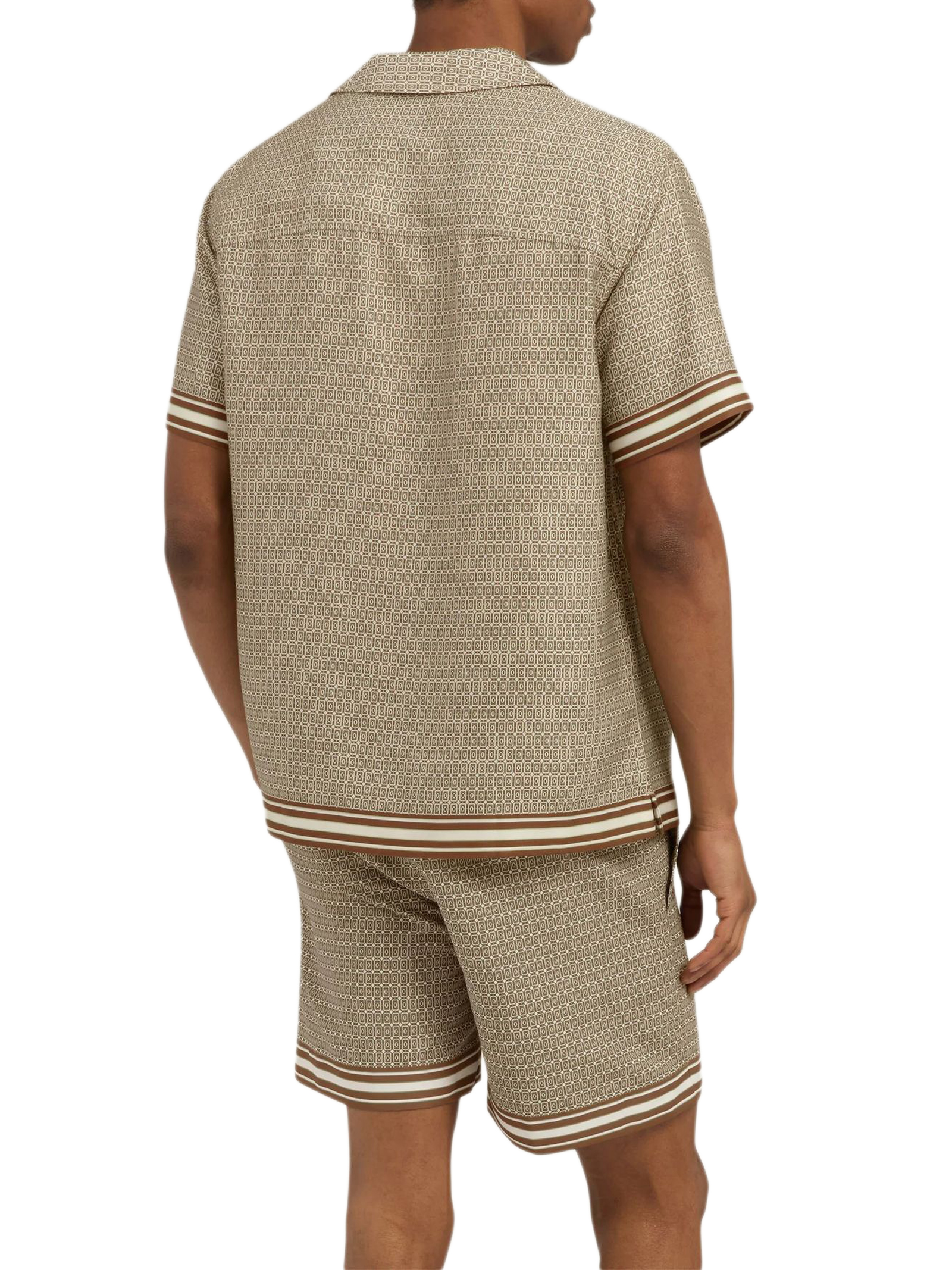 Camicia stampata Lucena color marrone chiaro, caratterizzata da una stampa geometrica stagionale ispirata ai motivi delle piastrelle retrò, rifinita con una vistosa striscia ai polsini e allorlo, vestibilità comoda