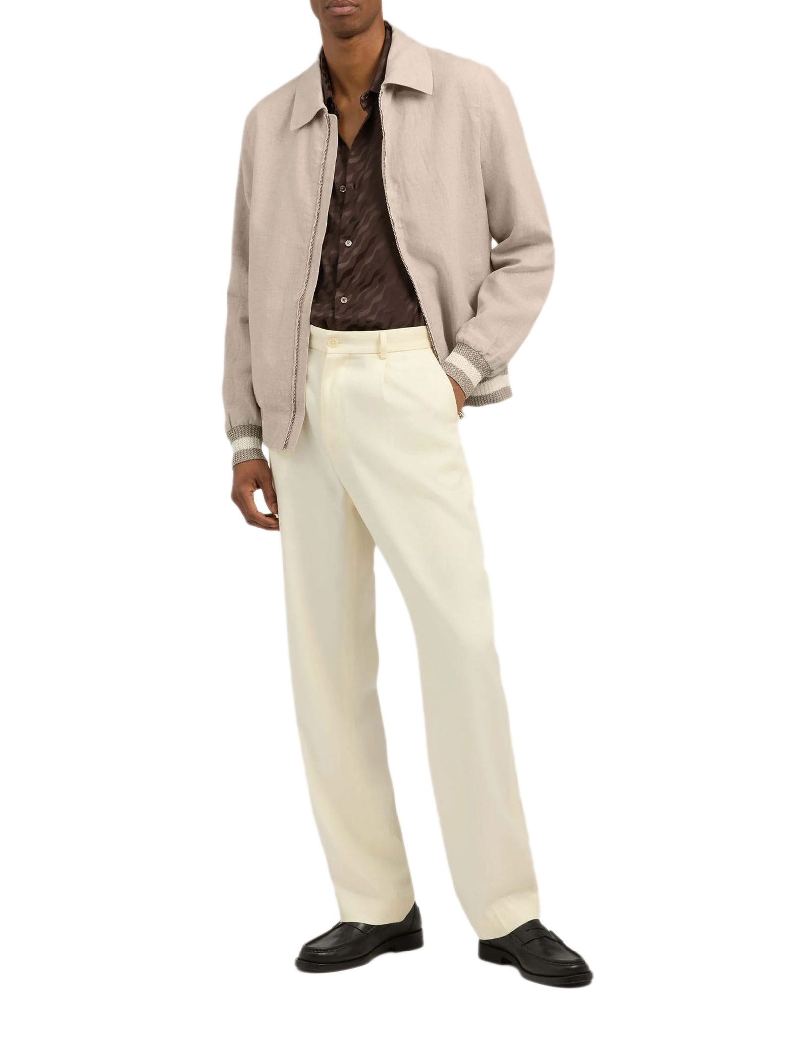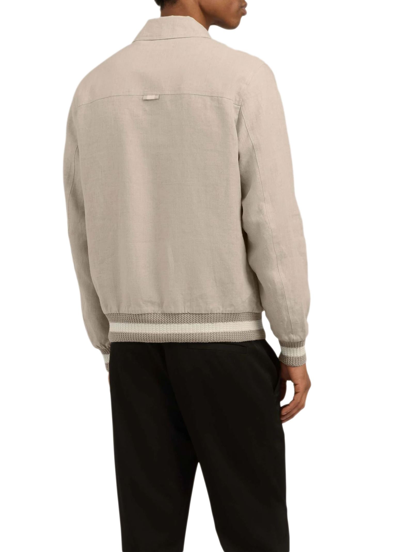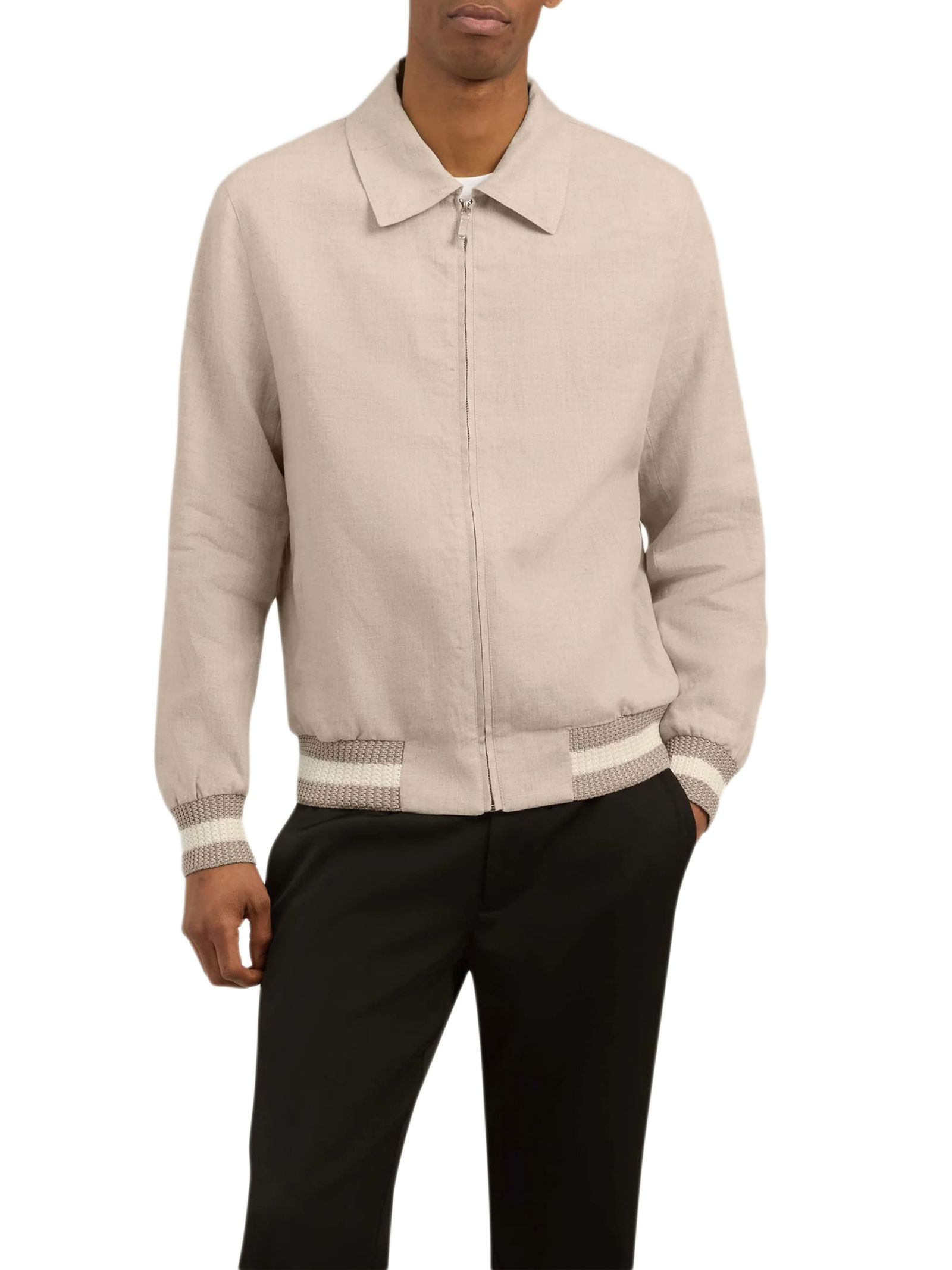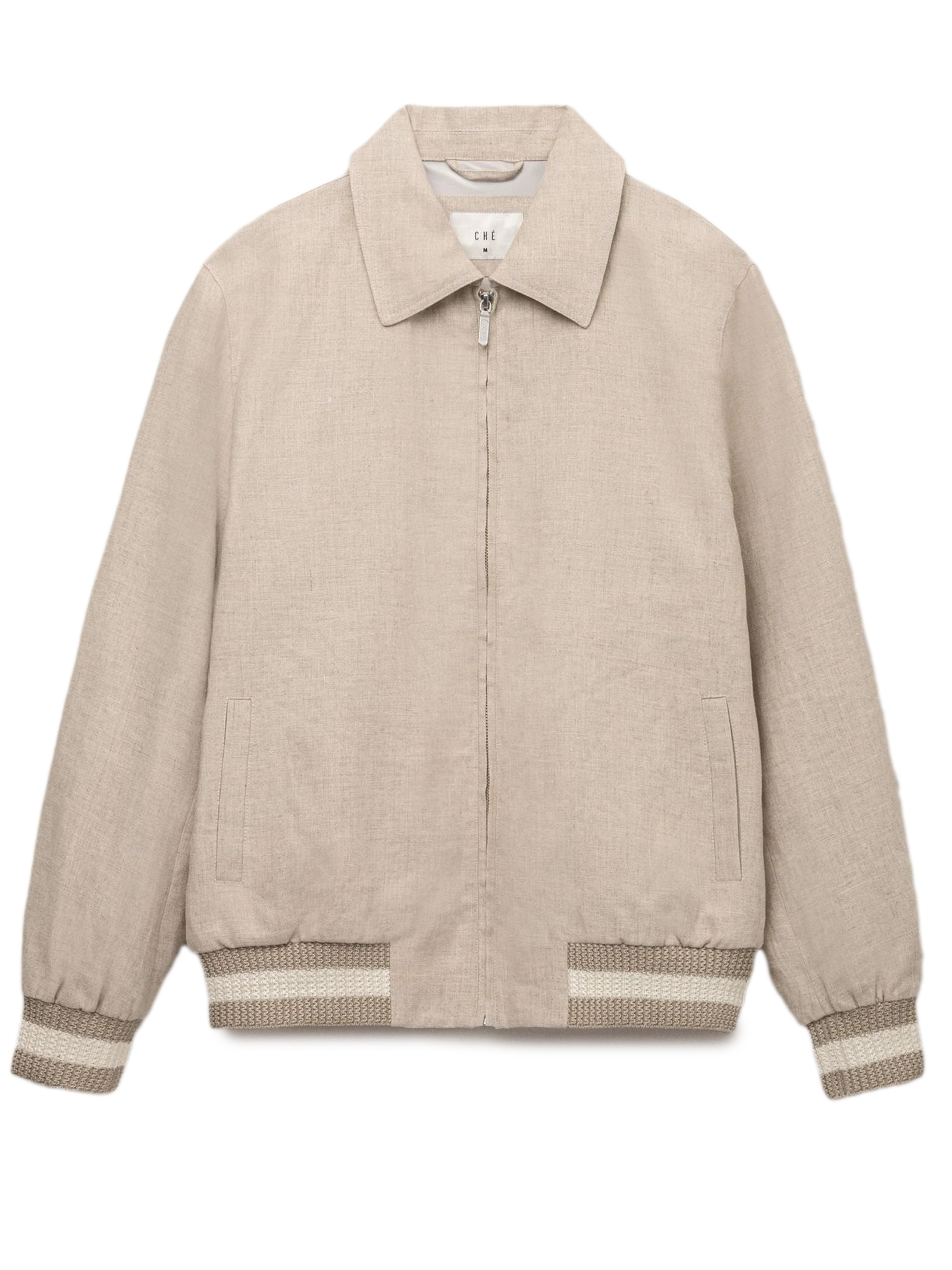 Giacca Benito in lino ecru, una giacca blouson in lino di ispirazione vintage dalla linea aderente e con sottili dettagli distintivi, con una striscia Ché in maglia tono su tono personalizzata sui polsini e cerniera a doppia corsa