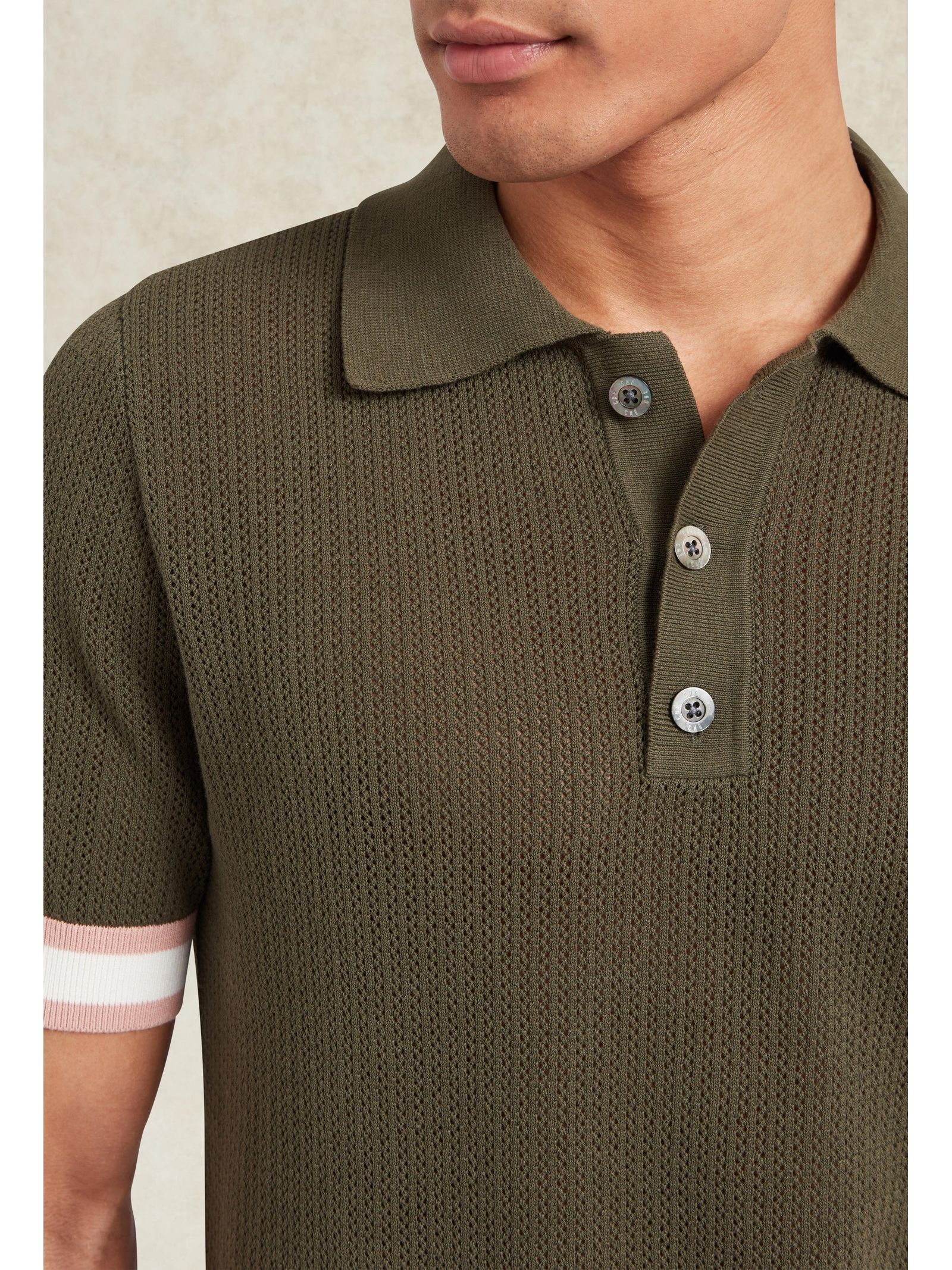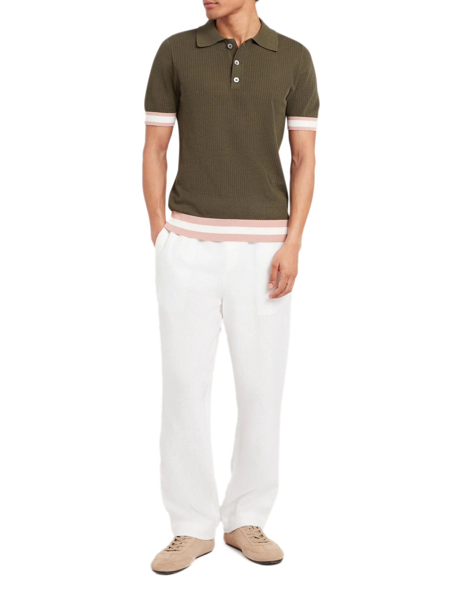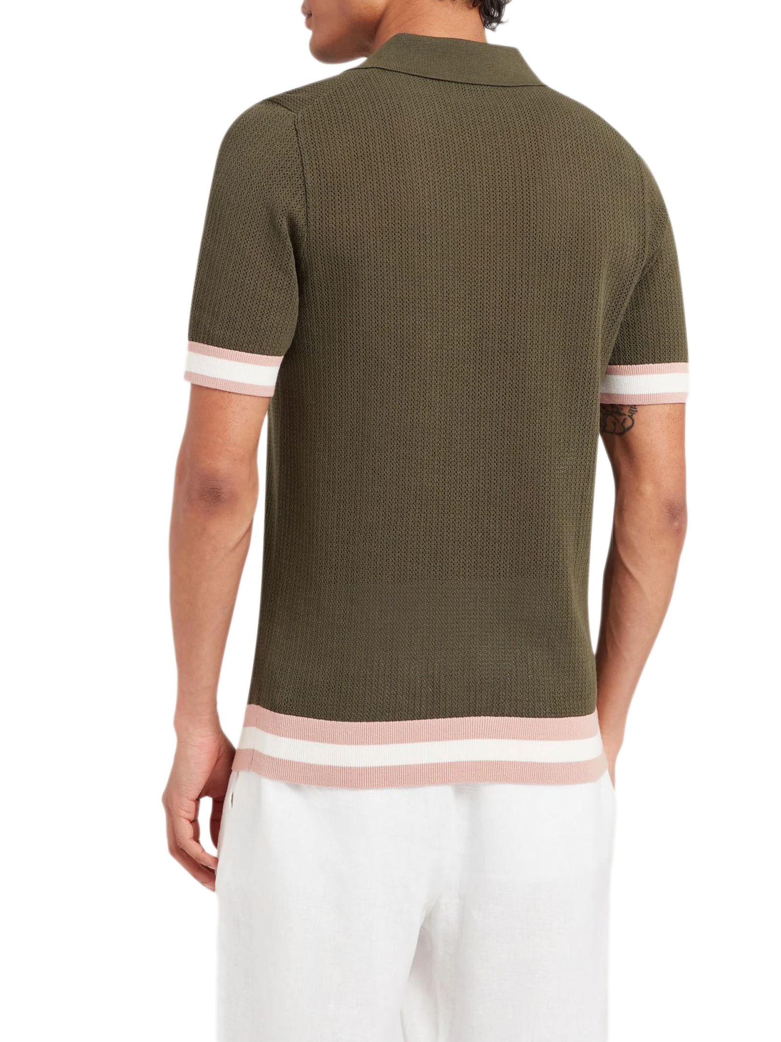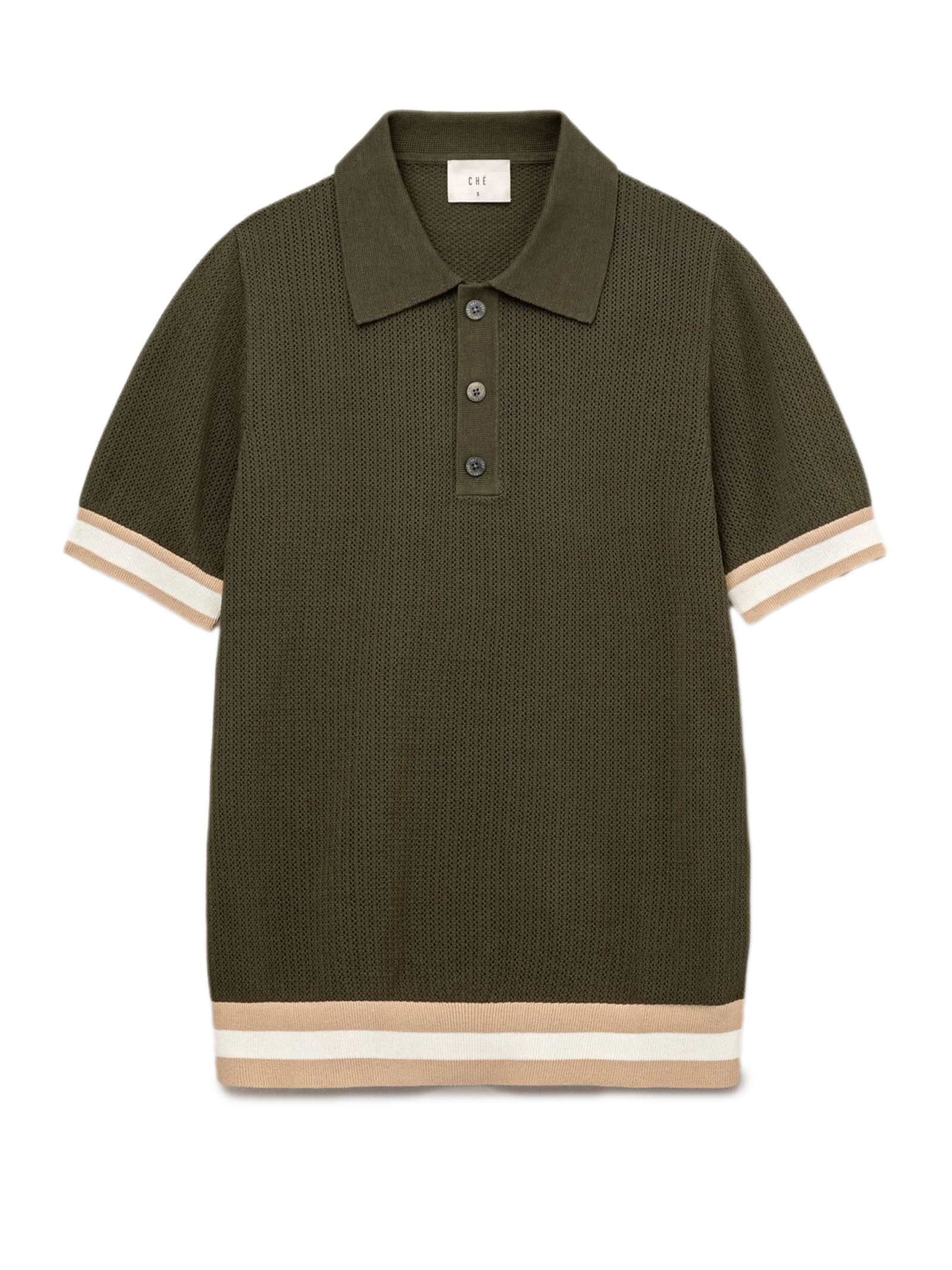 Polo Quinn in maglia larga di cotone color kaki, realizzata con una maglia ampia e ariosa per farti sentire fresco e leggero durante i mesi estivi. Rifinita con i caratteristici polsini a righe Ché e bottoni intagliati a forma di conchiglia Trochus