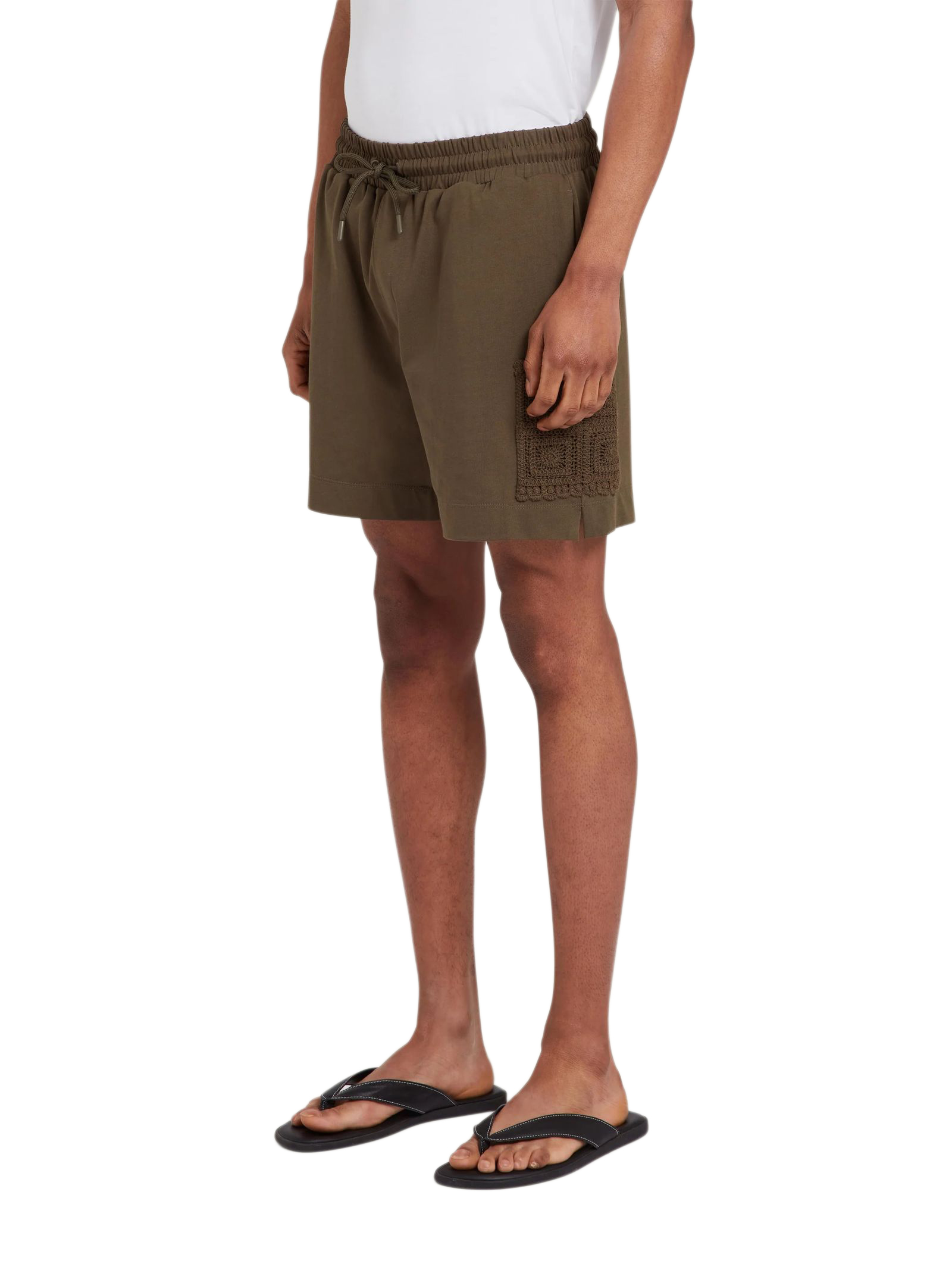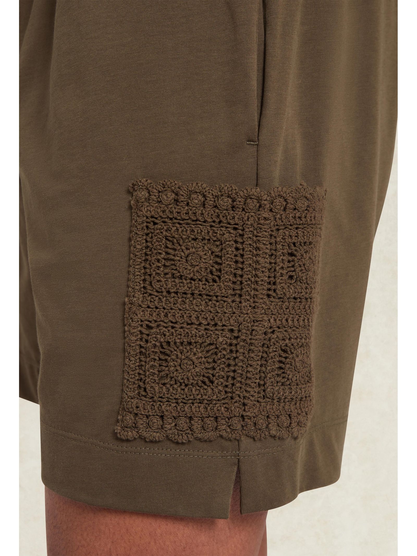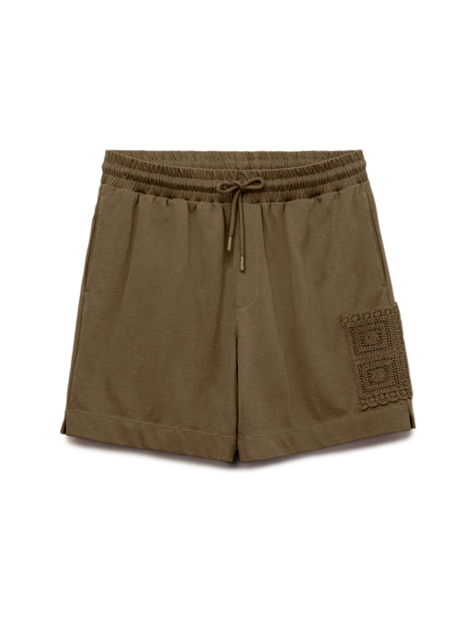 Shorts Inigo in jersey verde con una vestibilità comoda, elastico in vita con coulisse e il caratteristico dettaglio all'uncinetto Inigo; 100% cotone