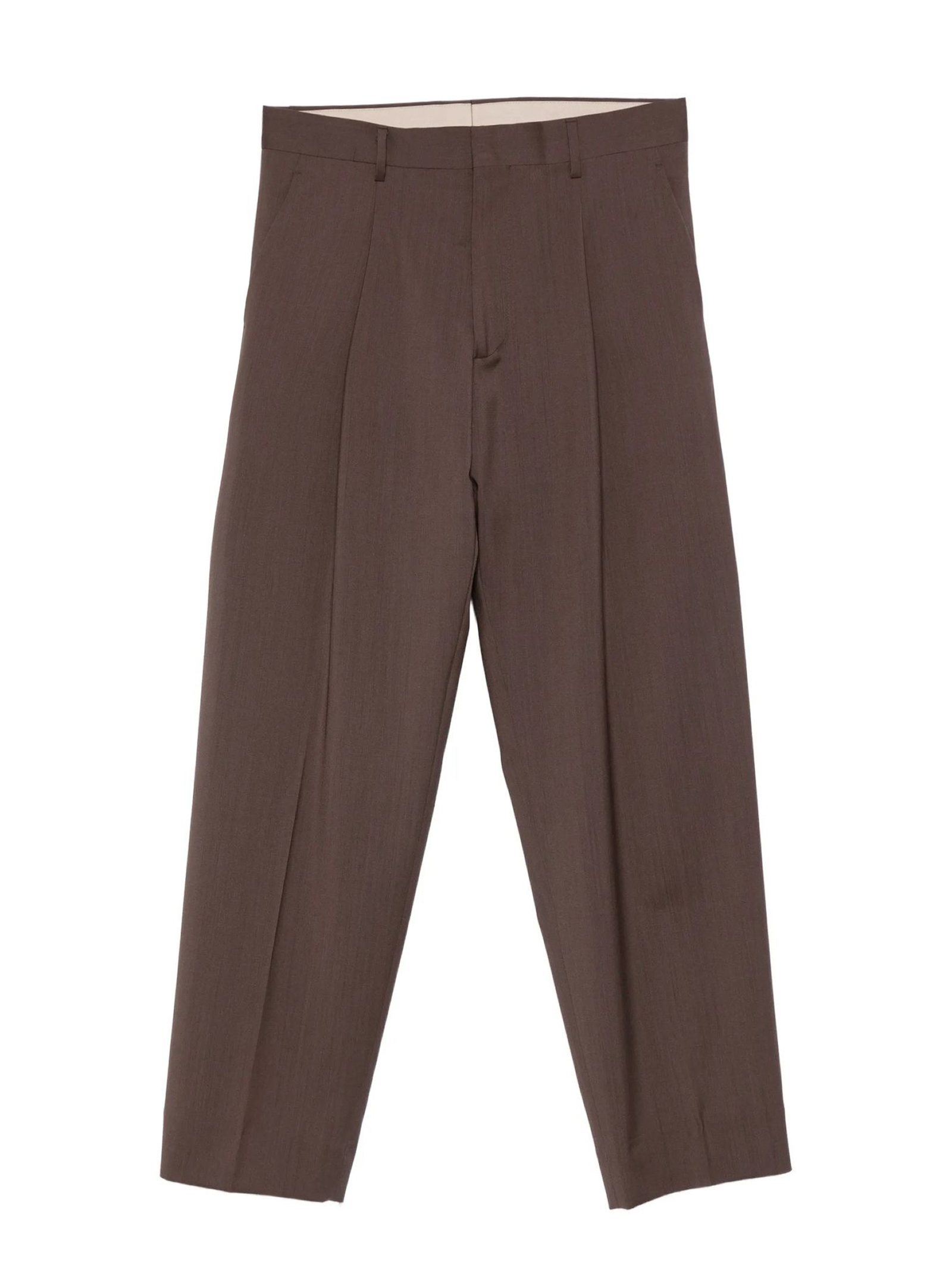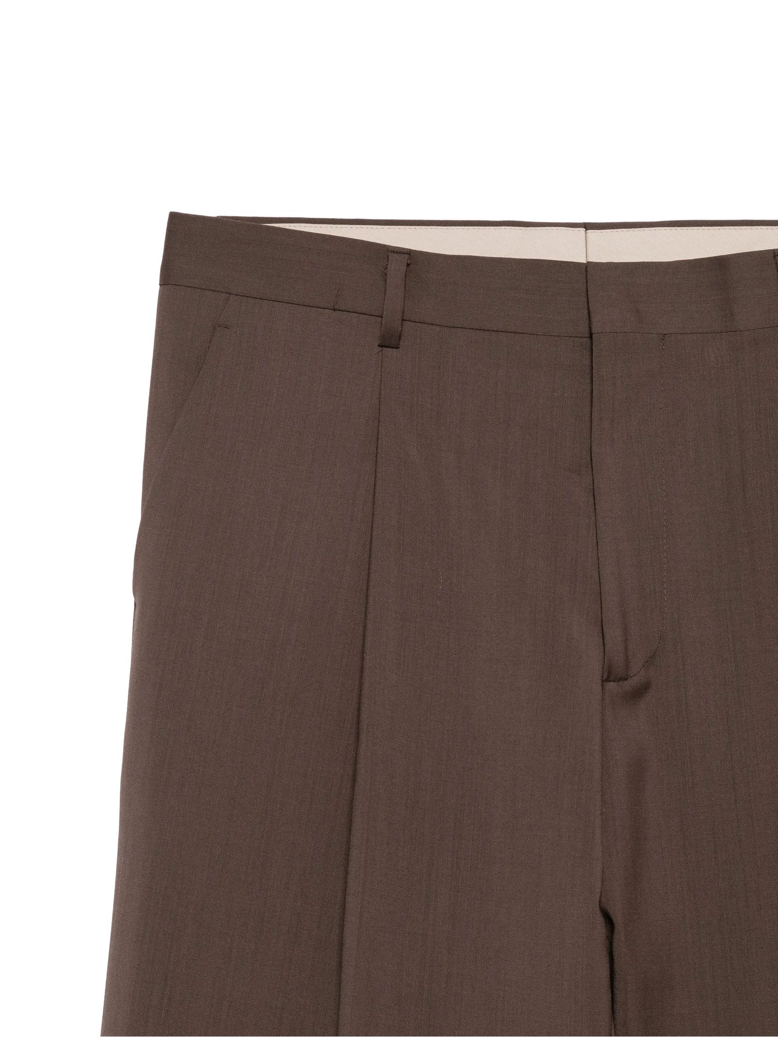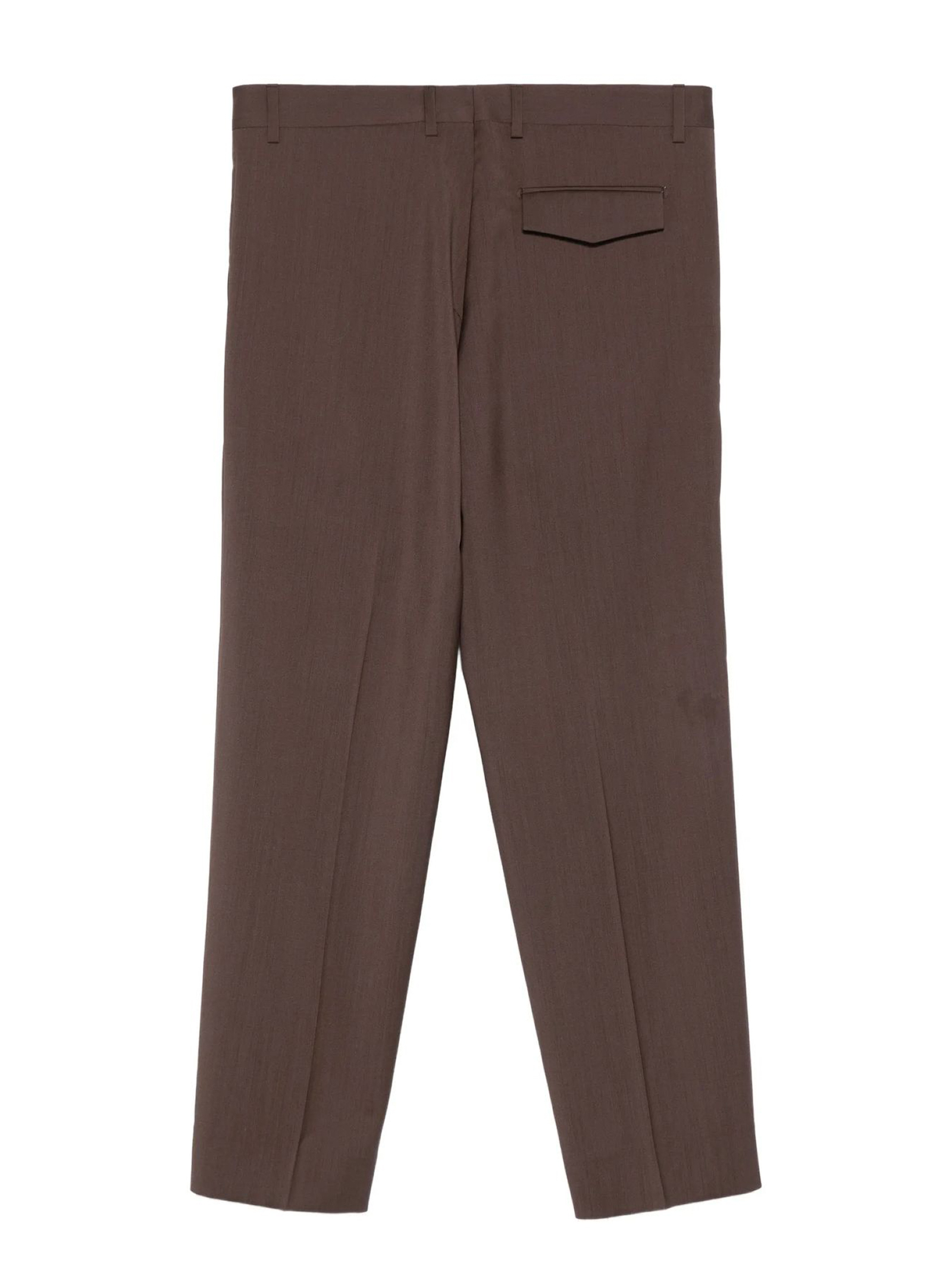 Pantalone in lana vergine marrone, passanti per cintura, tasca posteriore con patta, tasche anteriori, chiusura nascosta