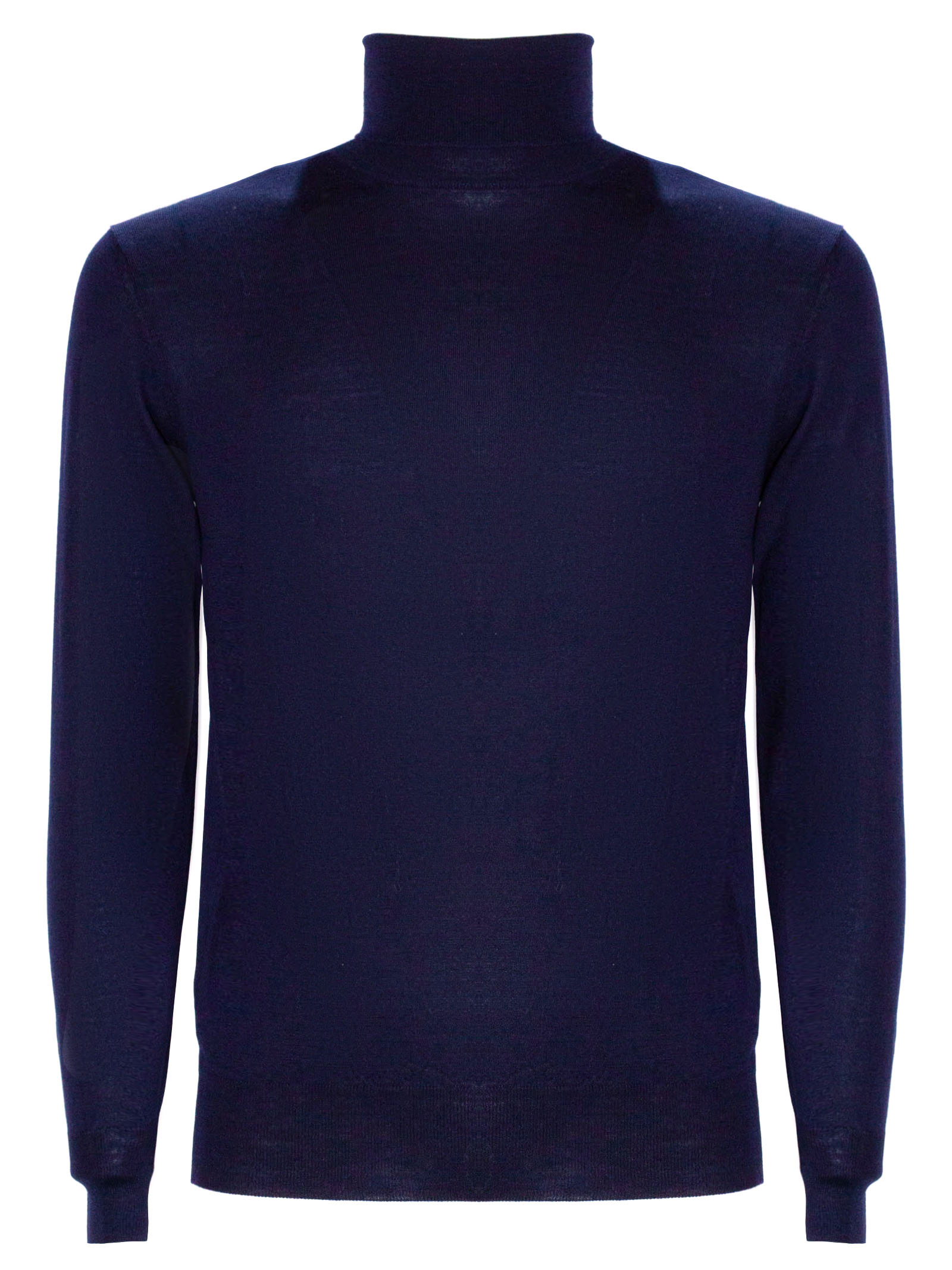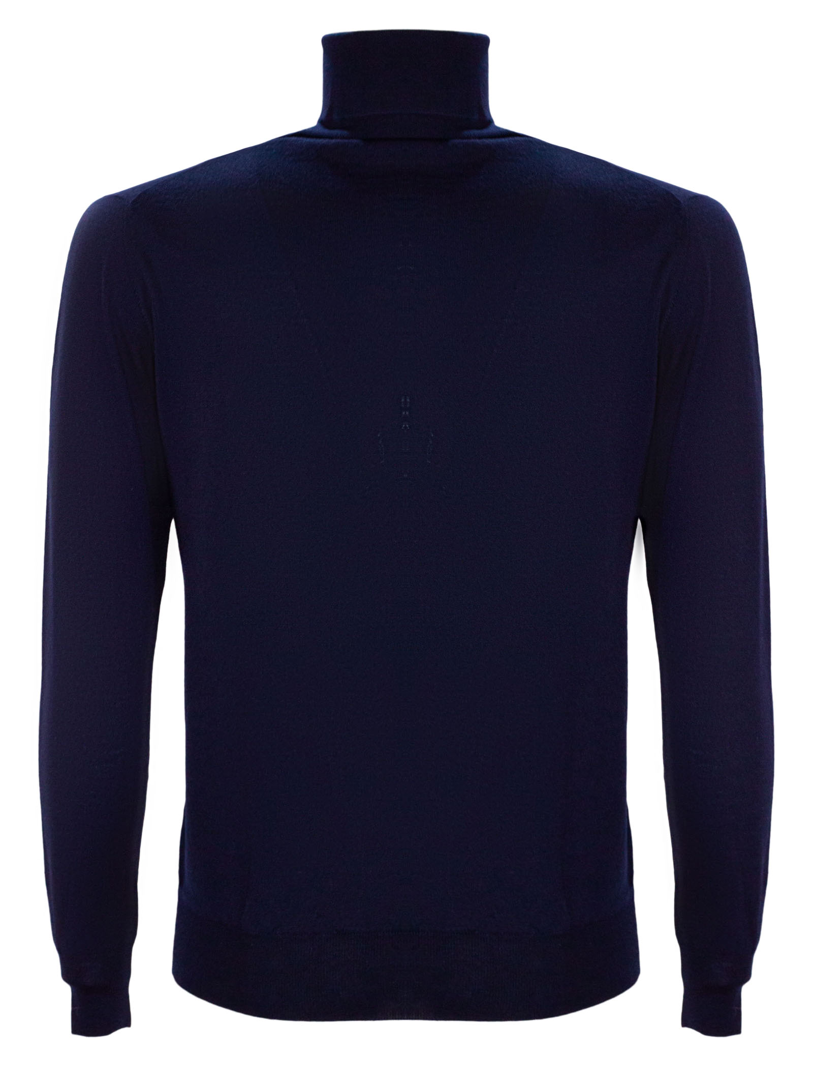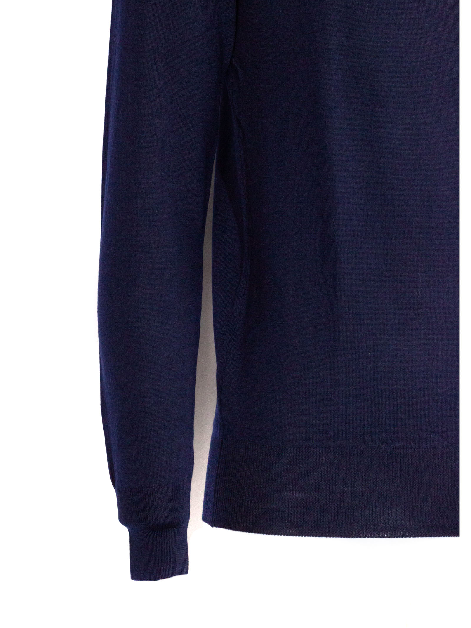 Magla in lana blu con collo alto, maniche lunghe, finiture a costine