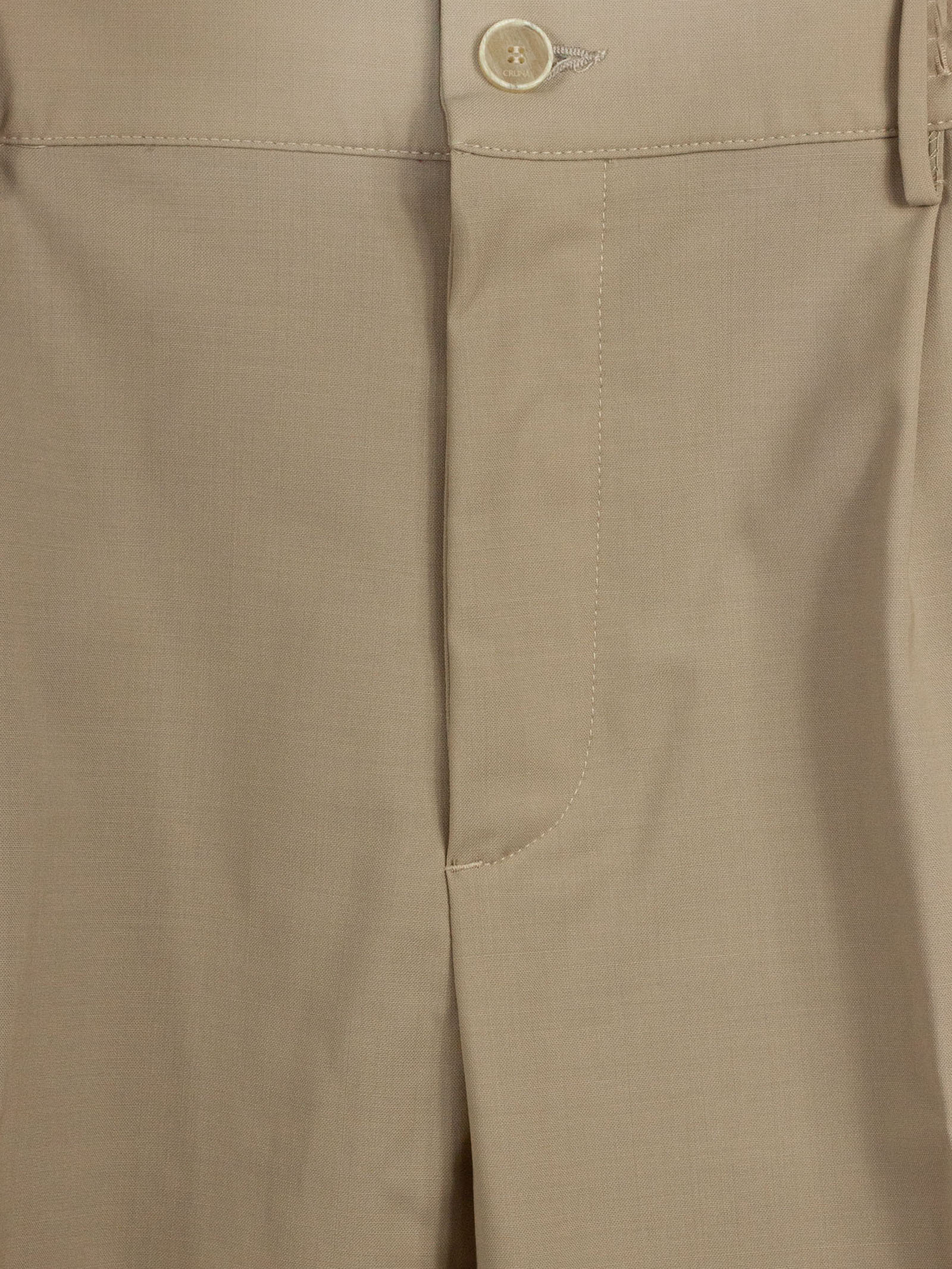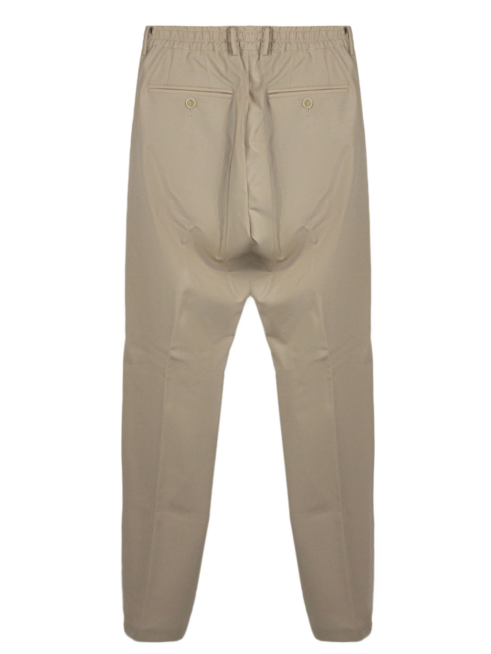 Pantalone in lana vergine beige con vita elasticizzata, passanti per cintura, elastico interno, chiusura nascosta, tasche laterali, tasche sul retro con chiusura bottone