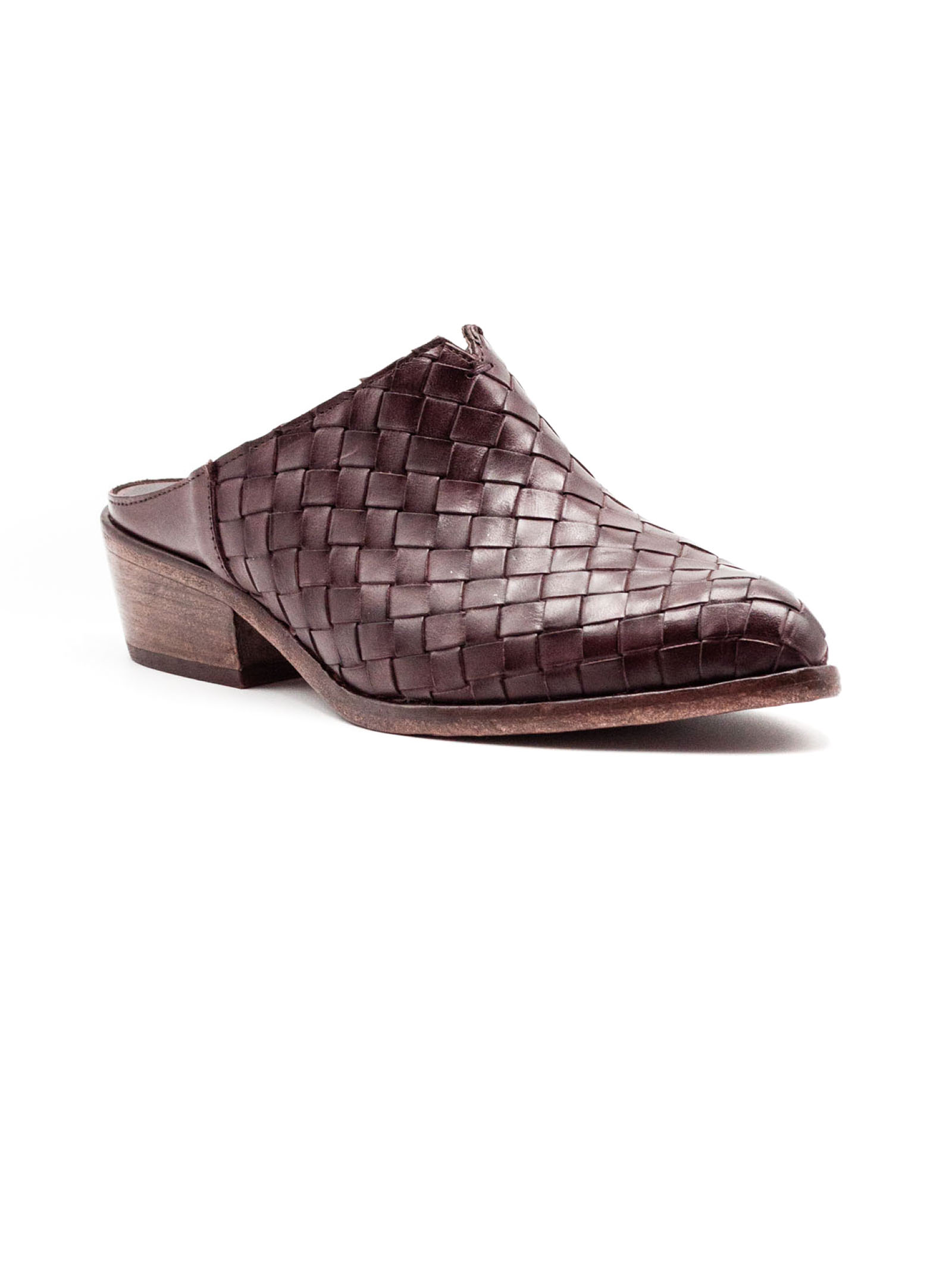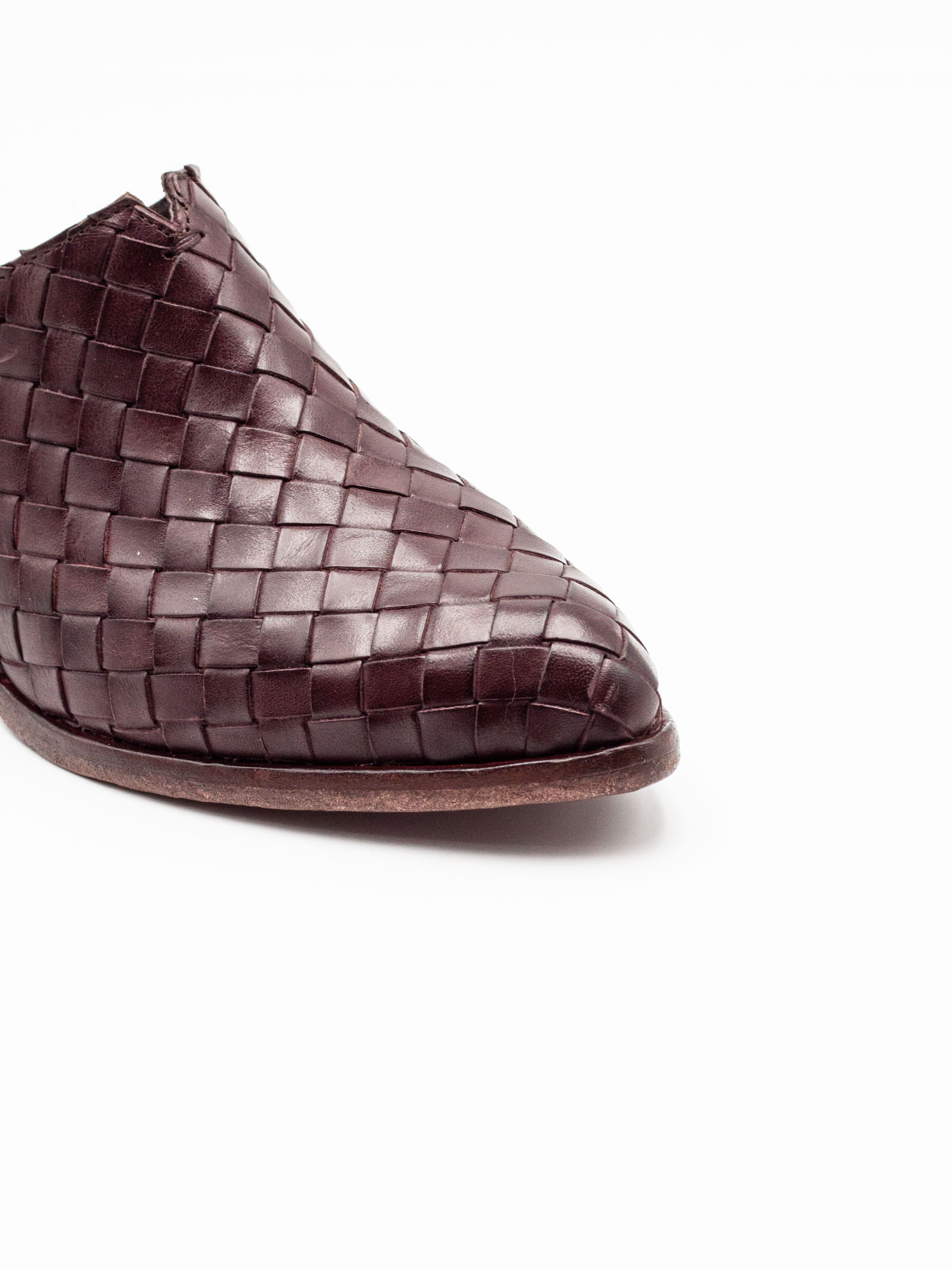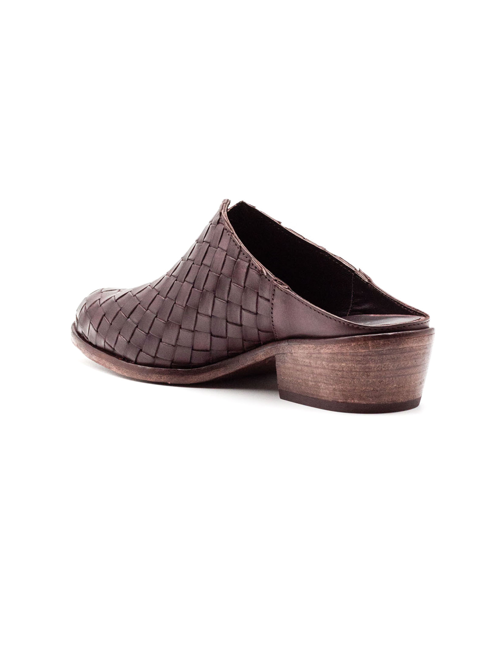 Sabot in pelle intrecciata testa di moro con punta smussata, suola in cuoio con logo, altezza tacco 5 cm