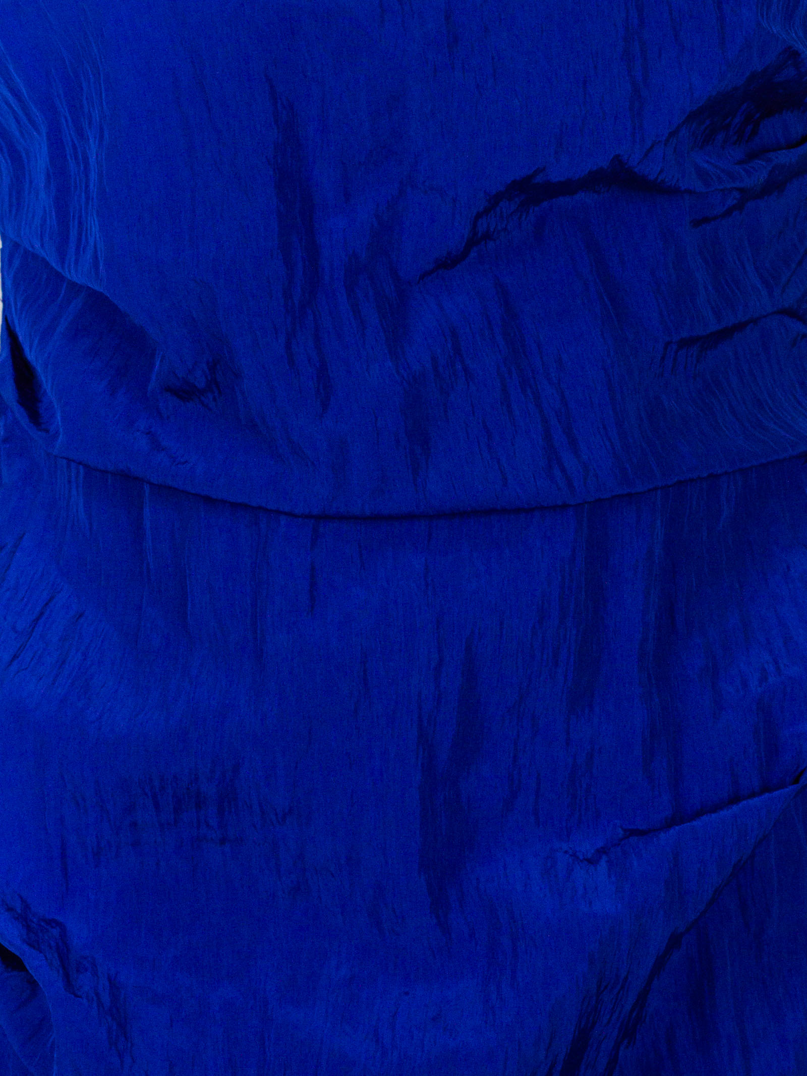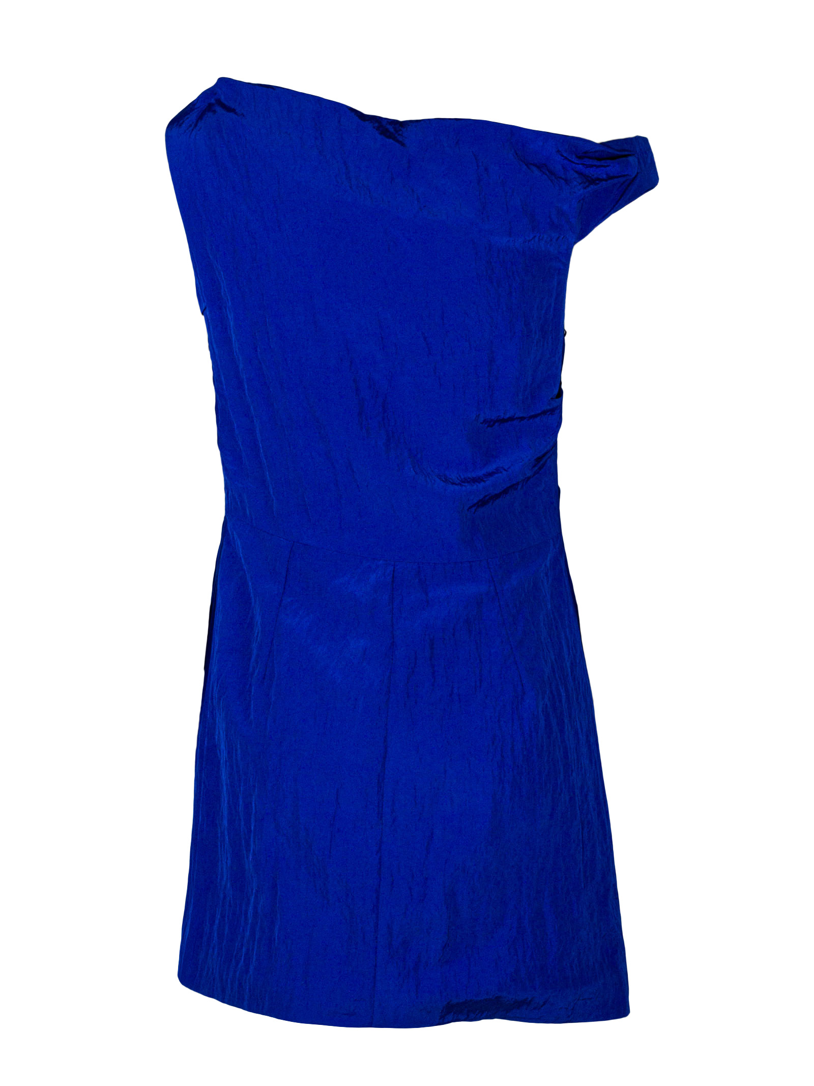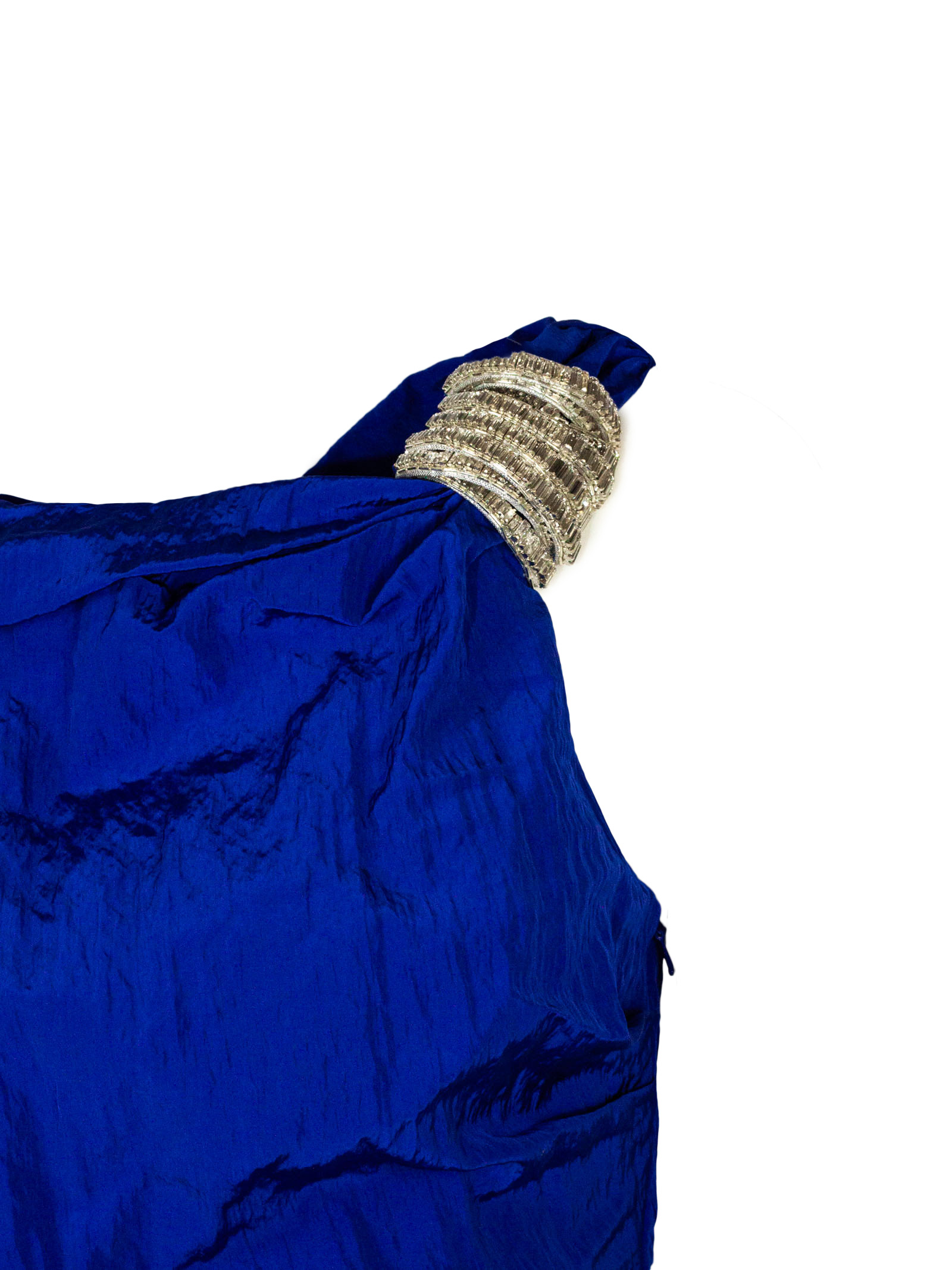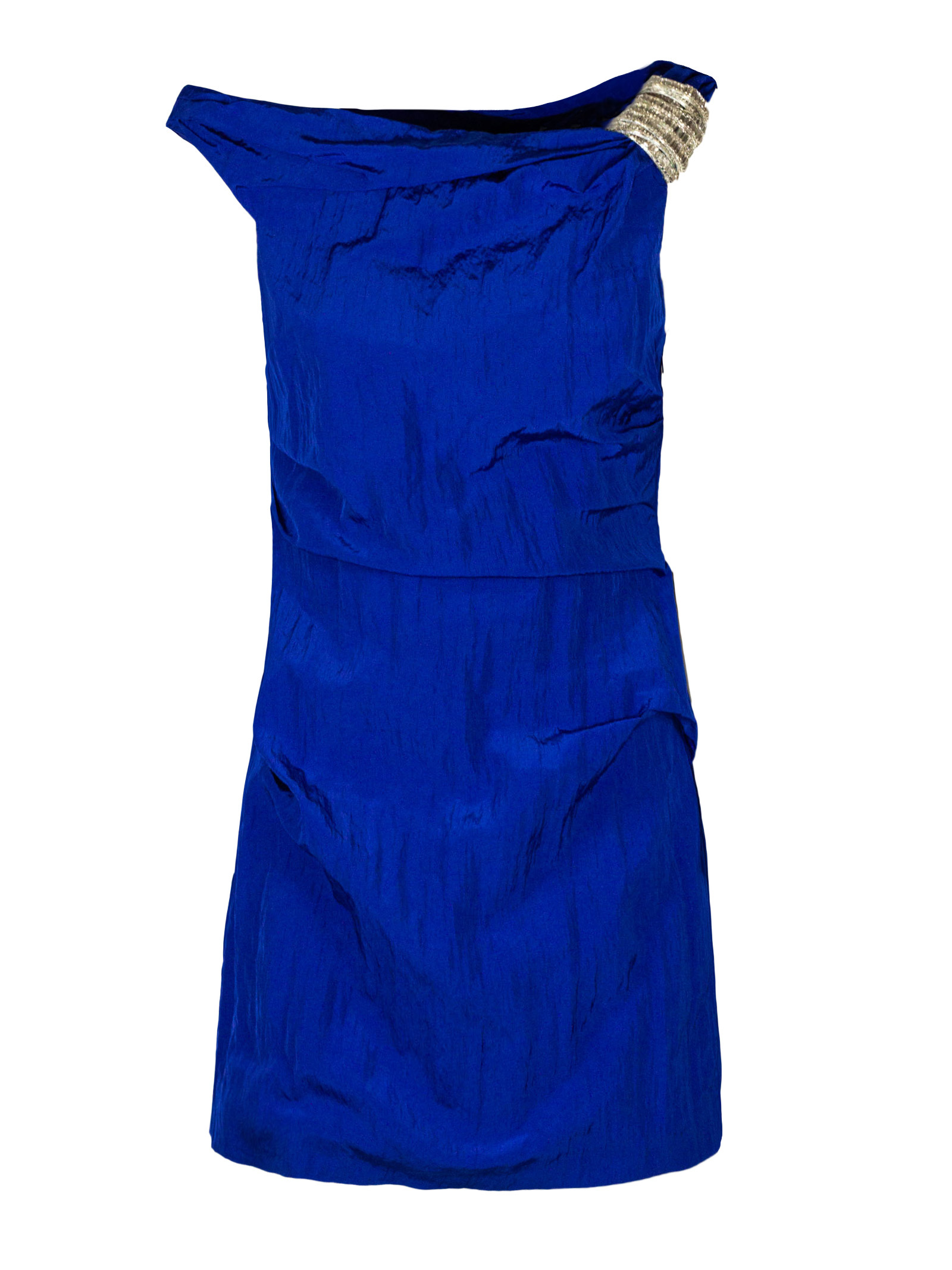 Abito Corto Blu Con Dettaglio Gioiello, Scollo Asimmetrico, Dettaglio Applicazione Gioiello Argentata Sulla Spalla, Vestibilità Aderente Con Effetto Drappeggiato, Senza Maniche