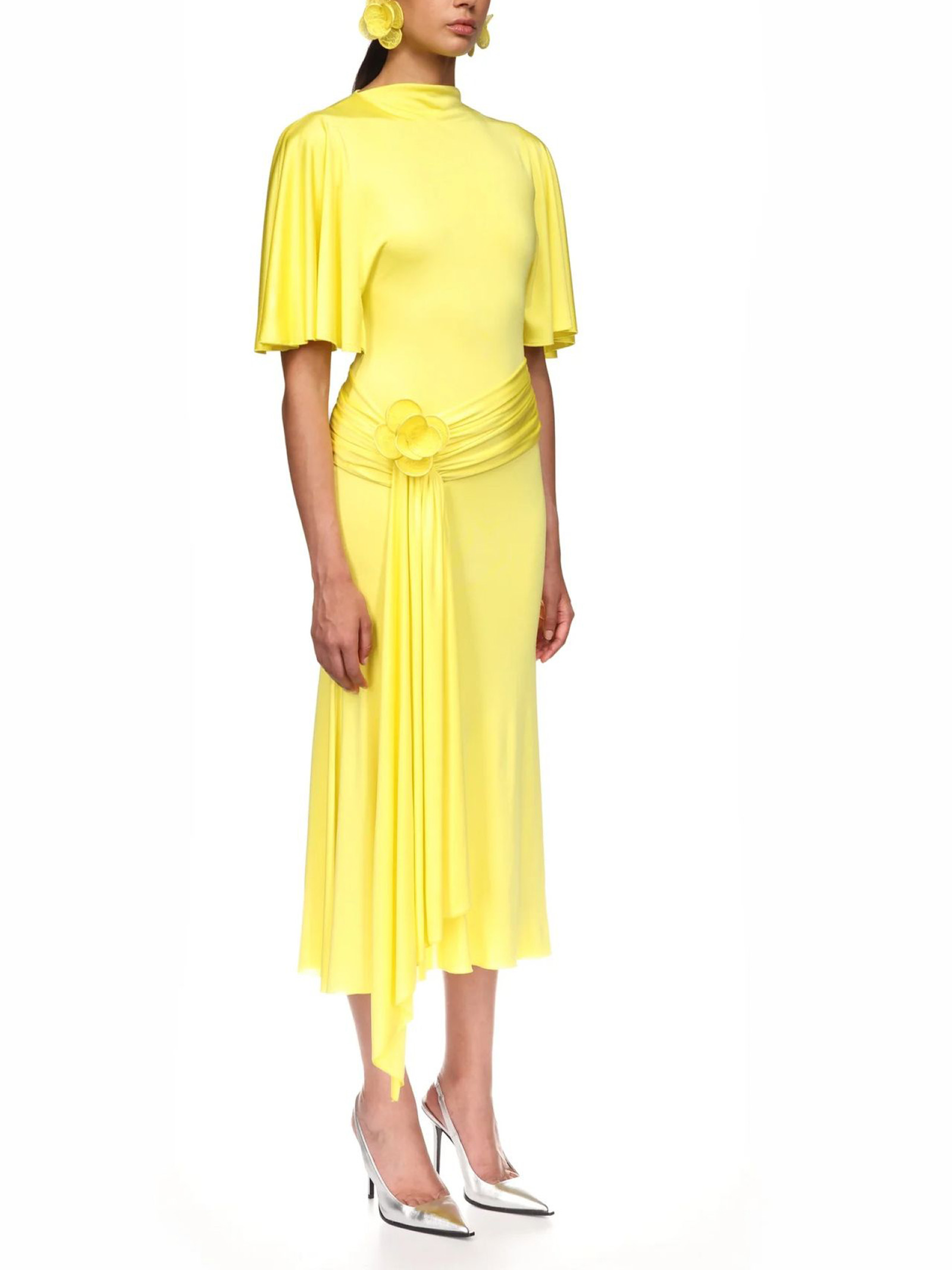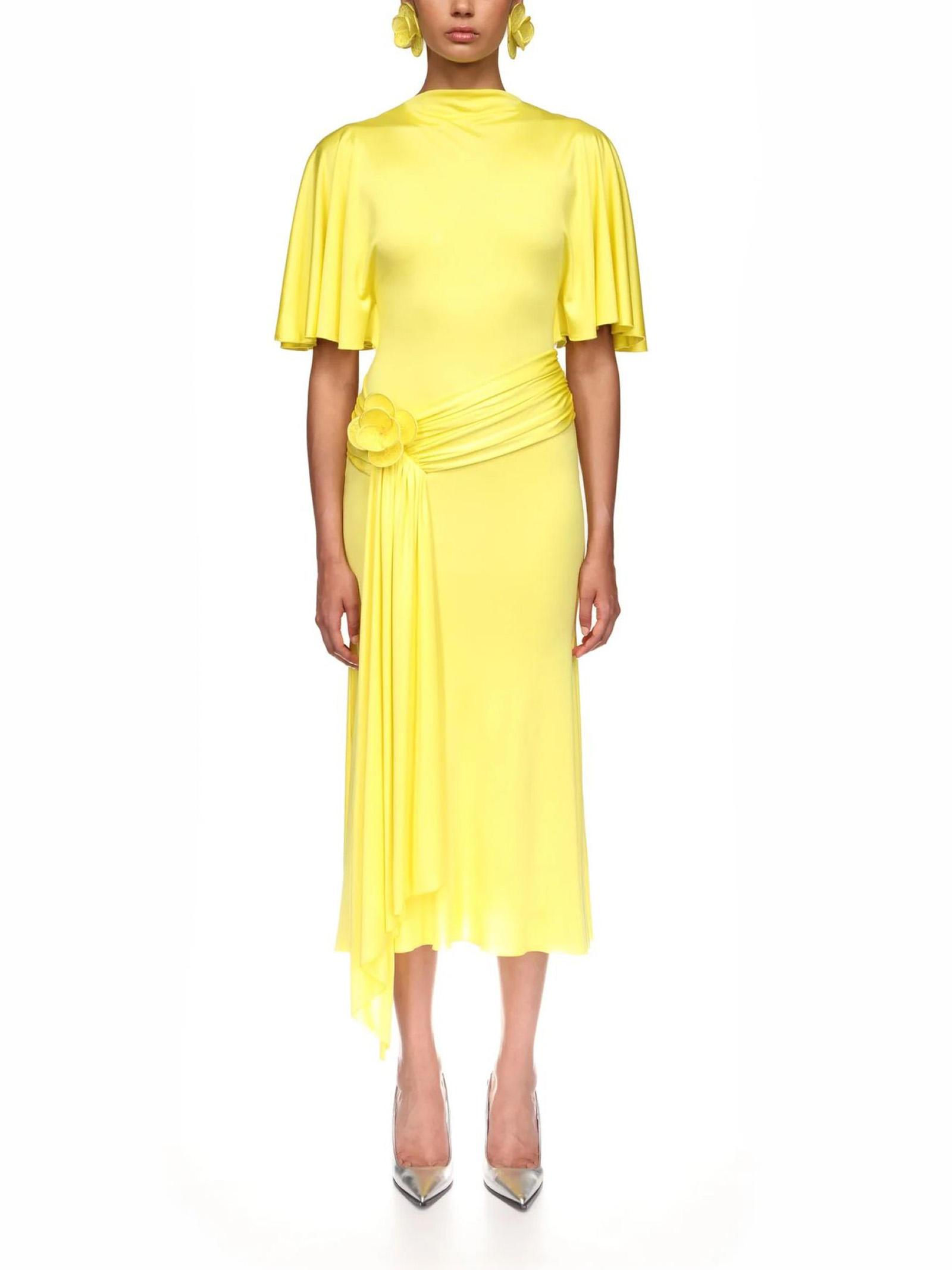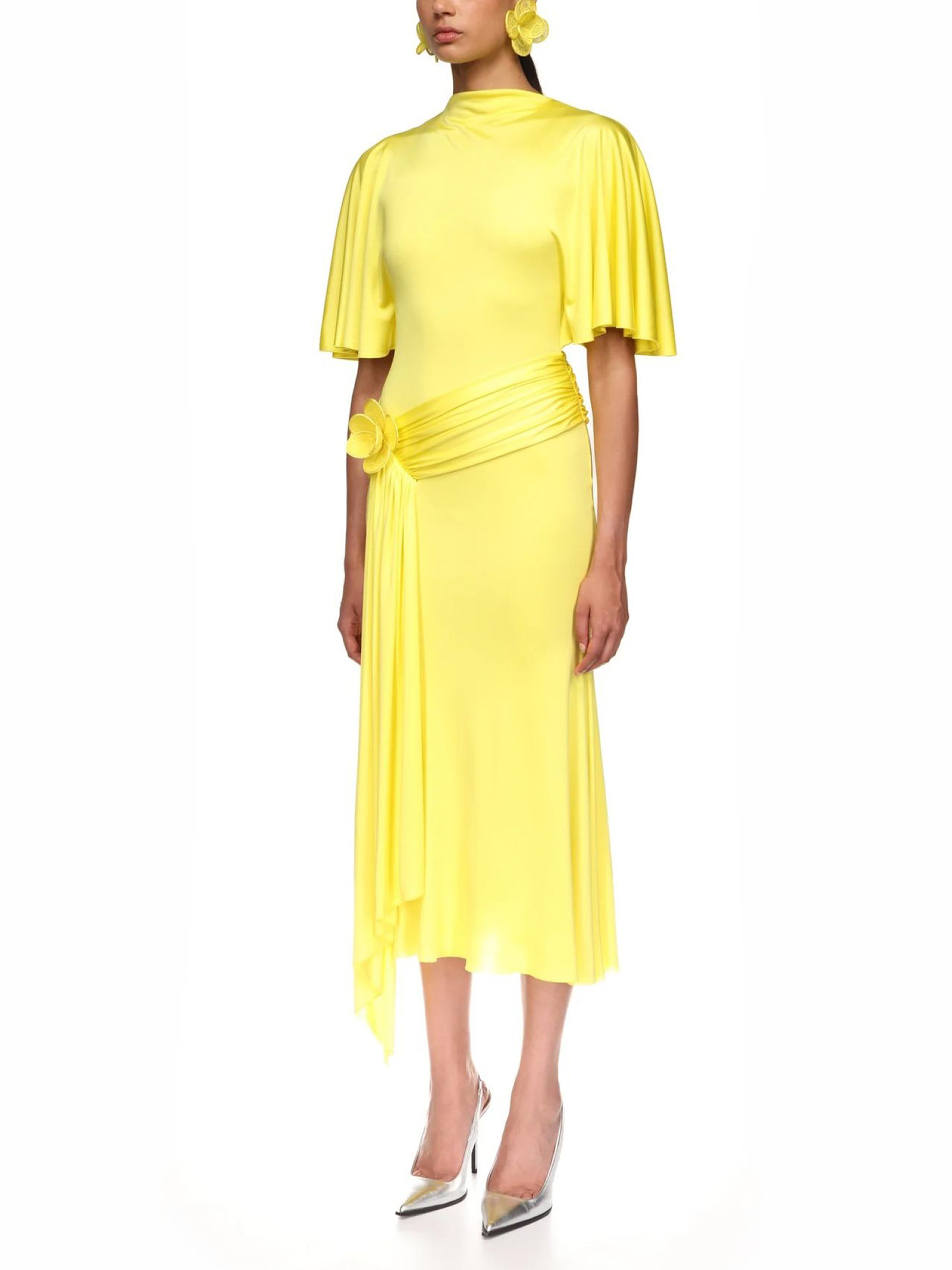 Abito midi in jersey giallo con maniche drappeggiate, ricami floreali in pizzo 3D, drappeggio sui fianchi e orlo a balze. Chiusura con zip sul retro.