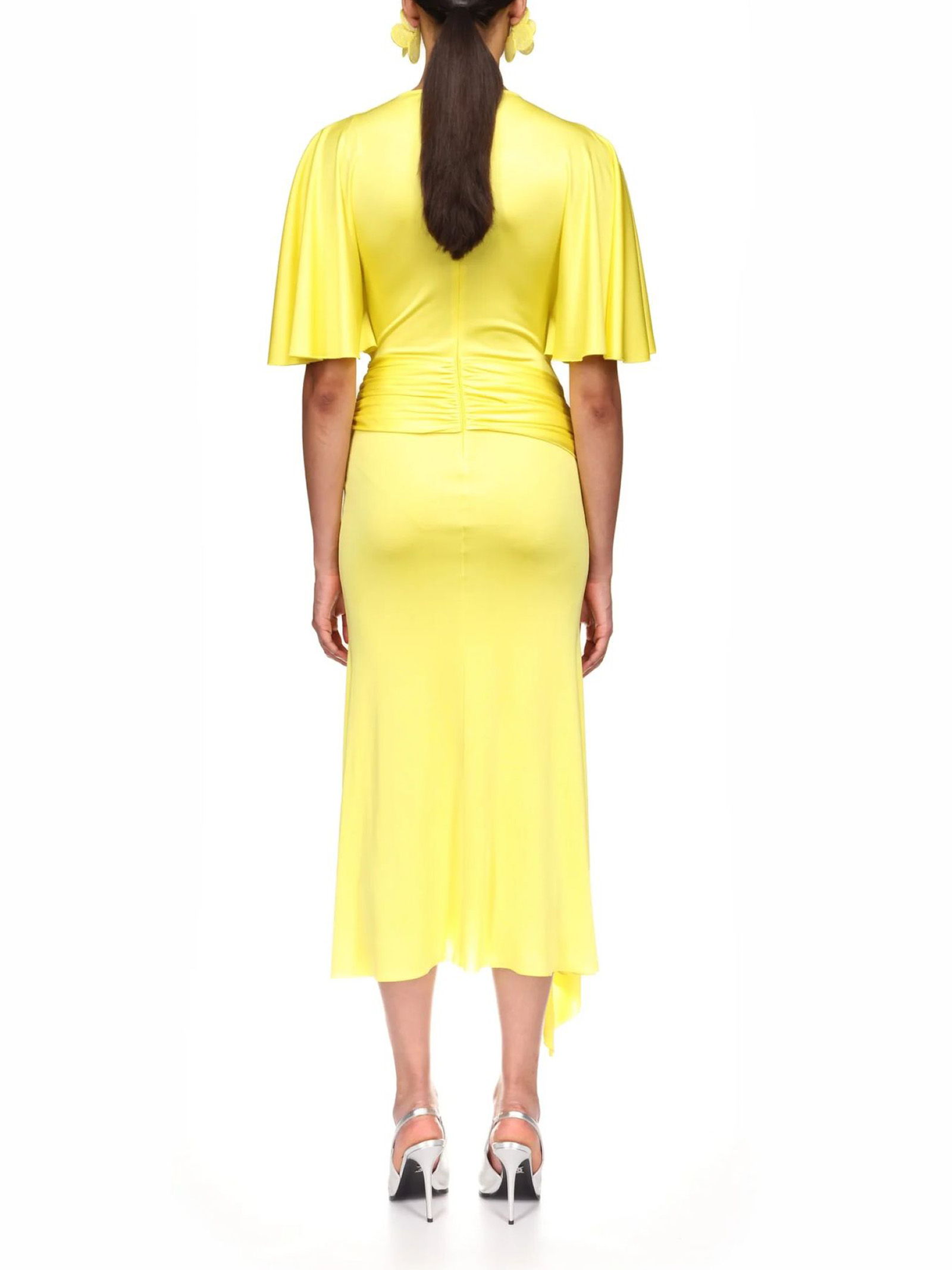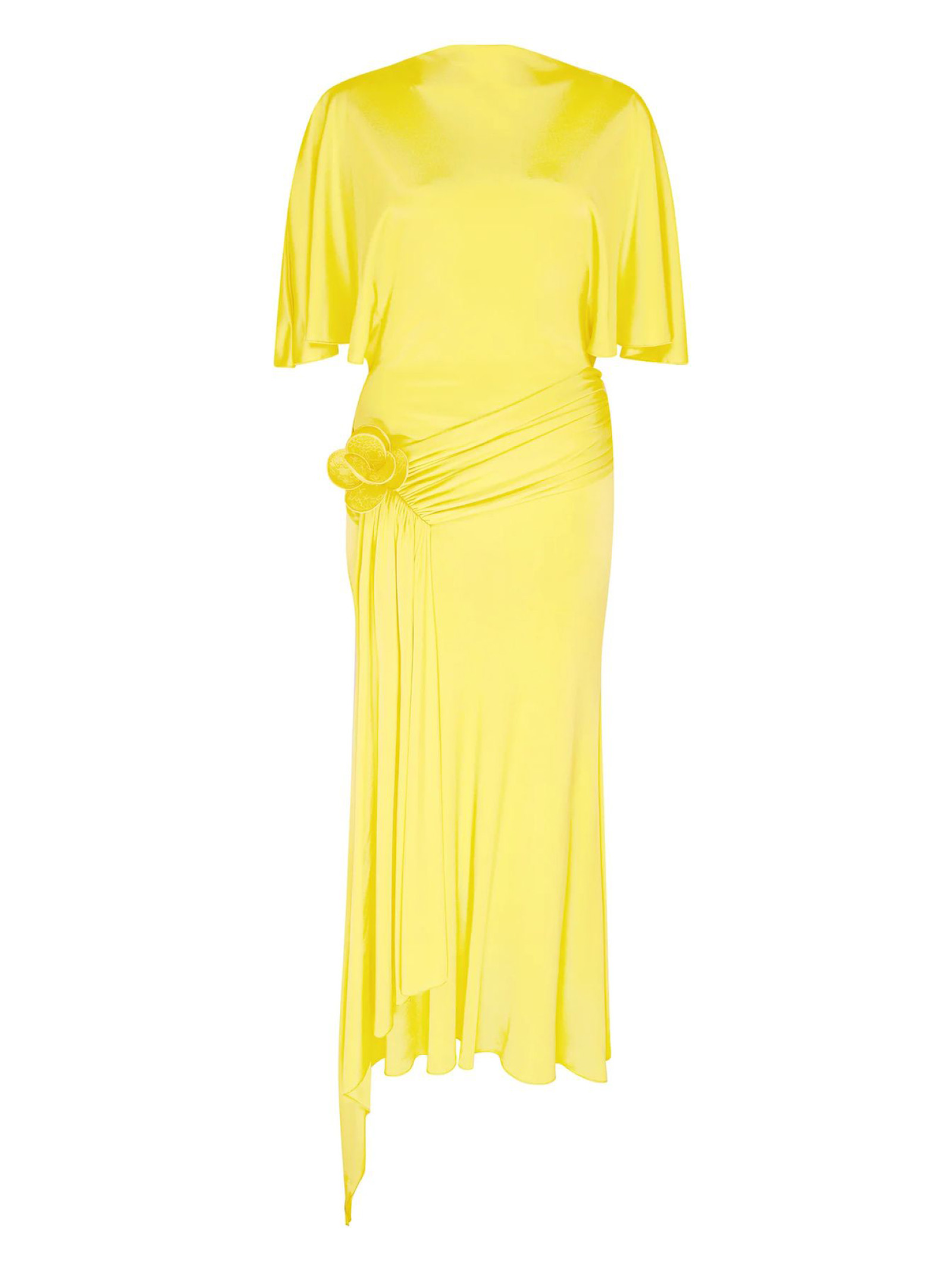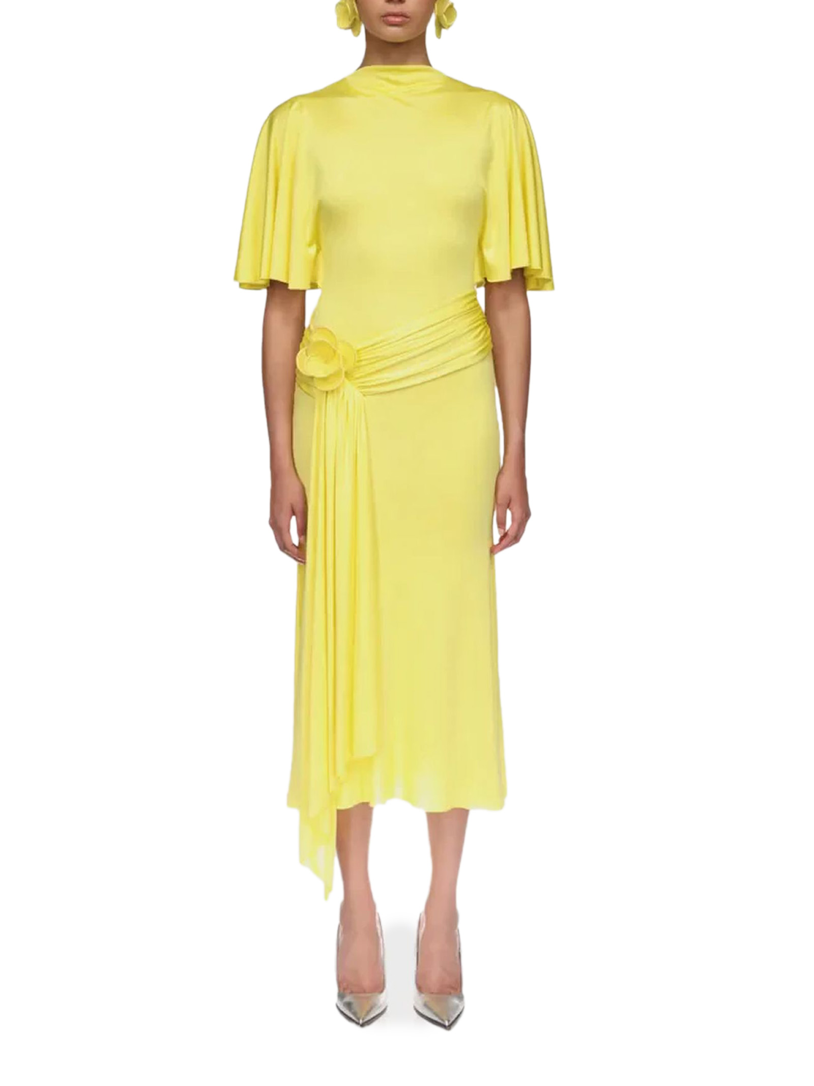 Abito midi in jersey giallo con maniche drappeggiate, ricami floreali in pizzo 3D, drappeggio sui fianchi e orlo a balze. Chiusura con zip sul retro.