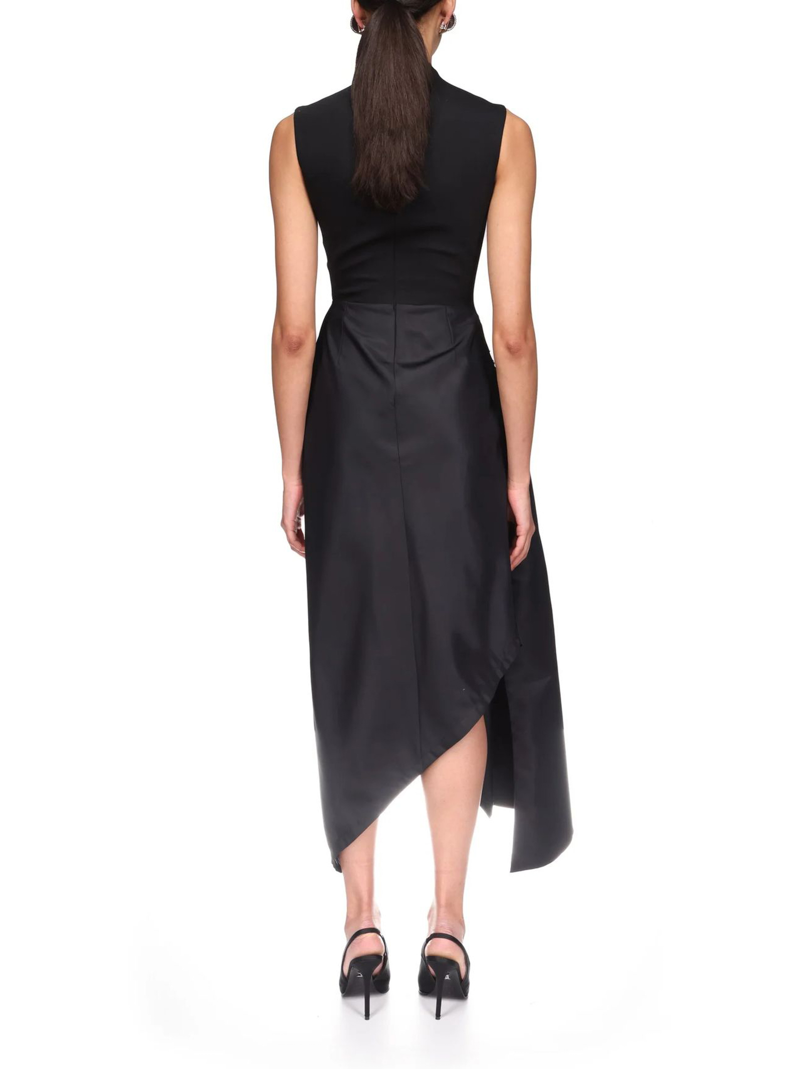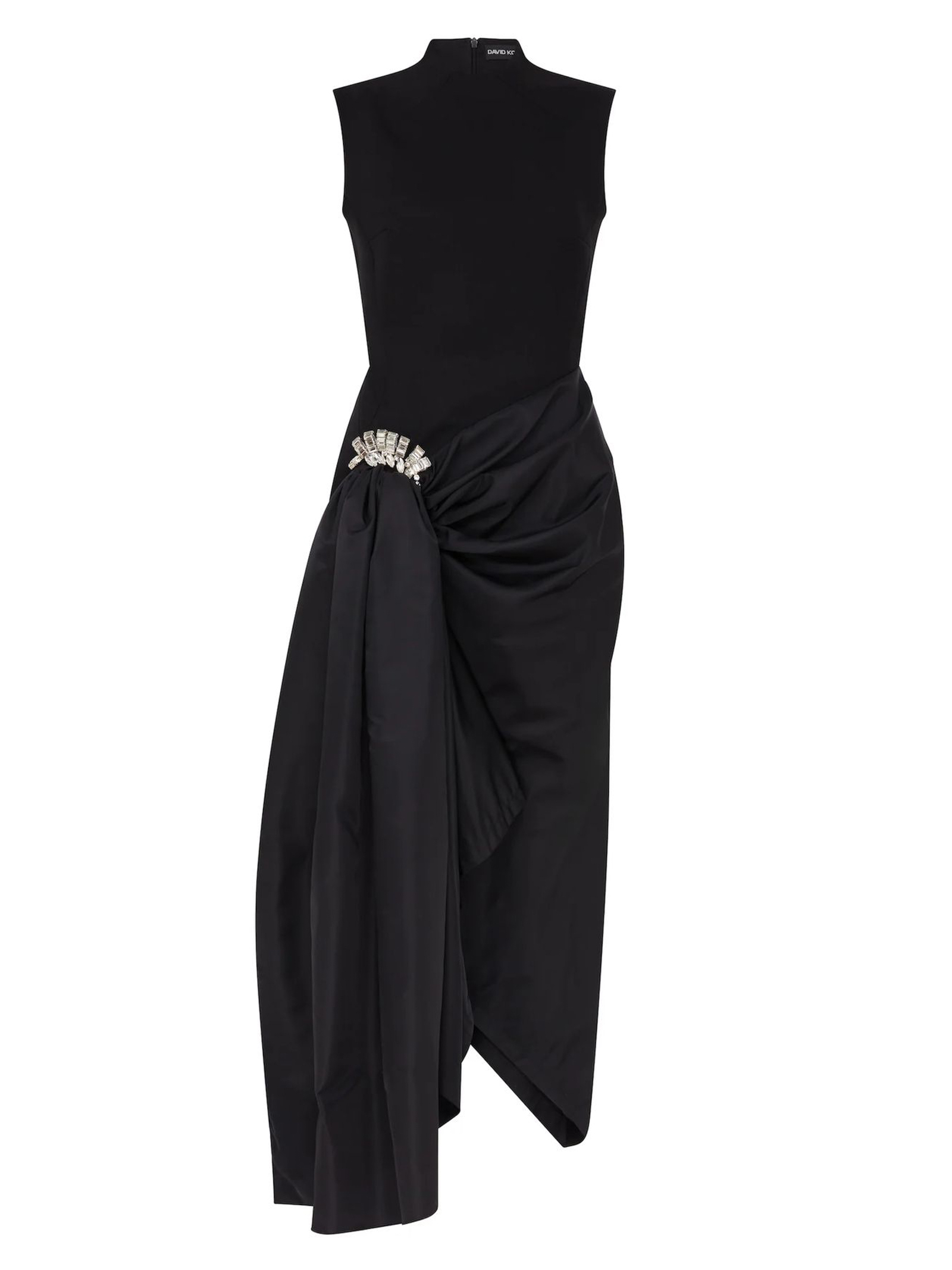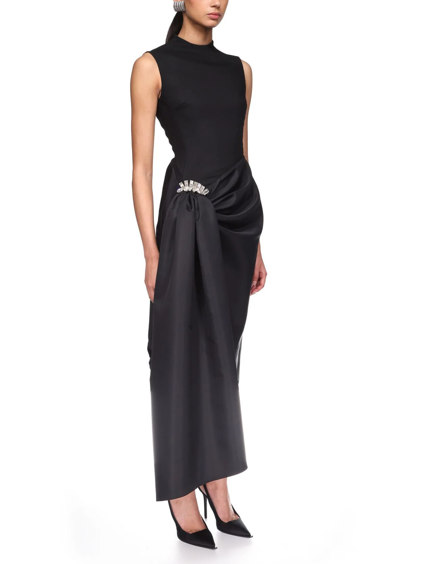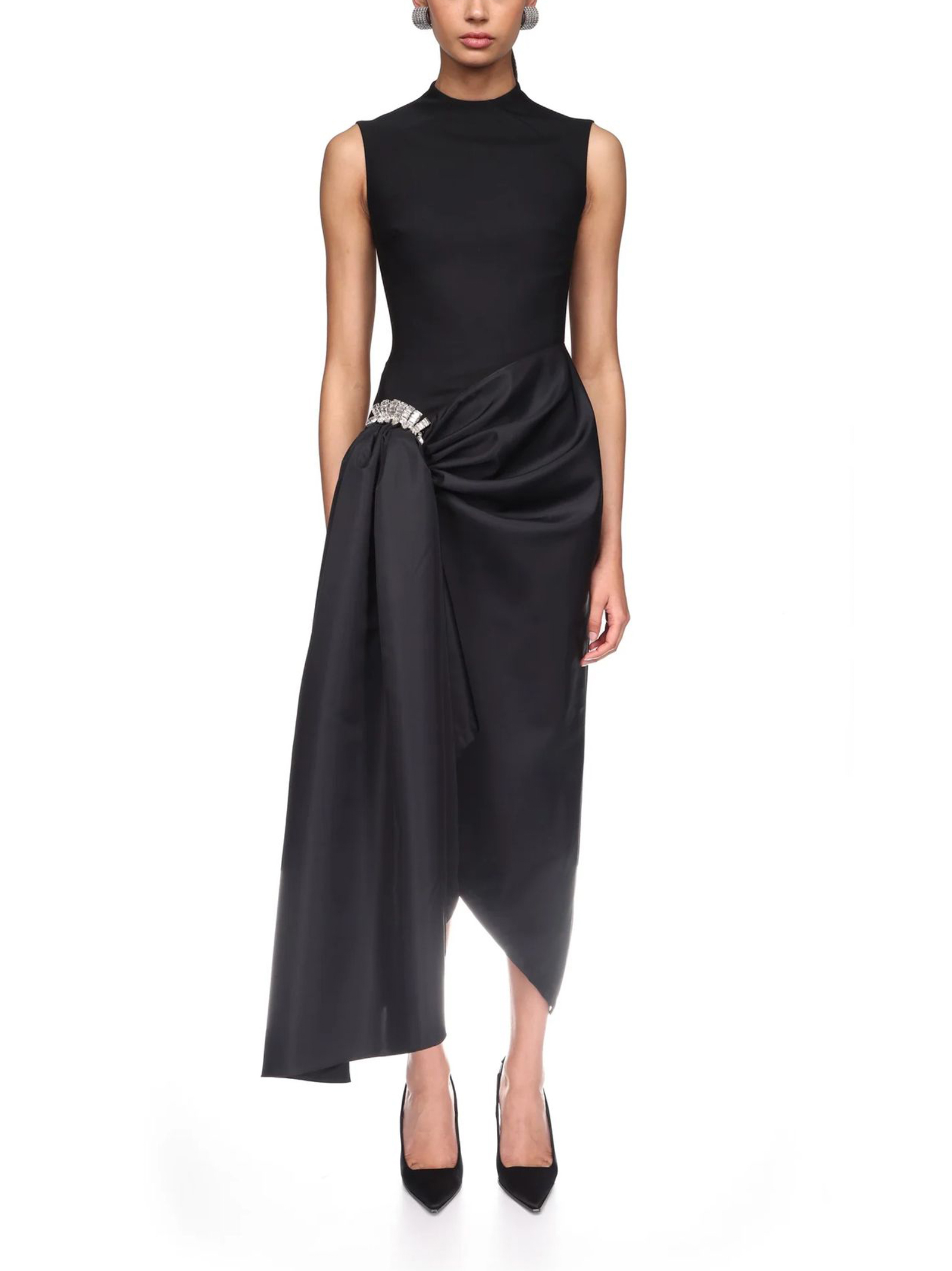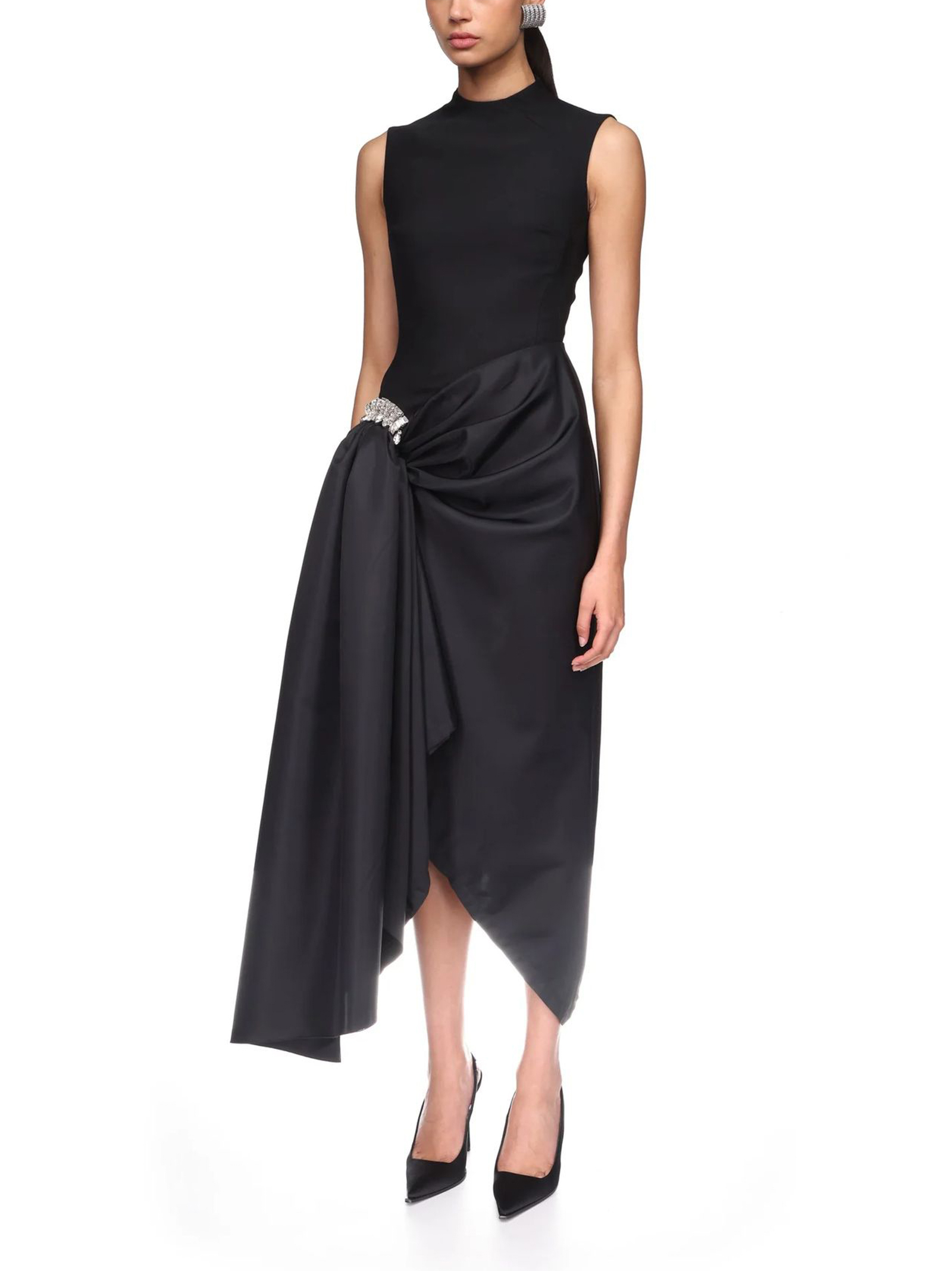 Abito midi con spilla di cristallo e orlo drappeggiato, in lana sartoriale nera, questo abito midi senza maniche presenta una gonna asimmetrica in nylon drappeggiata che si raccoglie sui fianchi con una spilla ricamata con cristalli argentati. Questo abito si chiude con una cerniera nascosta sul retro