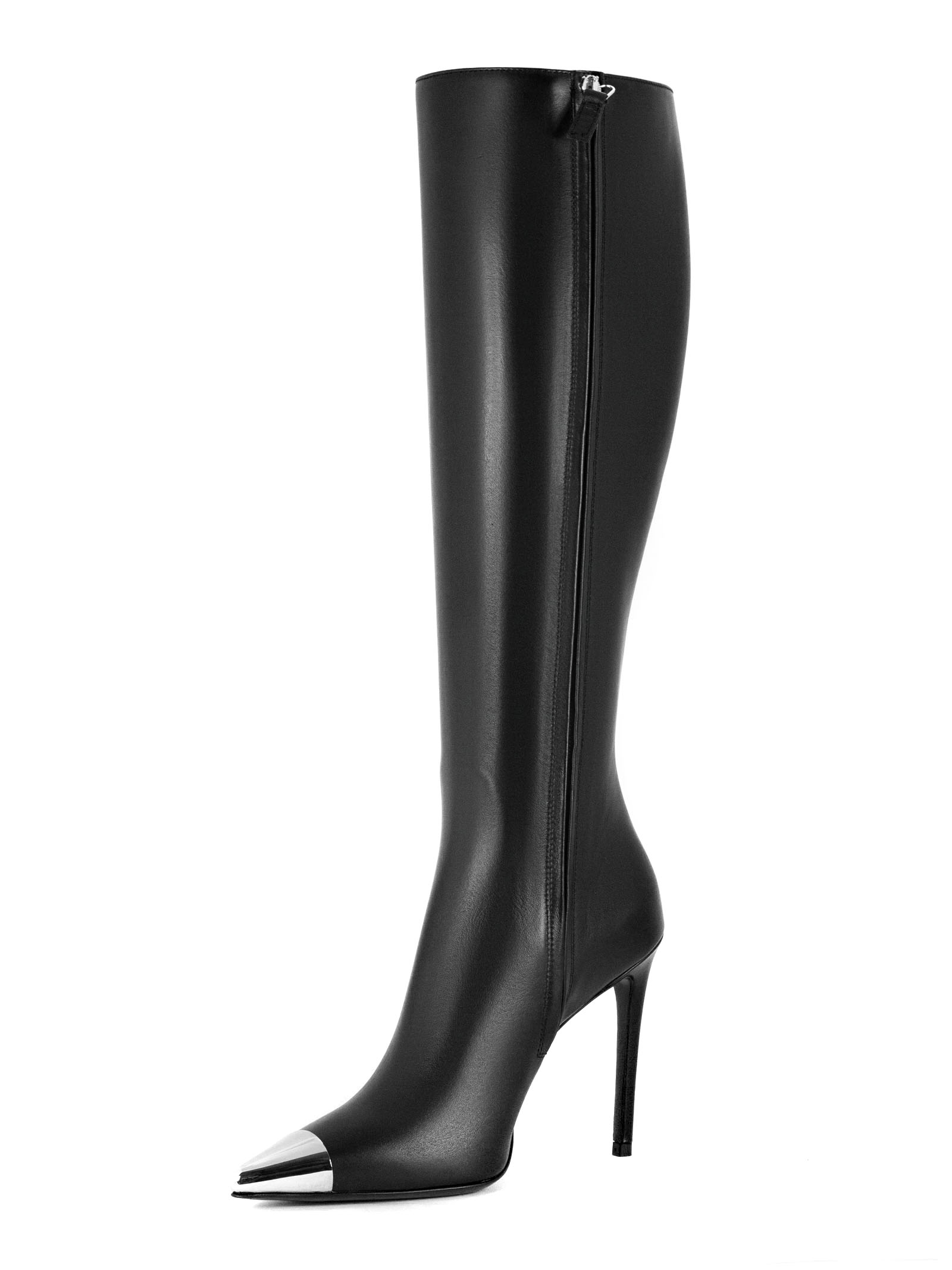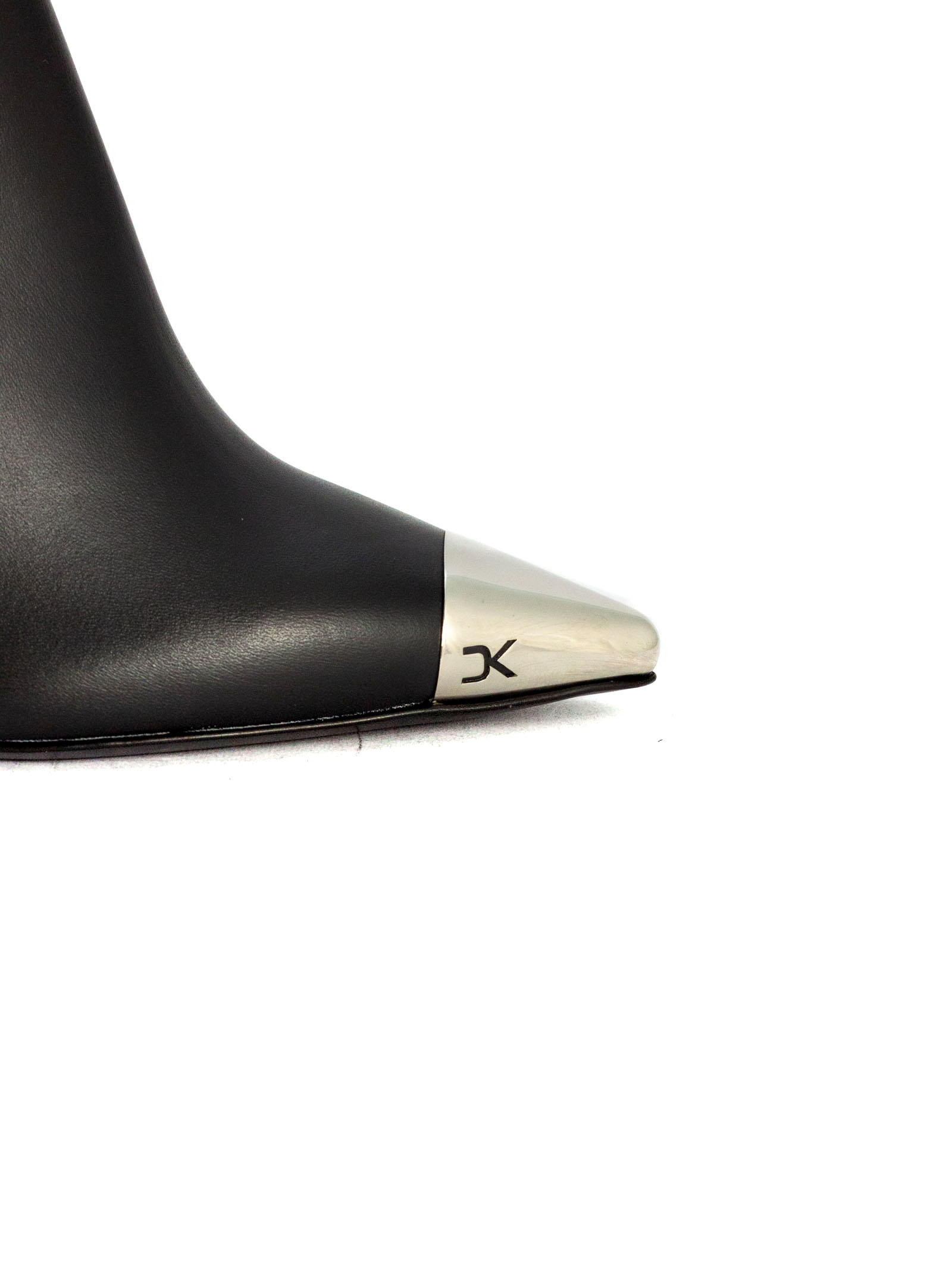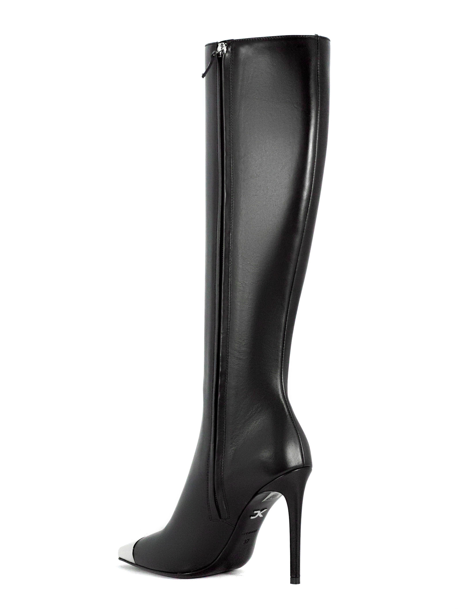 Stivali al ginocchio in pelle nappa nero, con tacco a spillo e caratteristico puntale DK in metallo argentato, altezza tacco 10cm