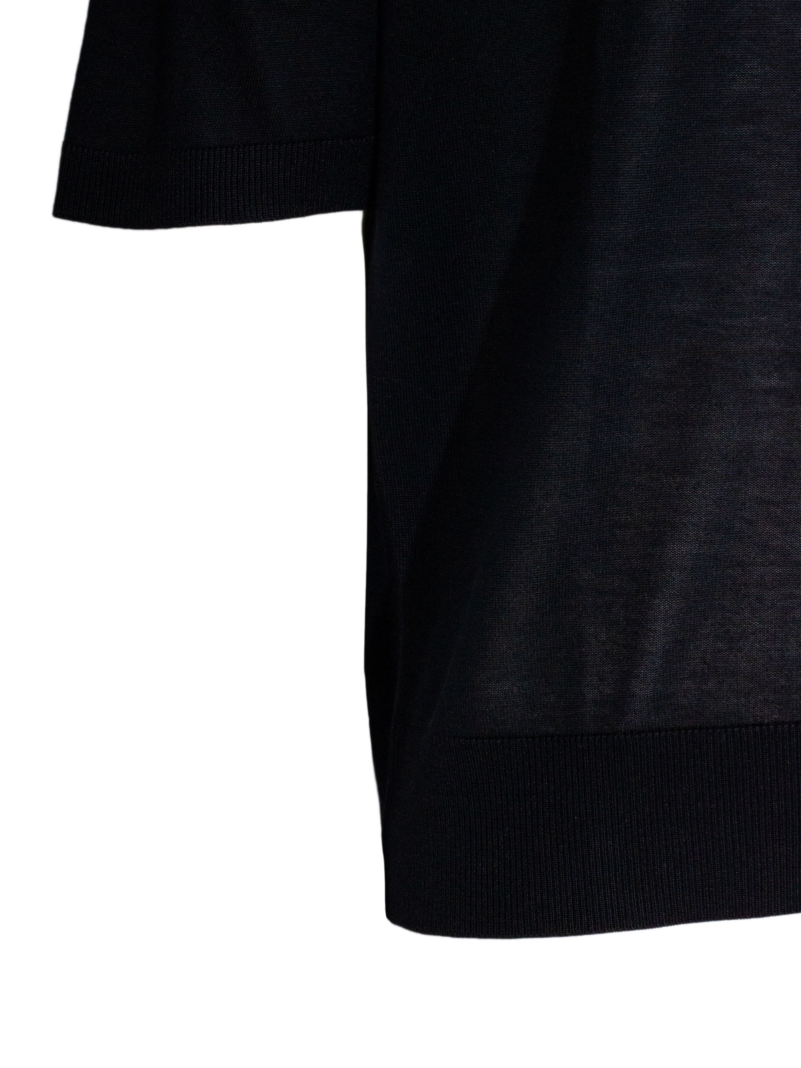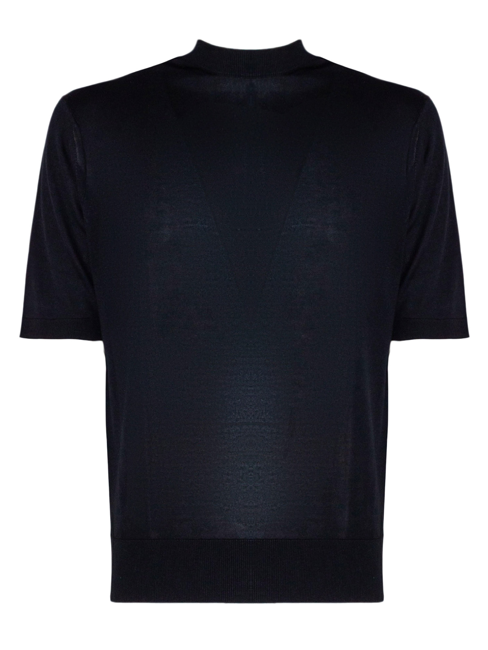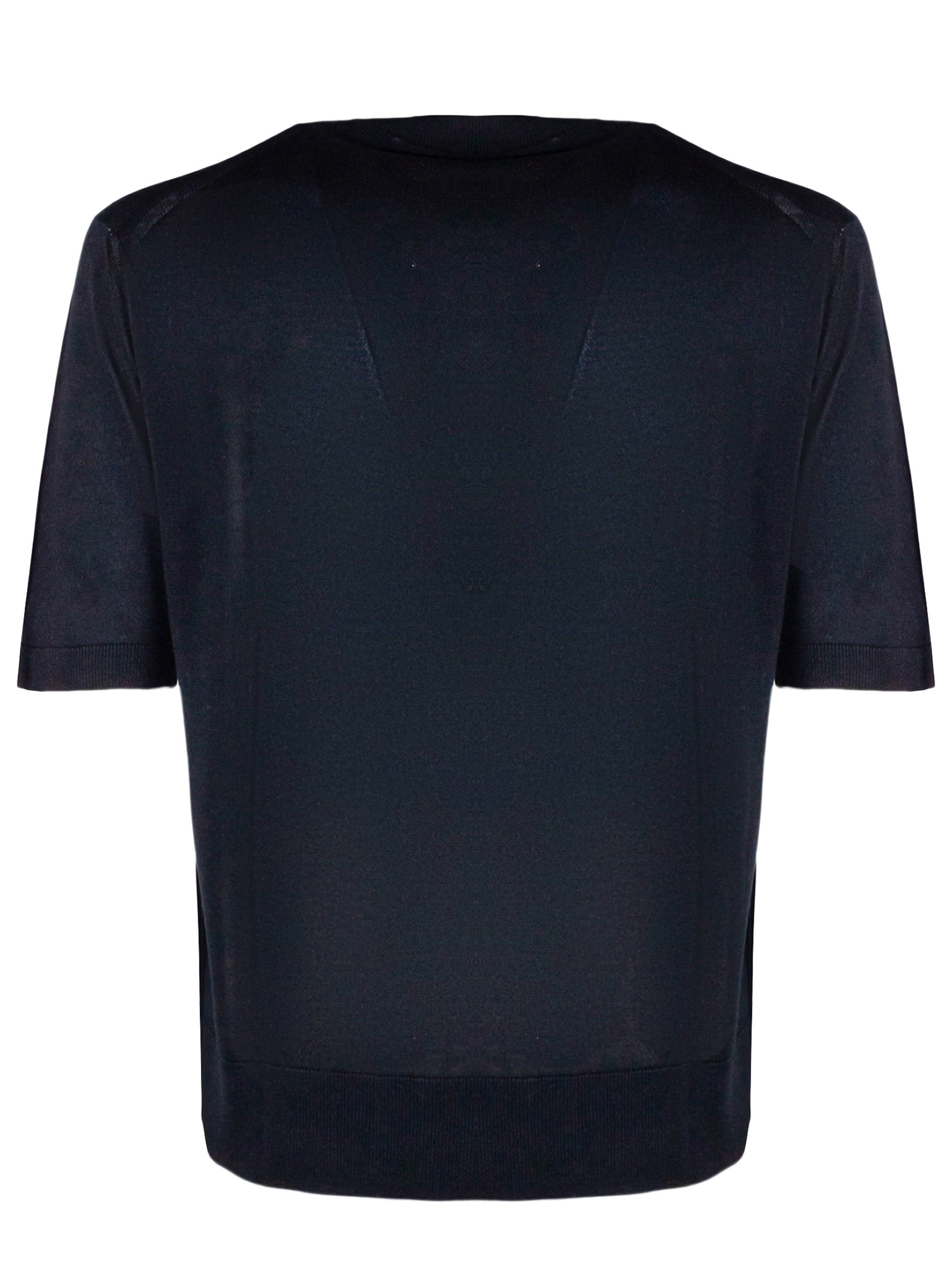 T-shirt in misto seta blu con girocollo, maniche corte, design a maglia, finiture a costine