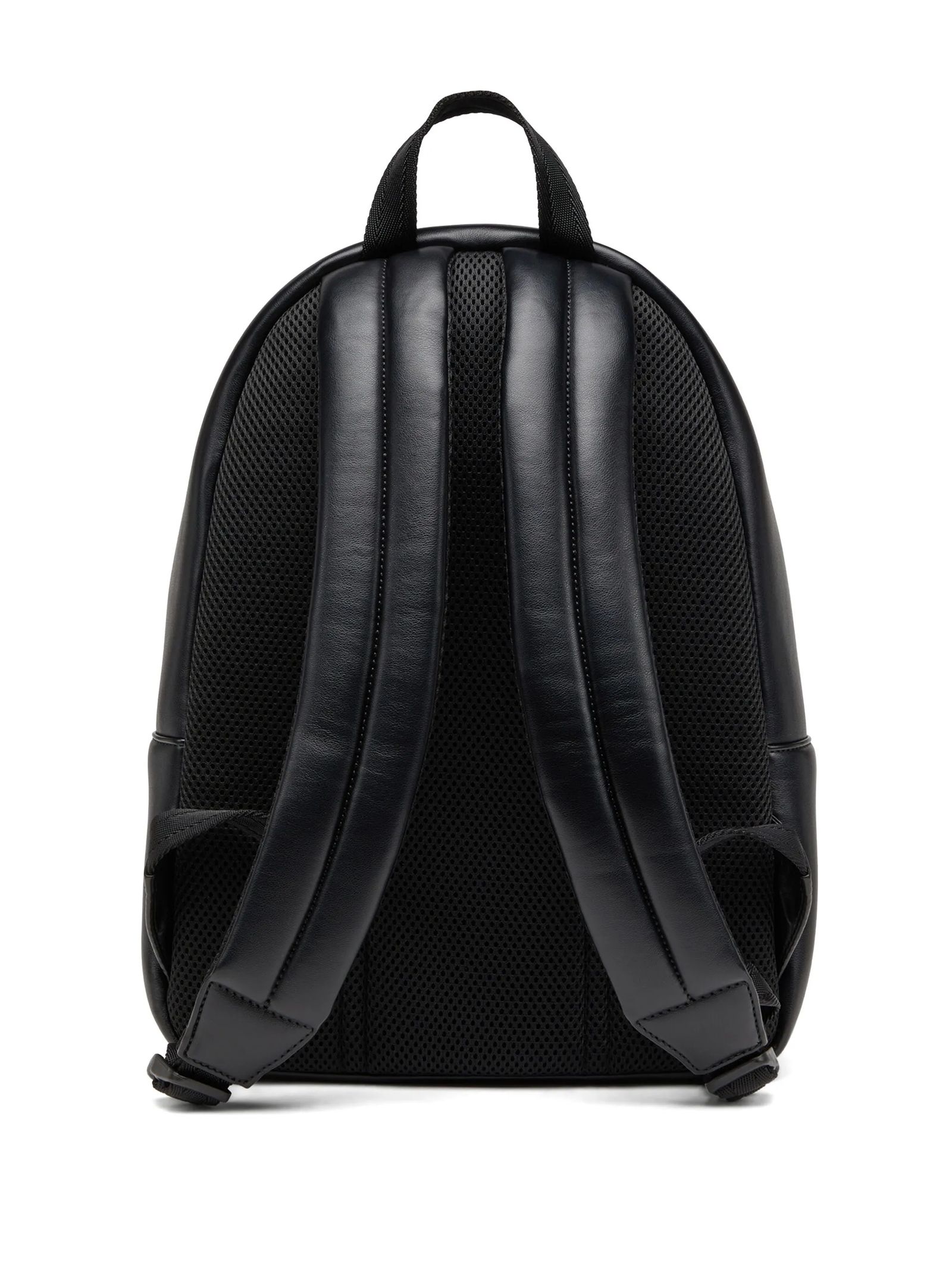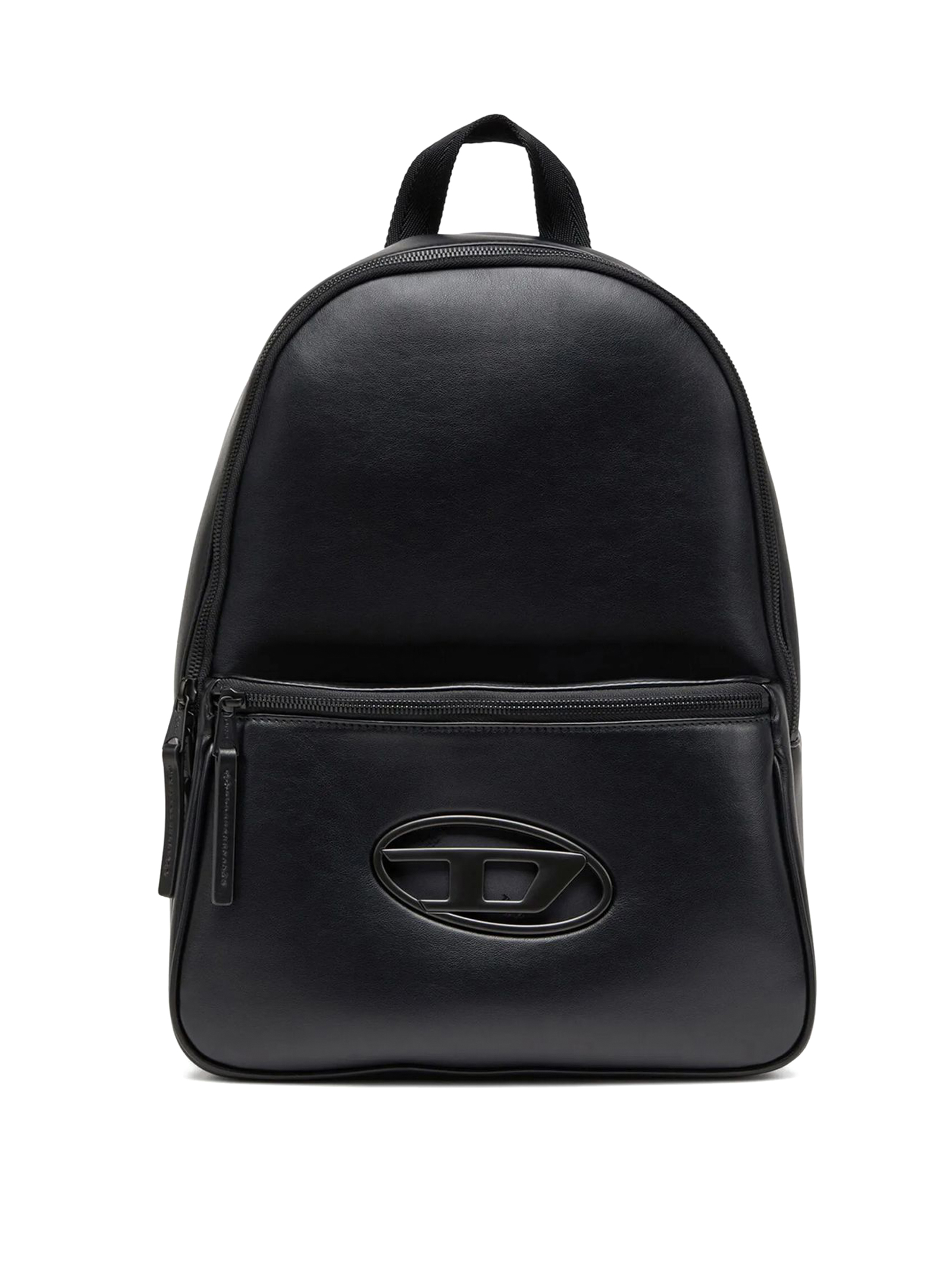 Zaino Holi-D medio nero, cuoio artificiale, grana liscia, chiusura superiore con zip, manico piatto, due tracolle regolabili imbottite, placca ovale con logo D, tasca frontale con zip, scomparto unico, fodera integrale, tasche interne con zip, Larghezza: