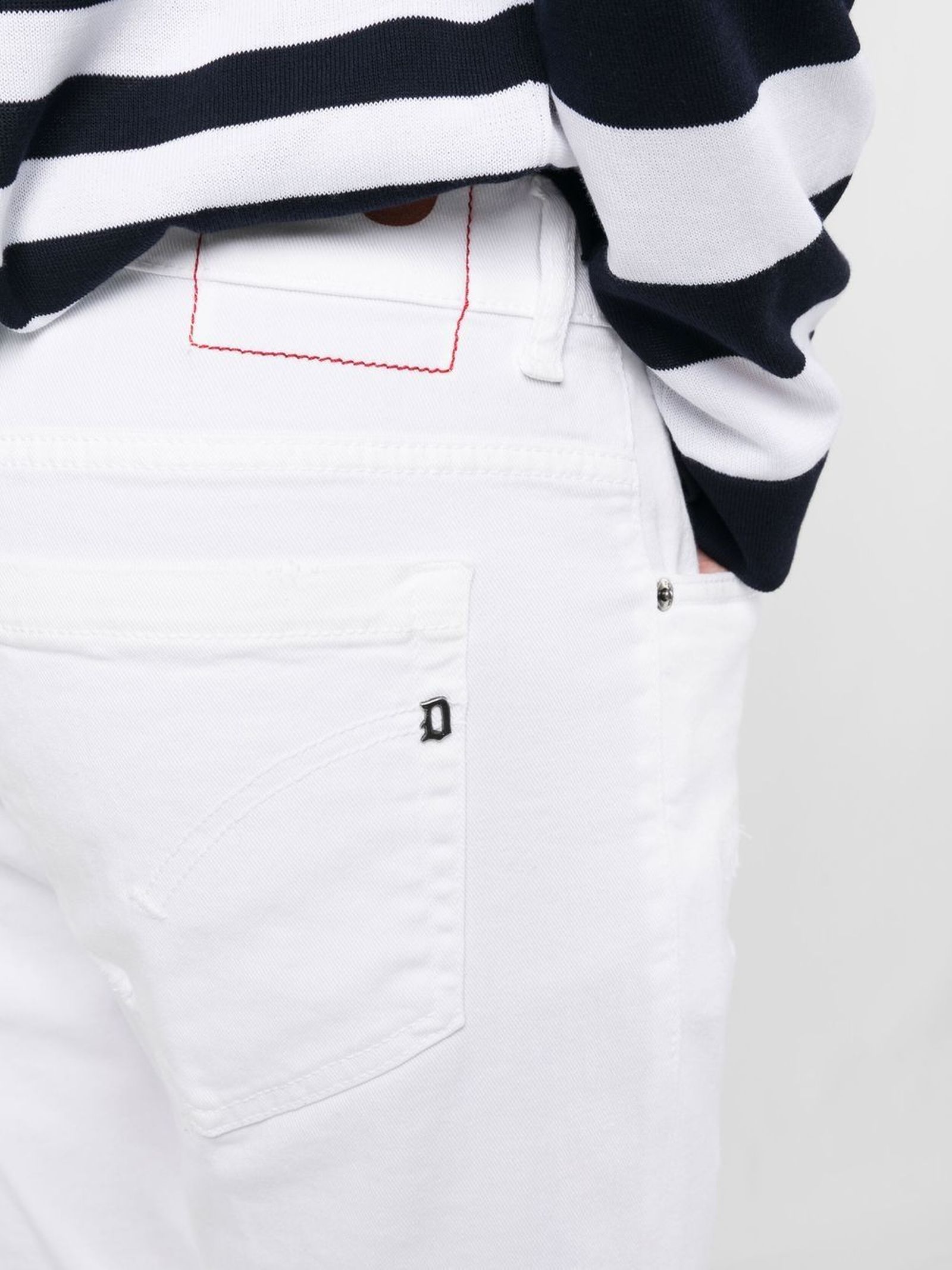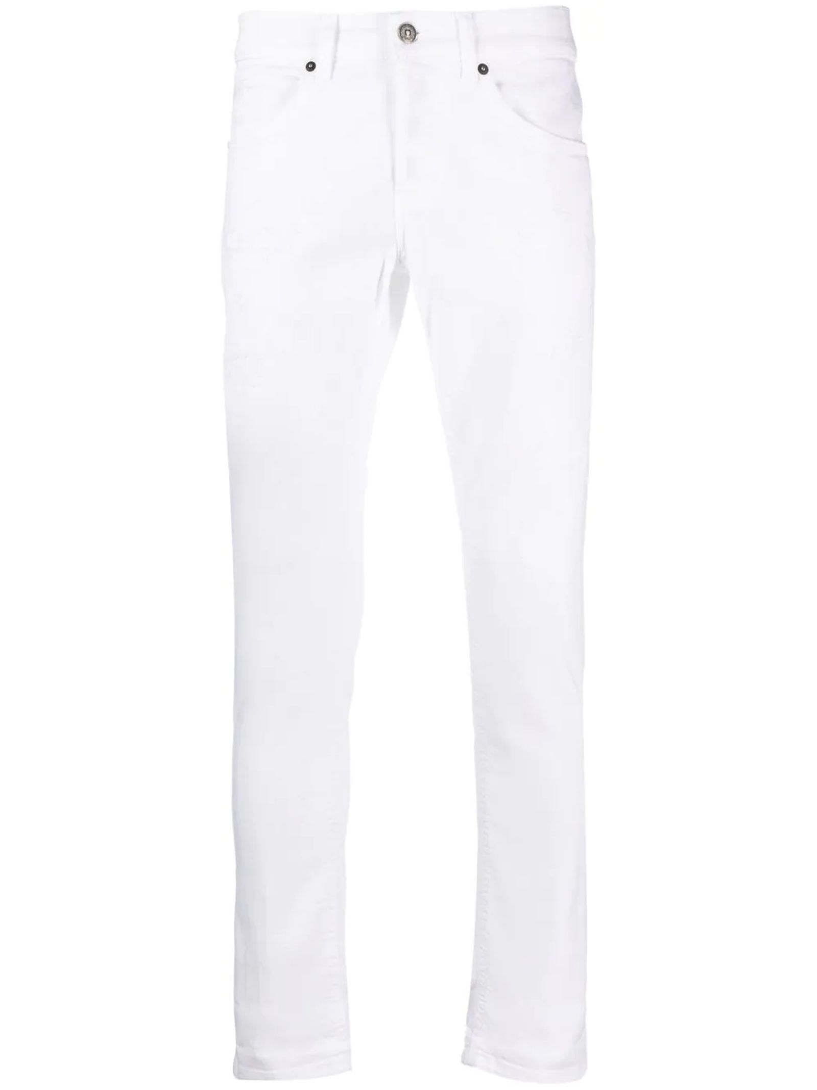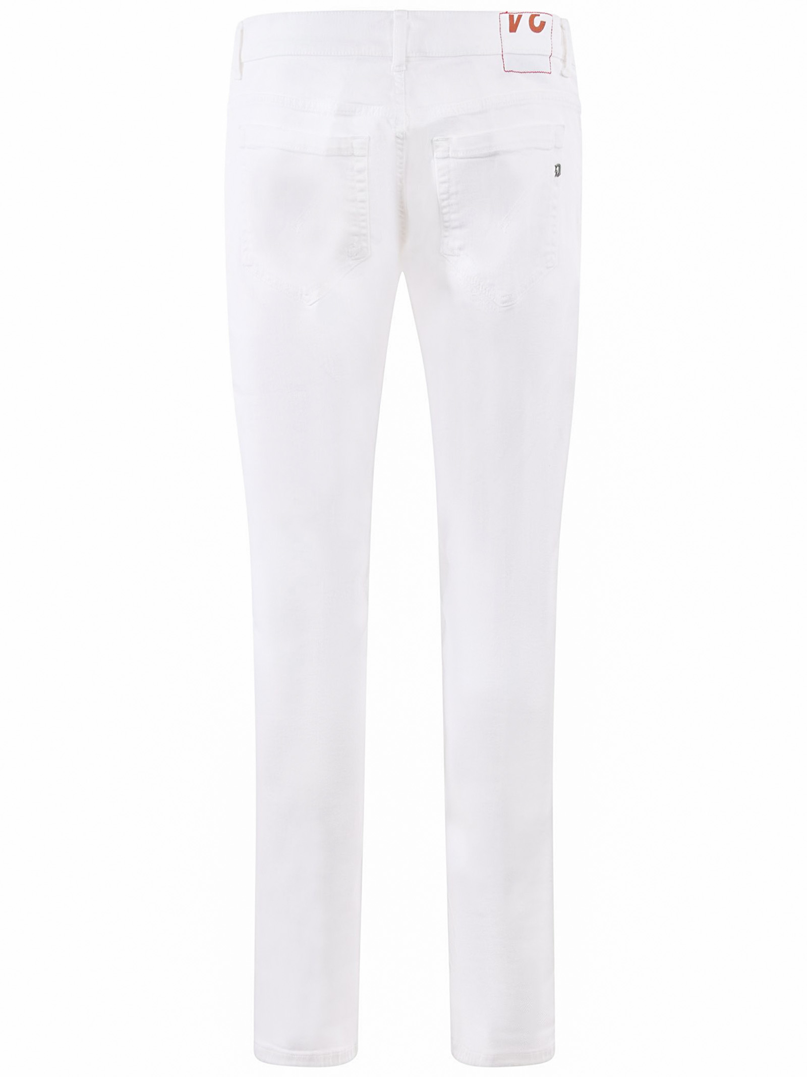 Jeans slim in cotone bianco, effetto vissuto, stampa con logo sul retro, chiusura frontale con bottoni e zip, passanti, design classico a cinque tasche, taglio slim e orlo dritto.