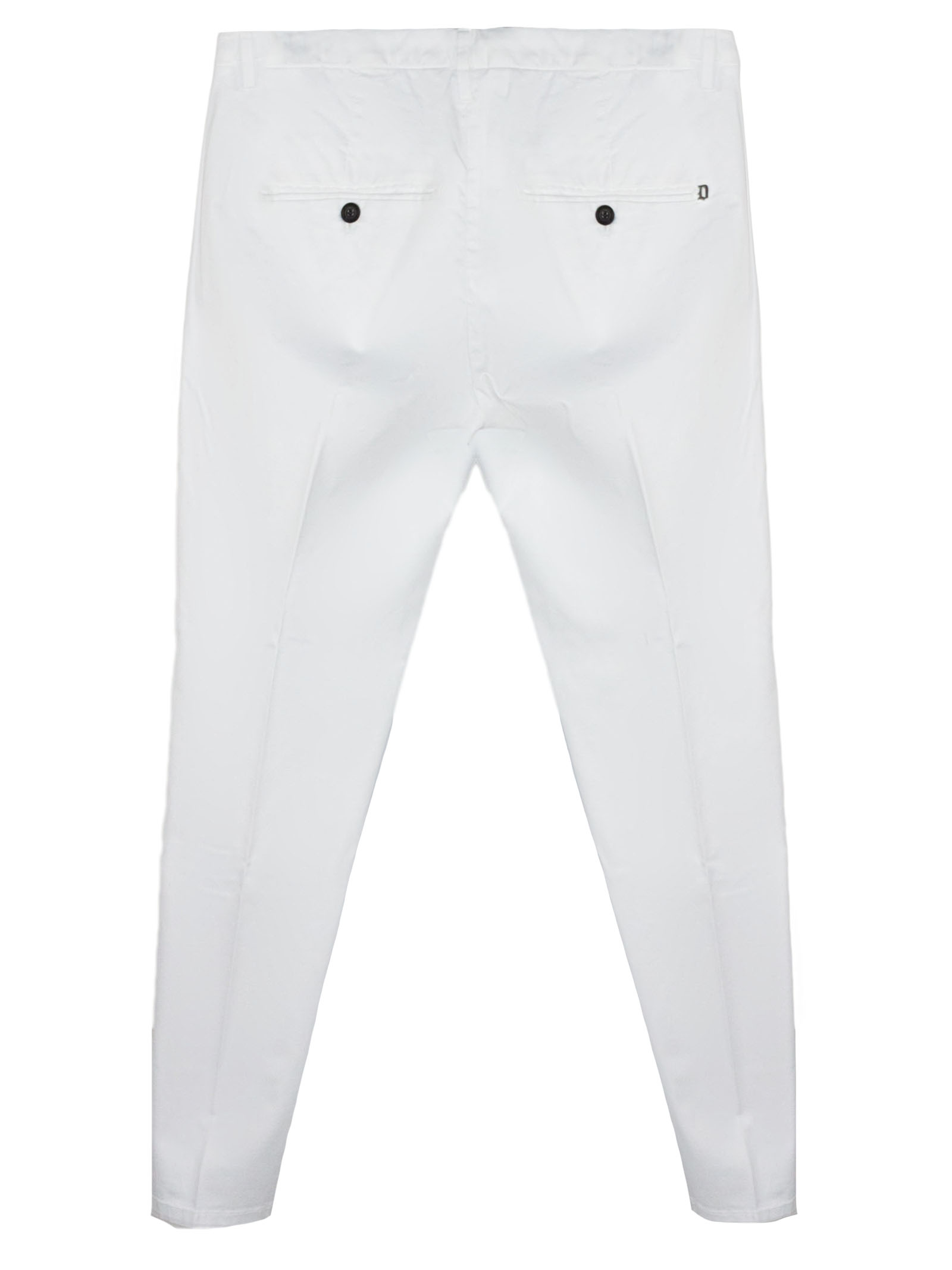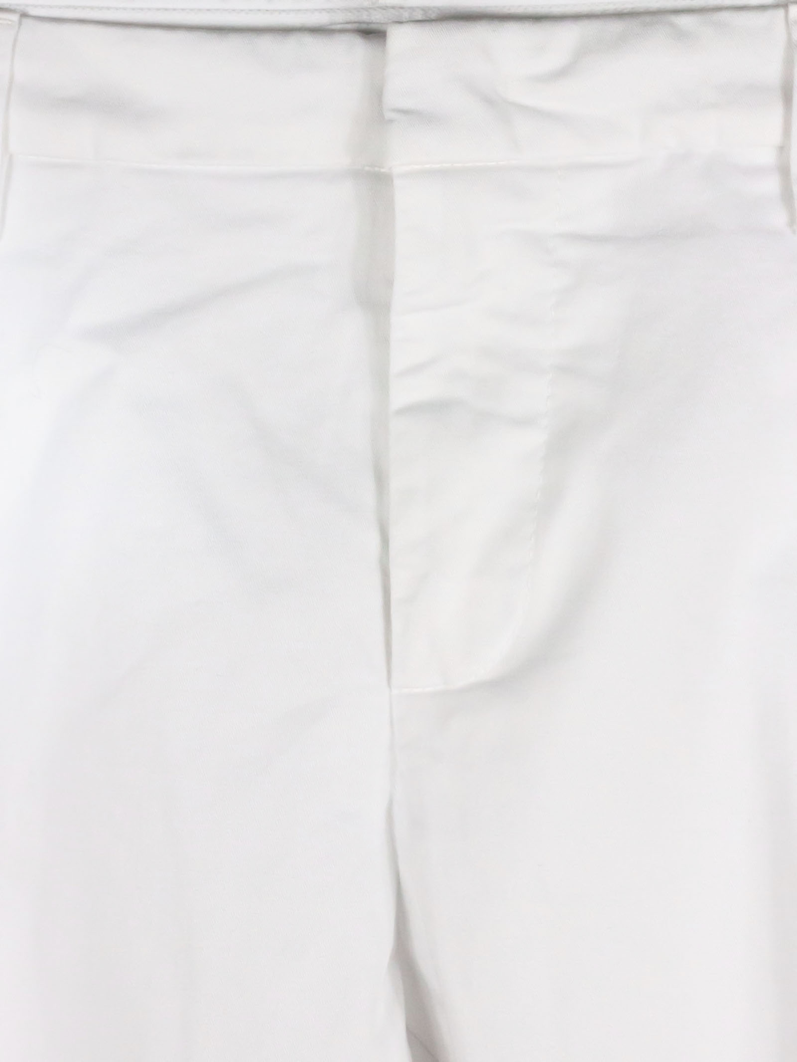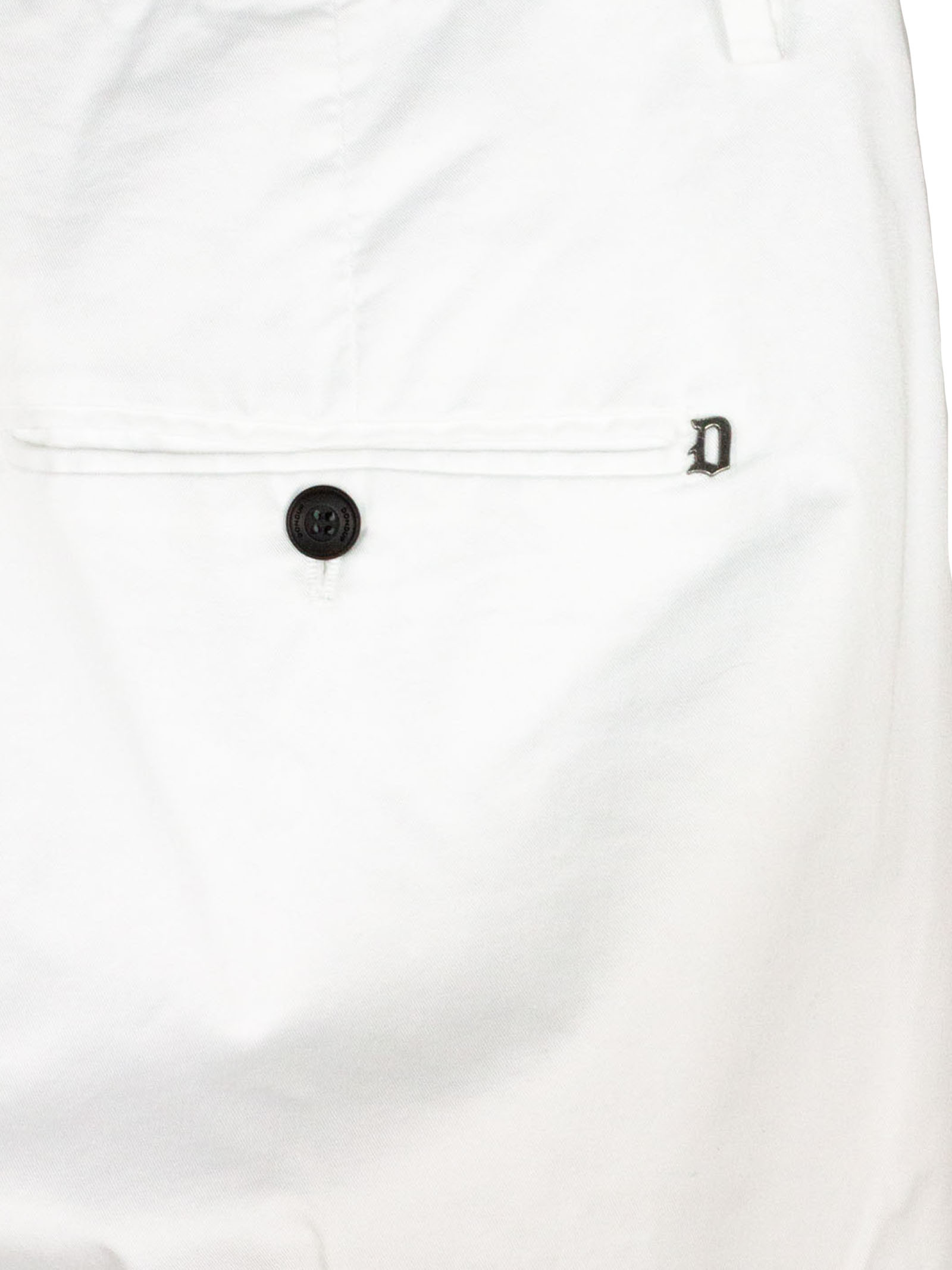 Pantalone in misto cotone bianco con passanti per cintura, tasche laterali a filetto, tasche sul retro con bottoni, chiusura frontale nascosta, dettaglio logo in metallo sul retro, vestibilità regolare
