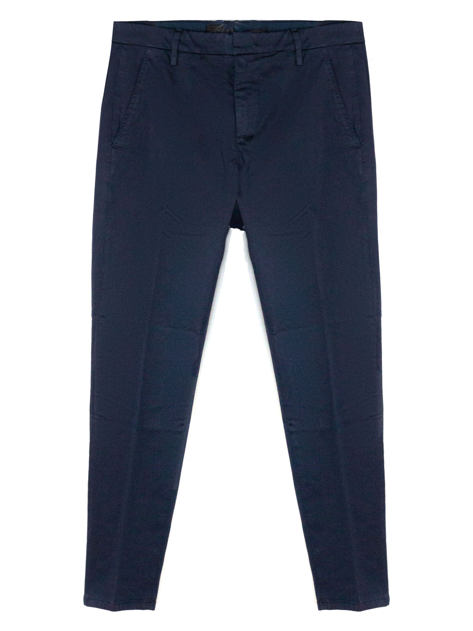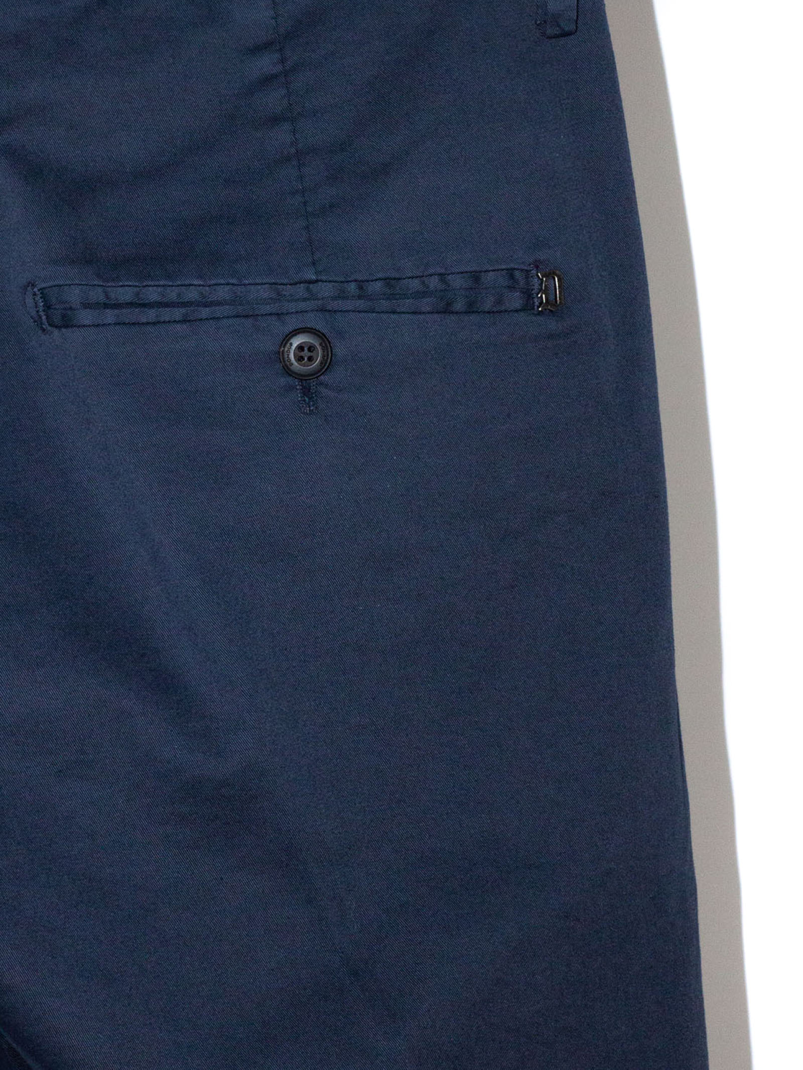 Pantalone in misto cotone blu con passanti per cintura, tasche laterali a filetto, tasche sul retro con bottoni, chiusura frontale nascosta, dettaglio logo in metallo sul retro, vestibilità regolare