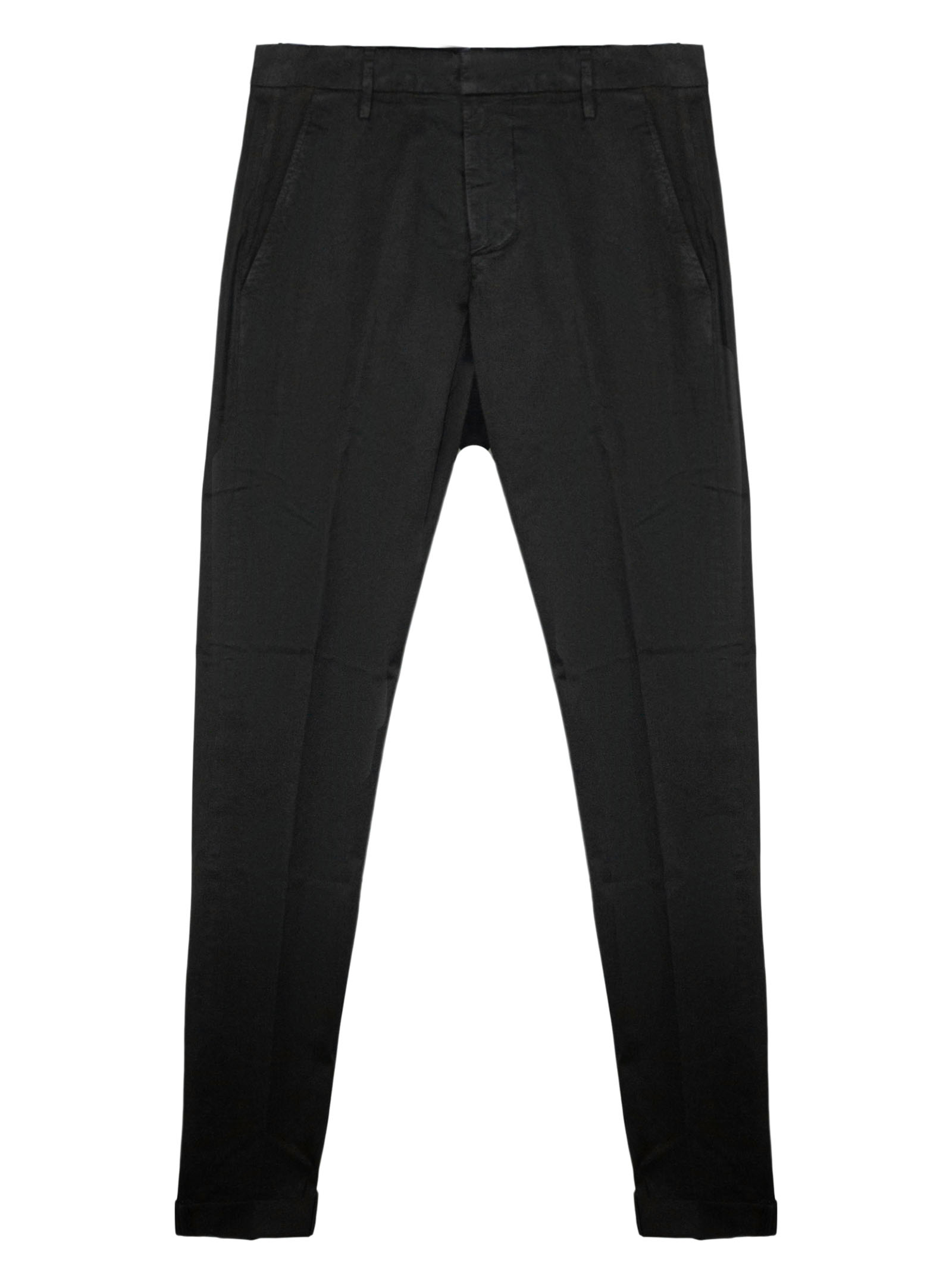 Pantalone in misto cotone nero con passanti per cintura, modello leggero, tasche laterali a filetto, tasche sul retro con bottoni, chiusura frontale nascosta, dettaglio logo in metallo sul retro