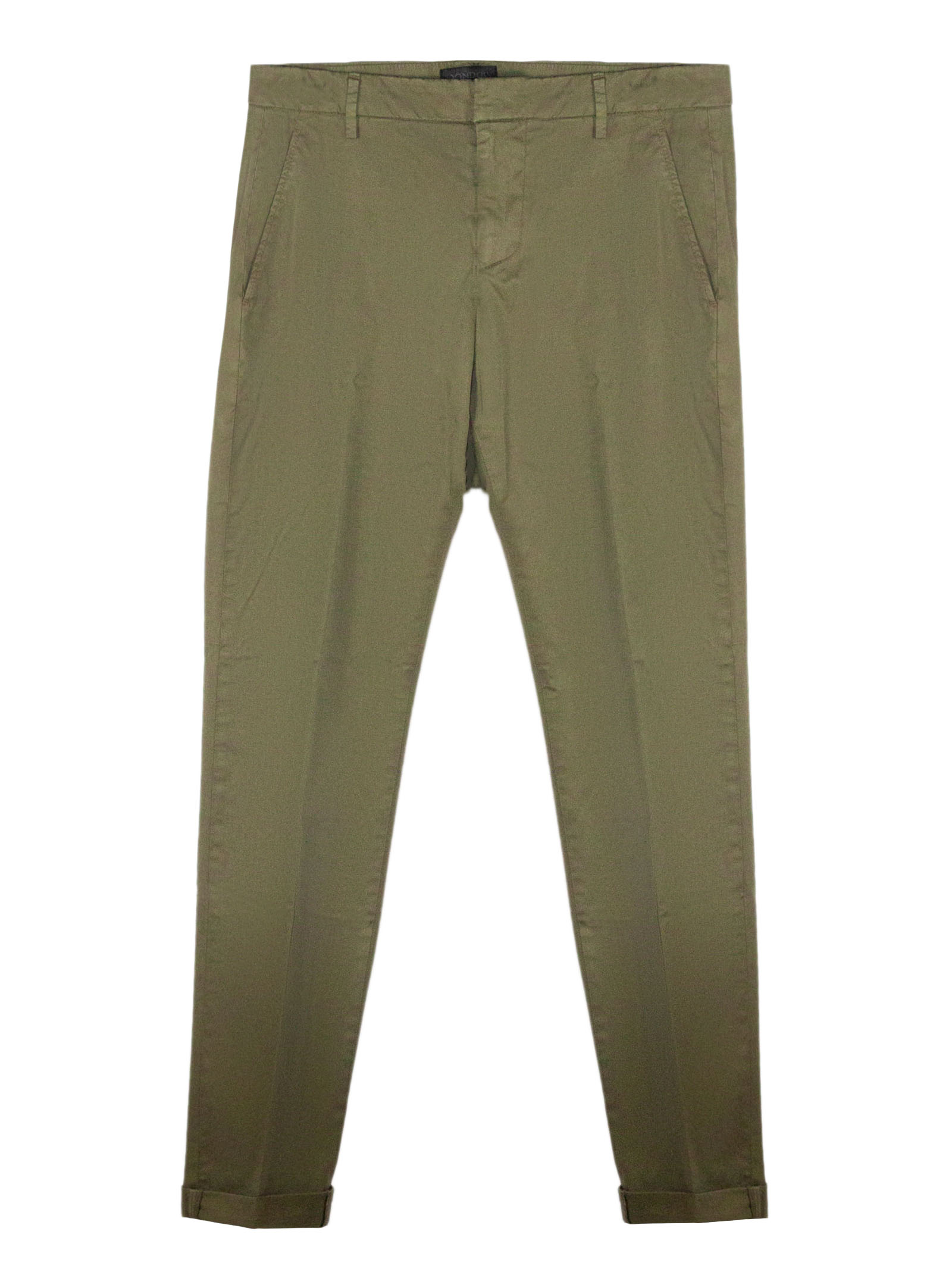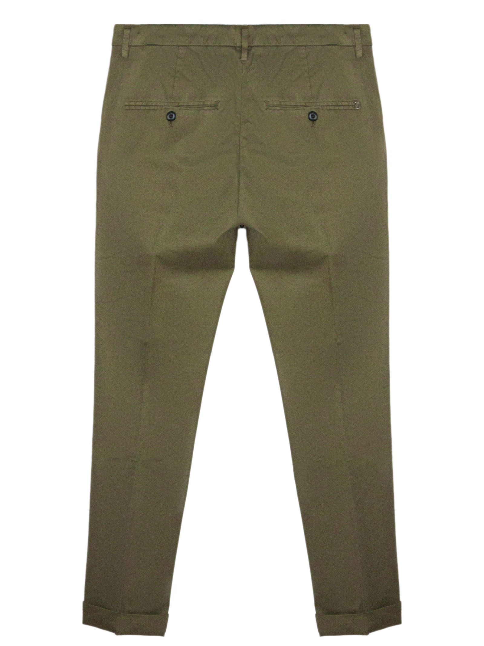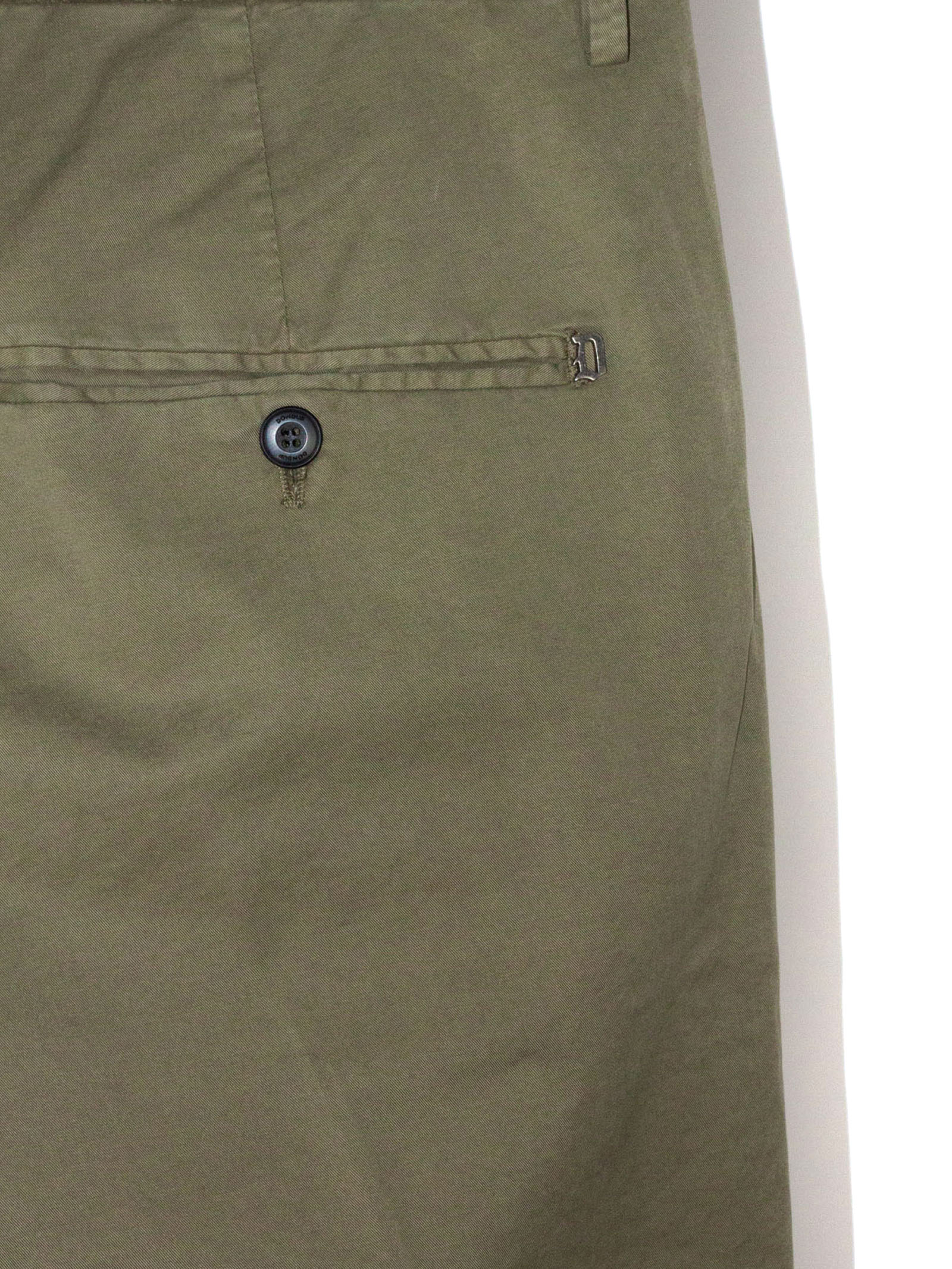 Pantalone in misto cotone verde con passanti per cintura, modello leggero, tasche laterali a filetto, tasche sul retro con bottoni, chiusura frontale nascosta, dettaglio logo in metallo sul retro