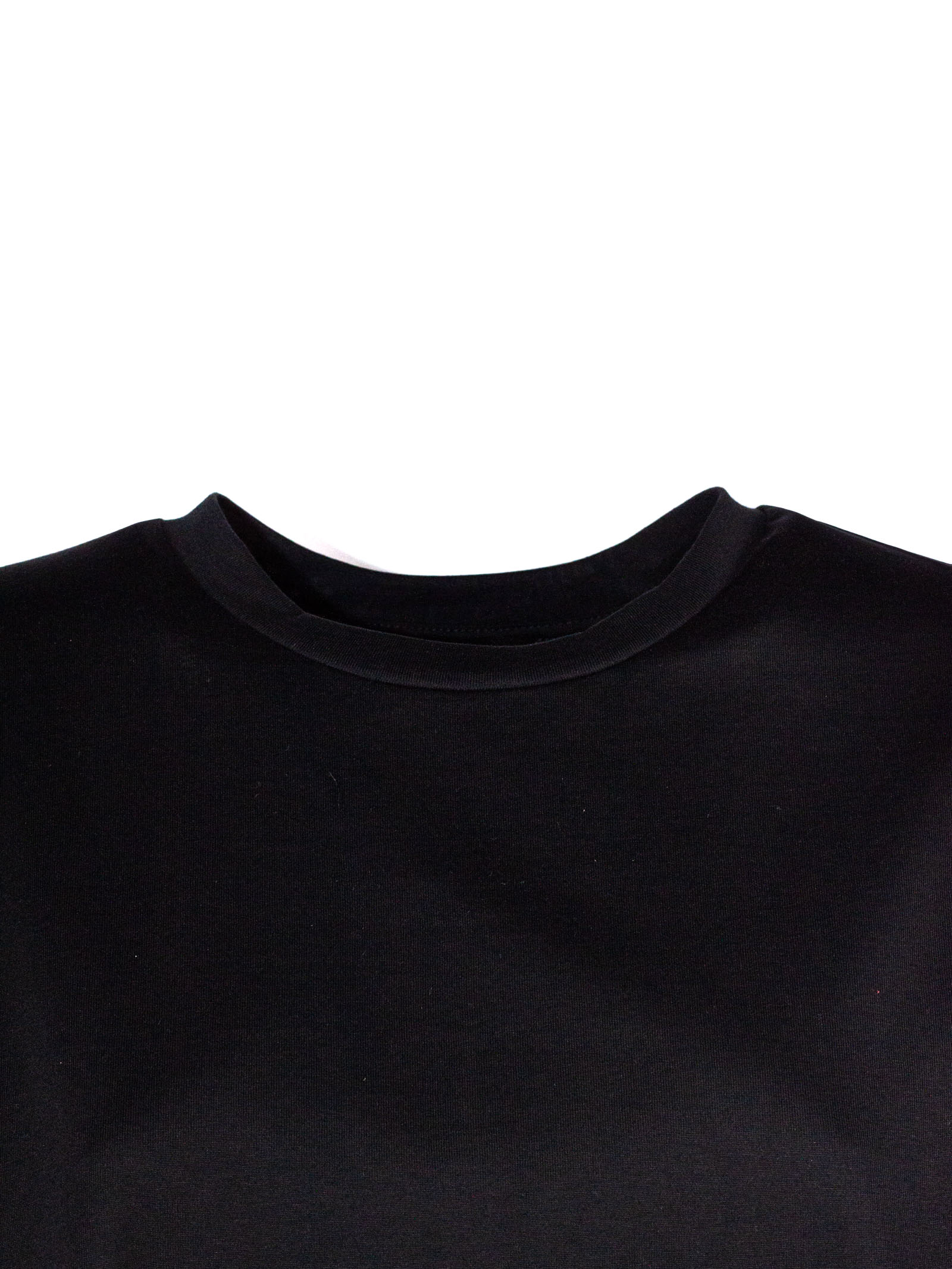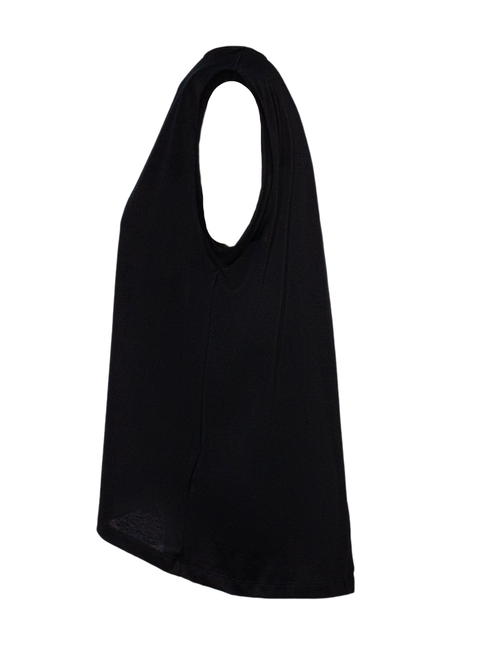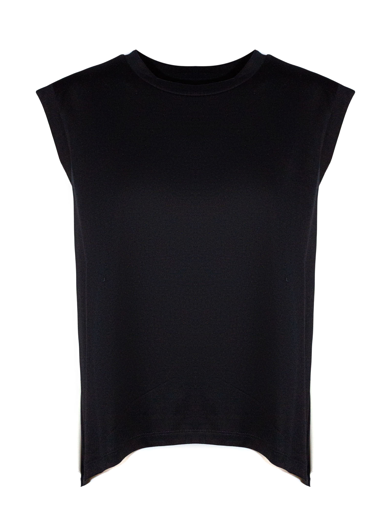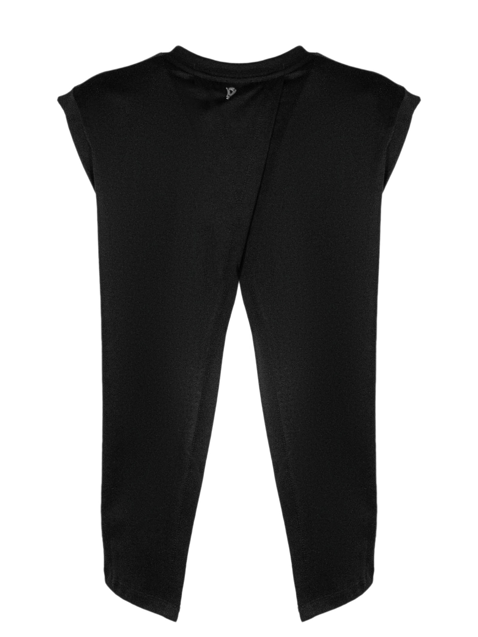 T-shirt in cotone nero con girocollo, senza maniche, spalla ampia, dettaglio apertura sul retro, logo in metallo sul retro