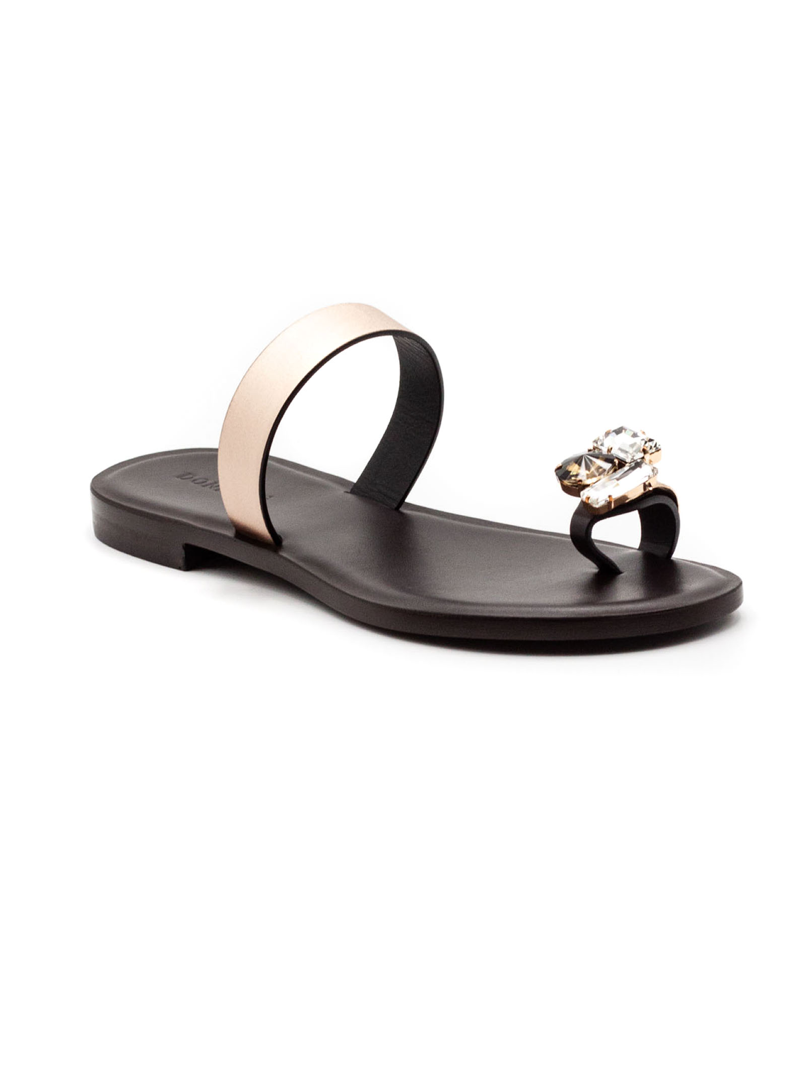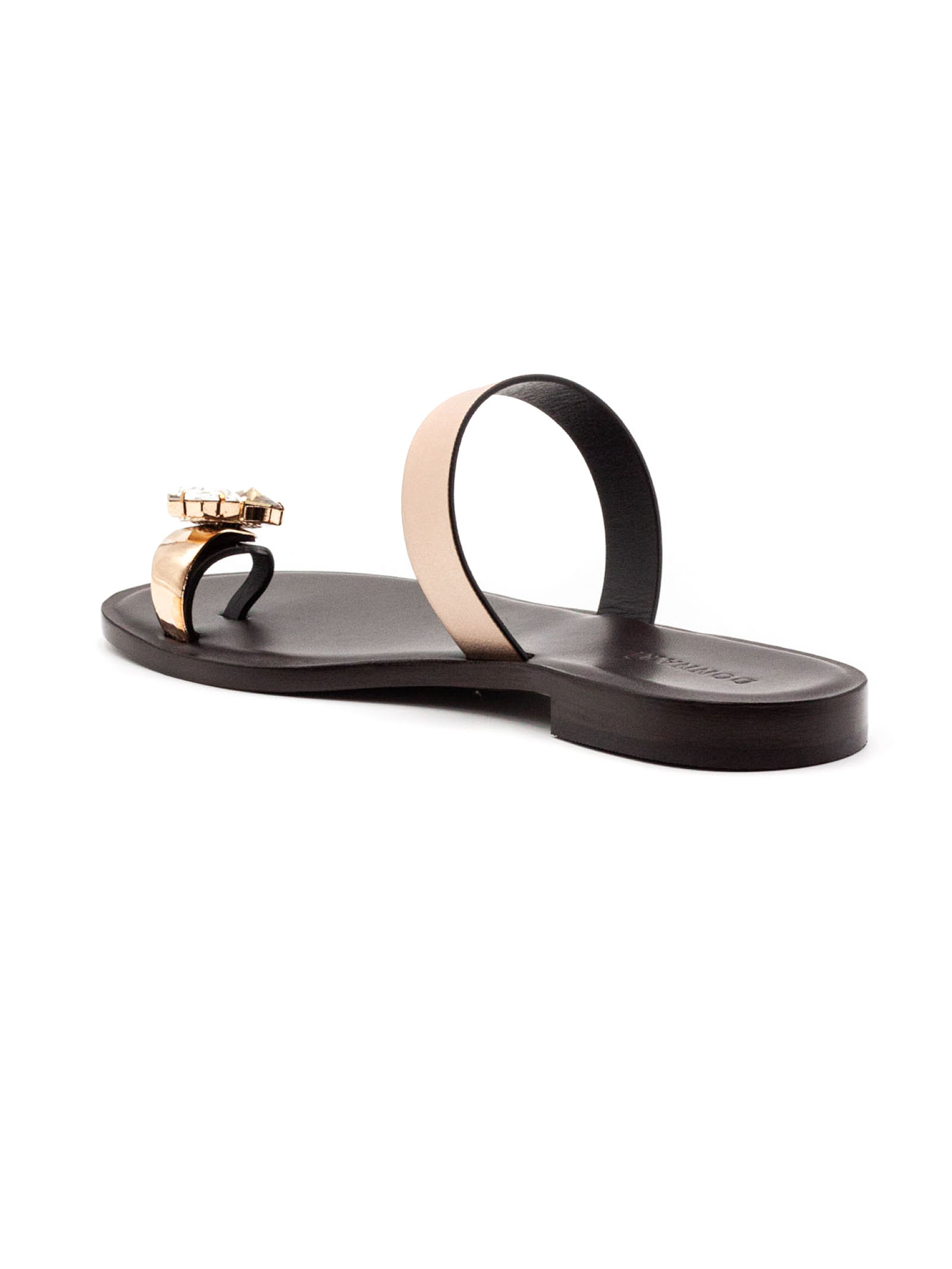Sandalo in cuoio marrone con dettaglio fascia in pelle metallizzata color oro, dettaglio gioiello, suola in cuoio con logo