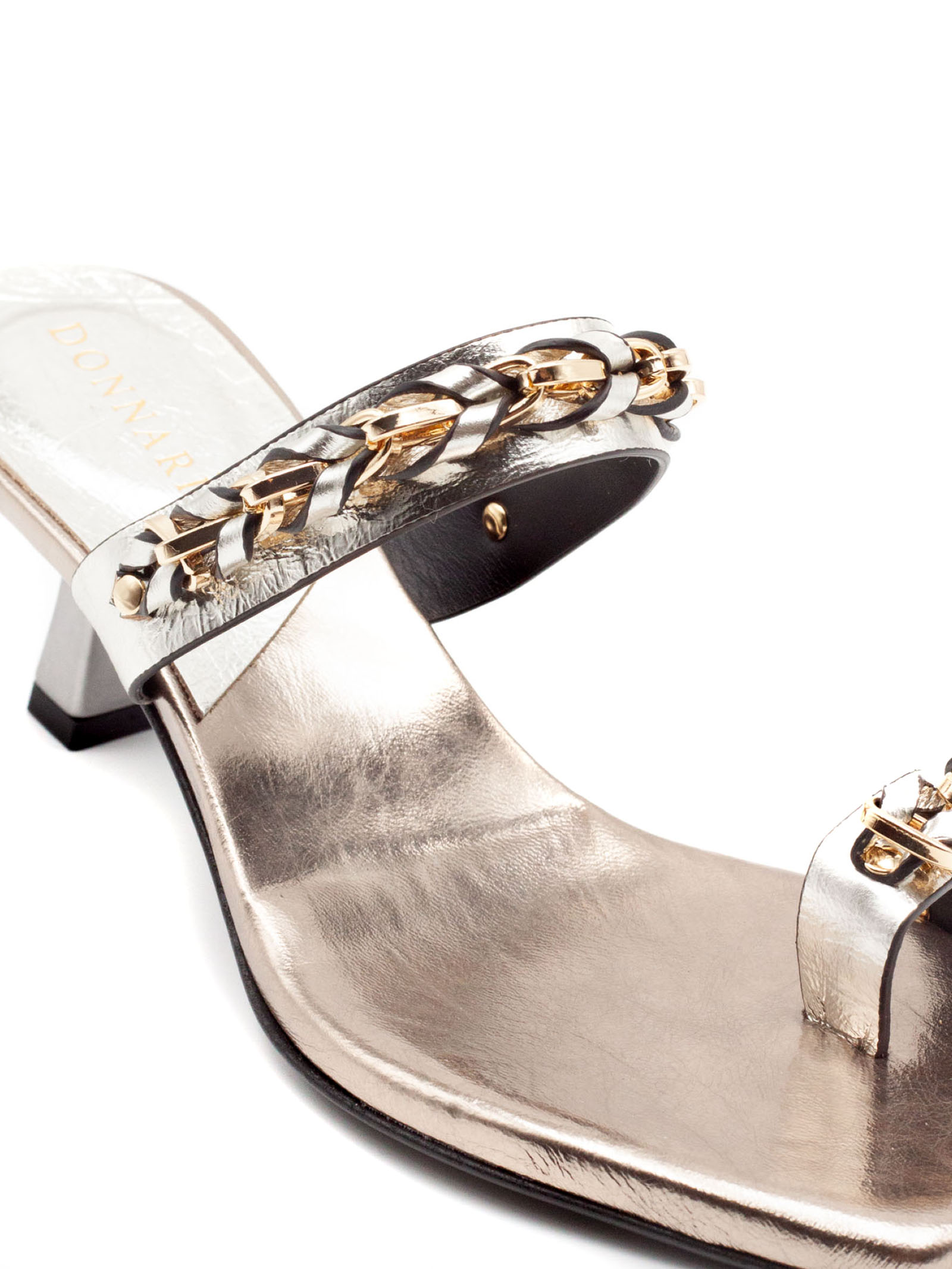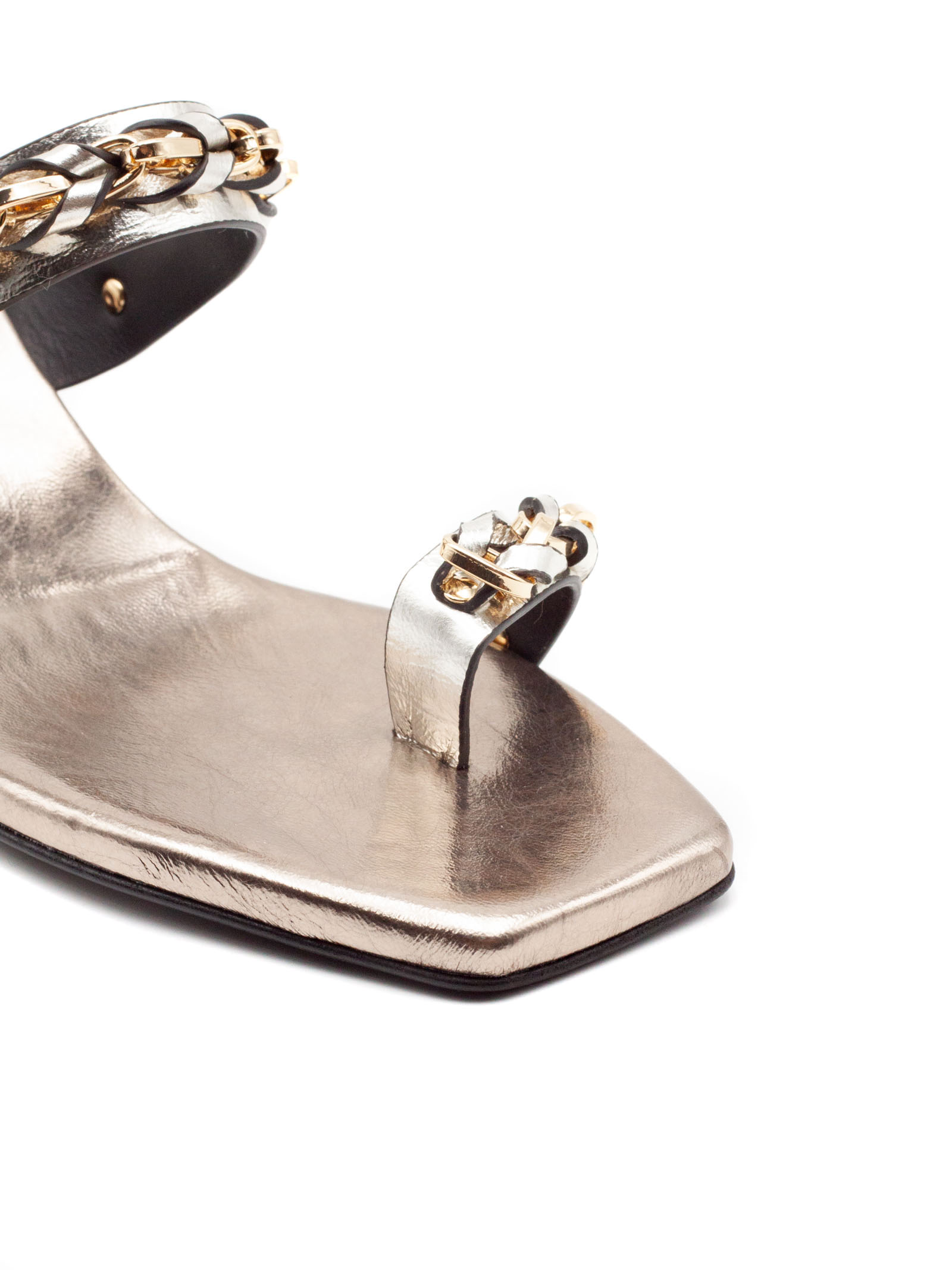 Sandalo mule in pelle laminata platino con fascia anteriore e cinturino con catena metallica dorata, punta quadrata, tacco medio sagomato e suola in cuoio con inserto antiscivolo, altezza tacco 4 cm