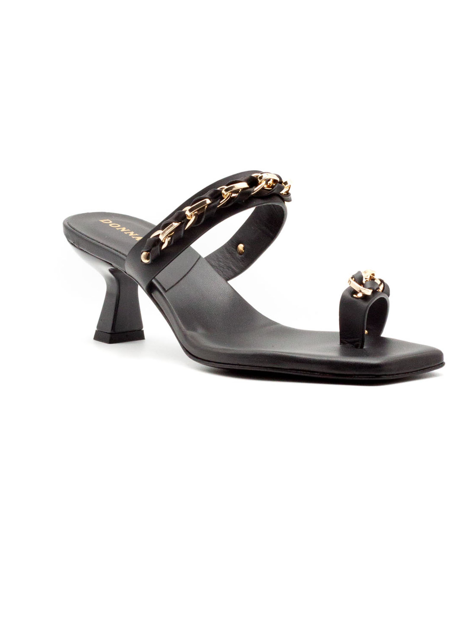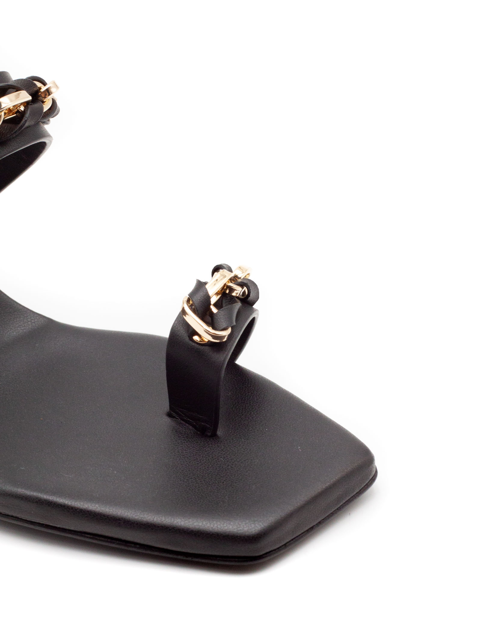Sandalo mule in pelle nero con fascia anteriore e cinturino con catena metallica dorata, punta quadrata, tacco medio sagomato e suola in cuoio con inserto antiscivolo, altezza tacco 4 cm