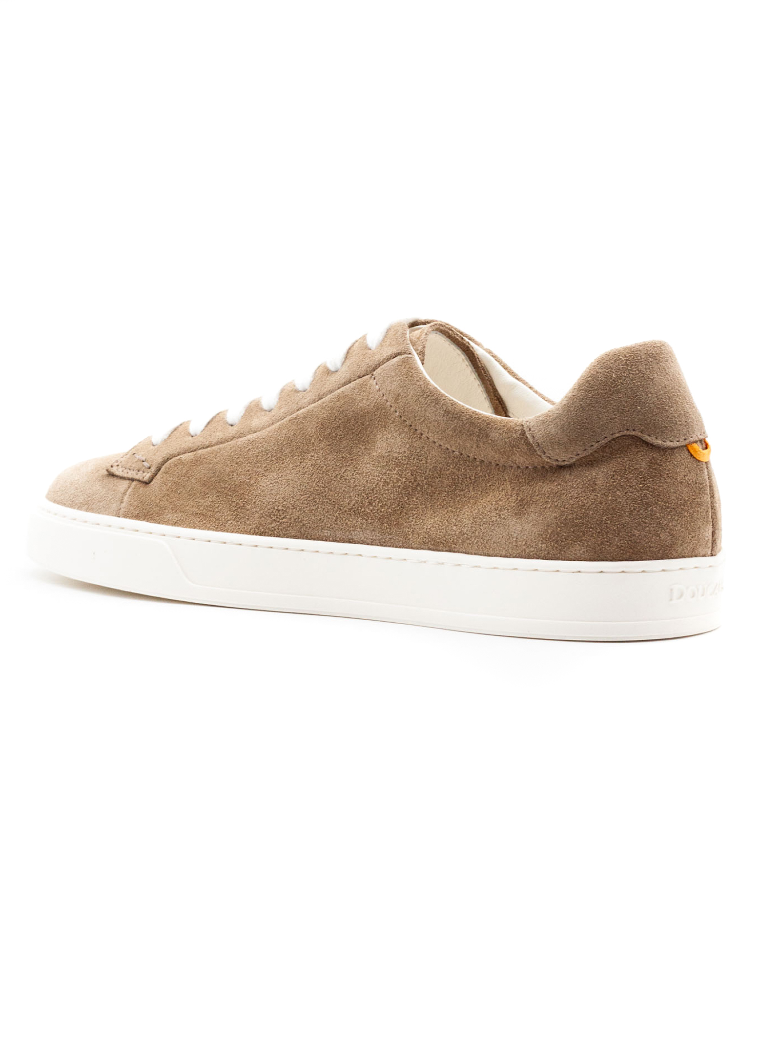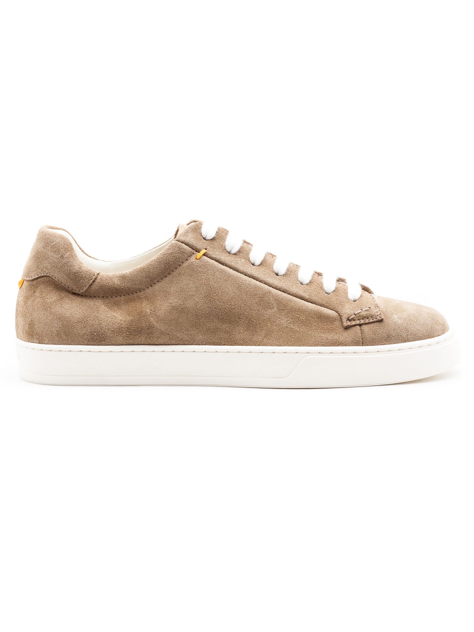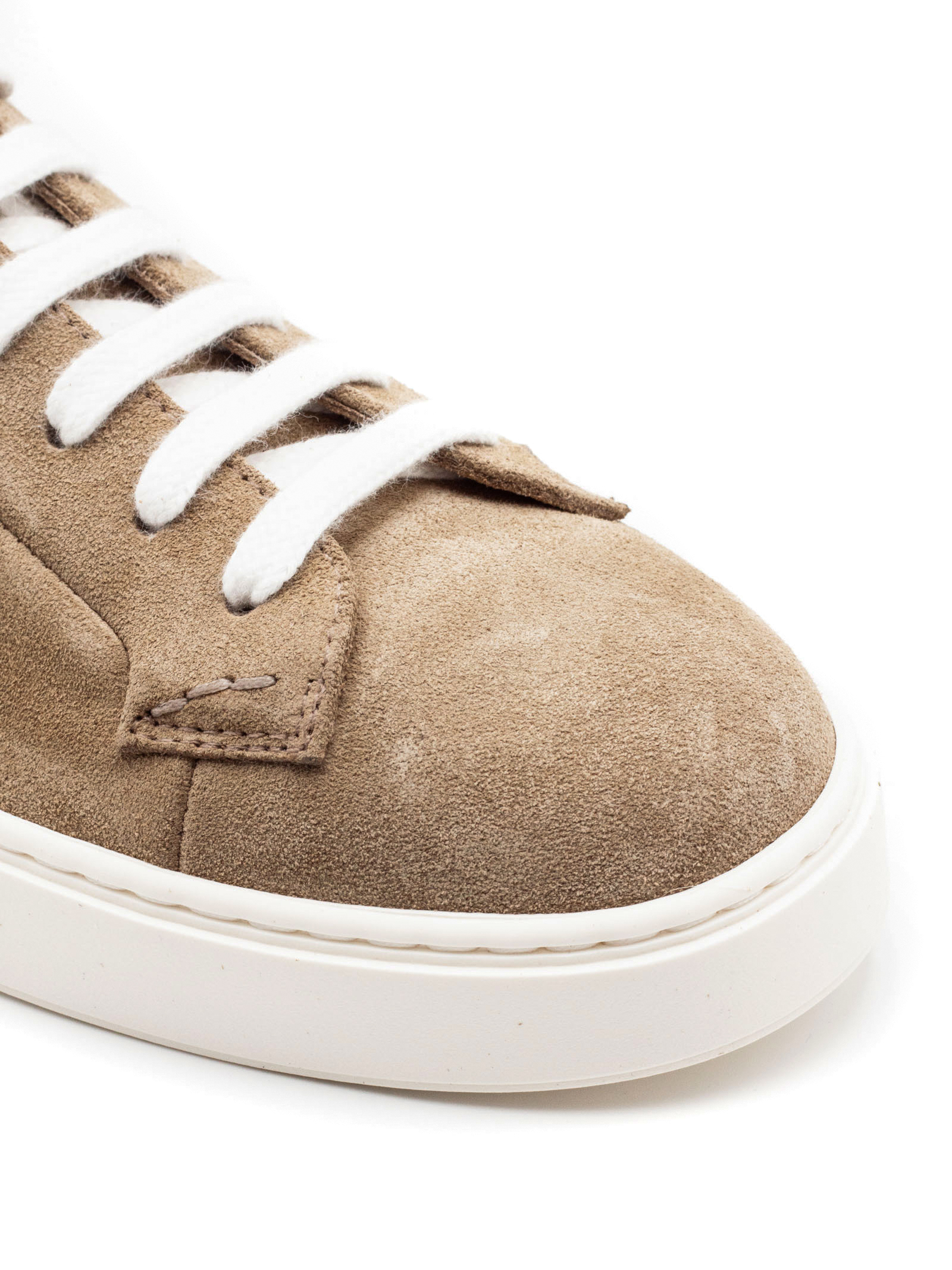 Sneaker in scamosciato di vitello beige, lacci bianchi a contrasto, soletta interna in memory foam, lavorazione Ago, fondo incollato e cucitura laterale, fondo in gomma