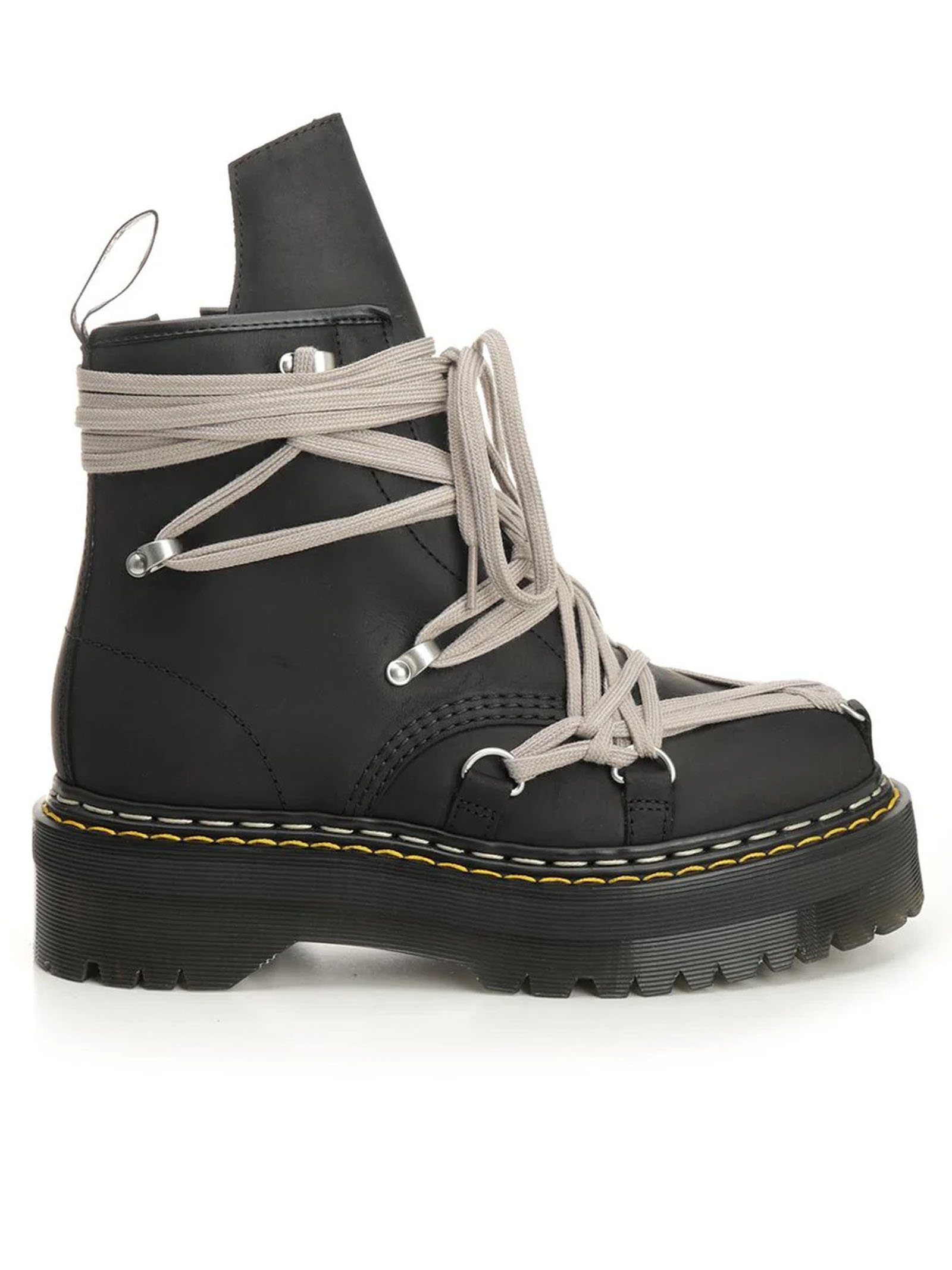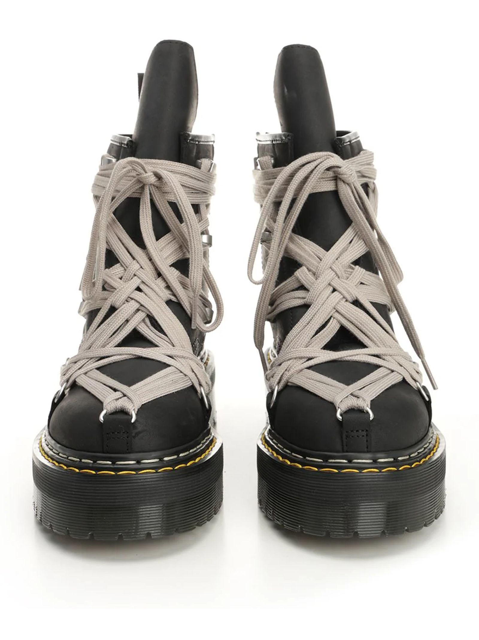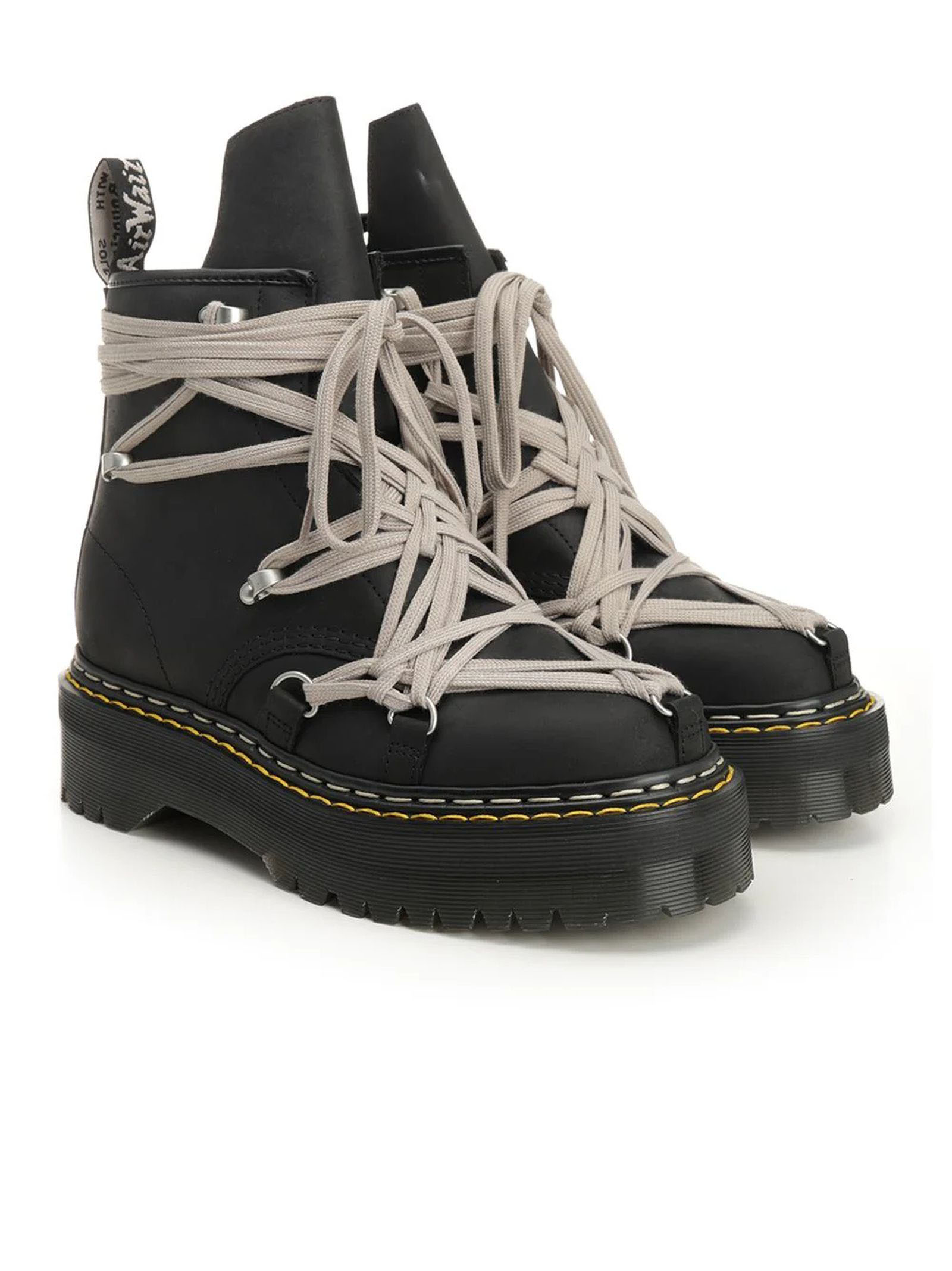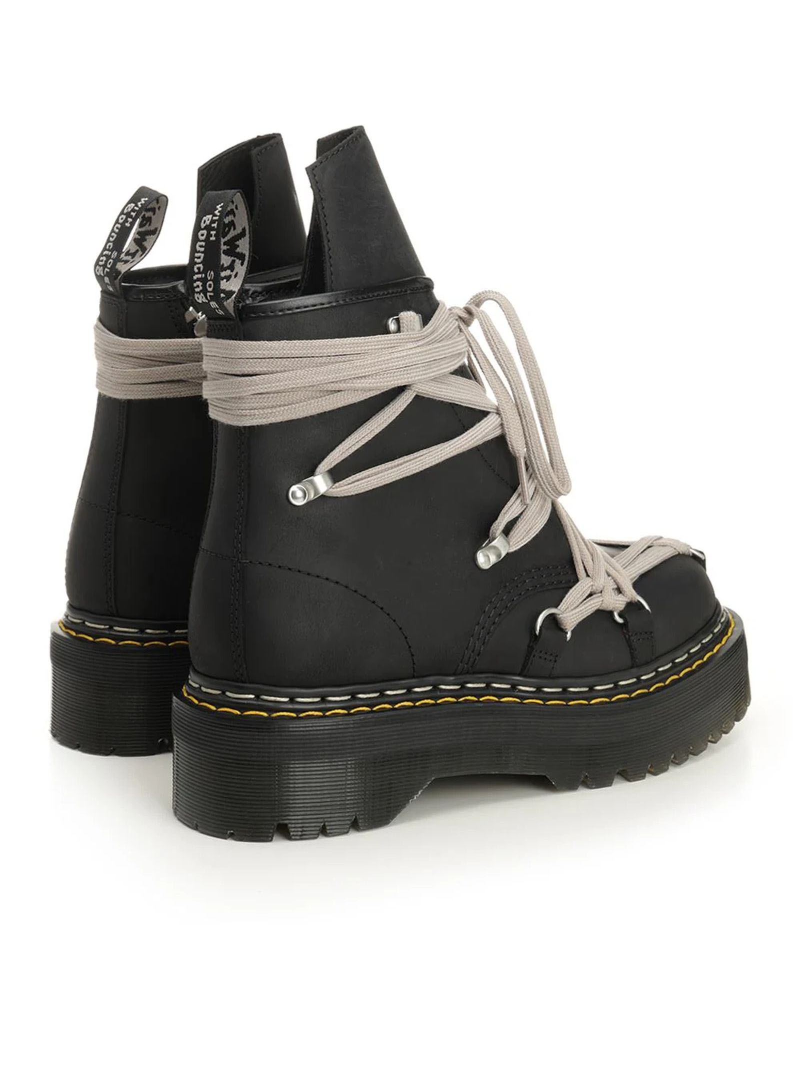 Dr. Martens X Rick Owens 1460 Stivali con suola quadrata Megalace® in pelle di vacchetta nabuk oleata Stivali neri, lingua lunga, lacci spessi e lunghi color perla, robusta cerniera sul retro, tacco quadrato retrò da 5,08 cm