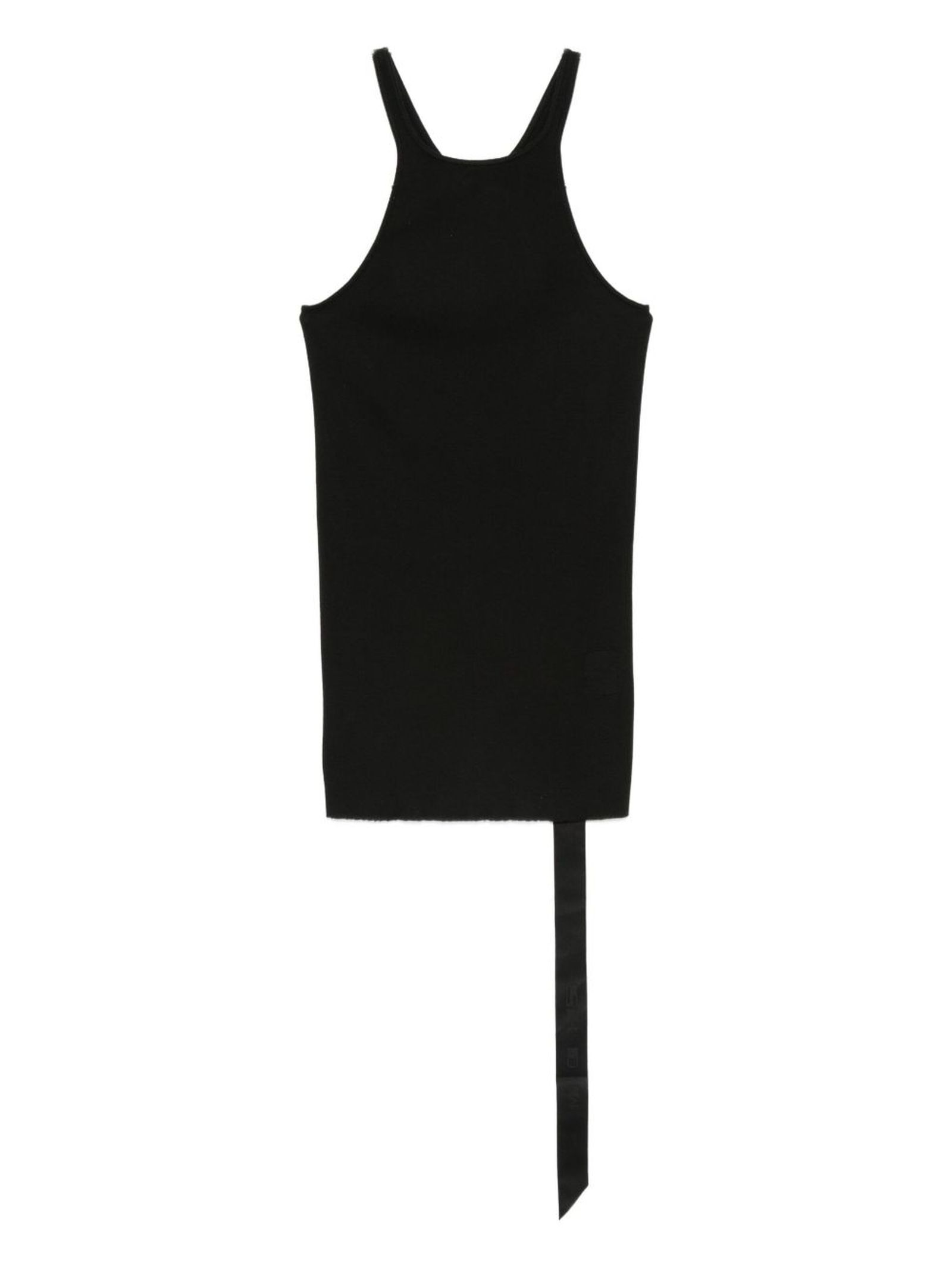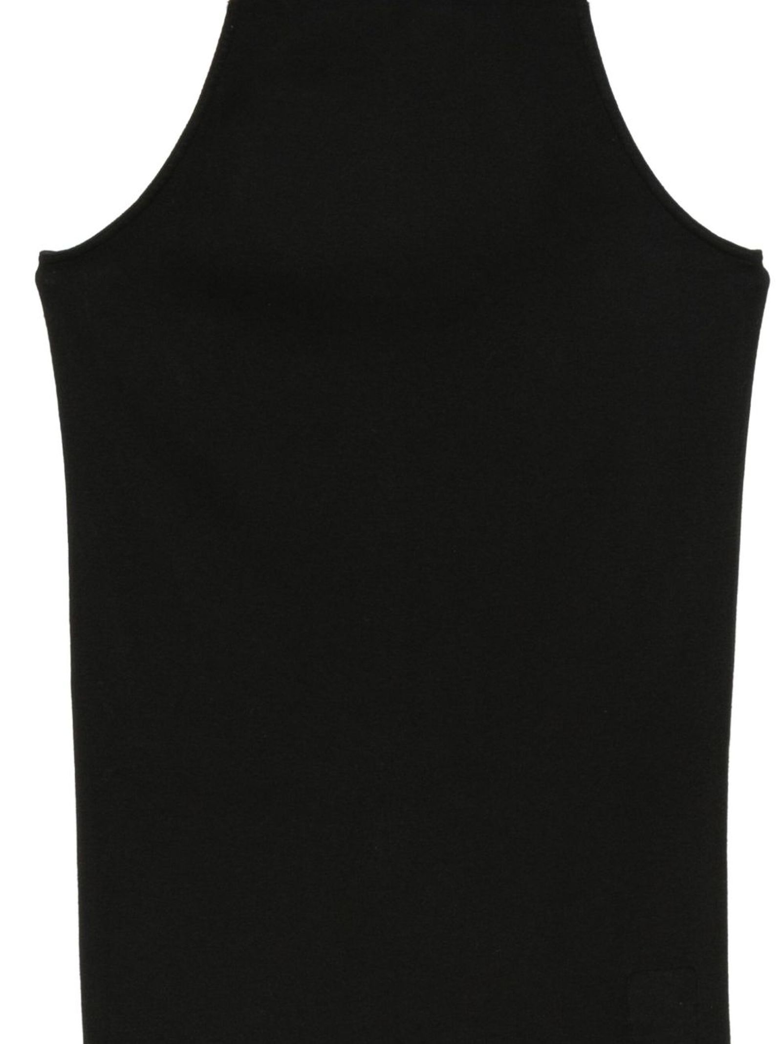 Canotta con dorso a vogatore in jersey di cotone nero di peso medio, lunghezza ai fianchi con orlo dritto grezzo, scollo rotondo e spalline sottili, caratteristica cucitura singola lungo la colonna vertebrale posteriore