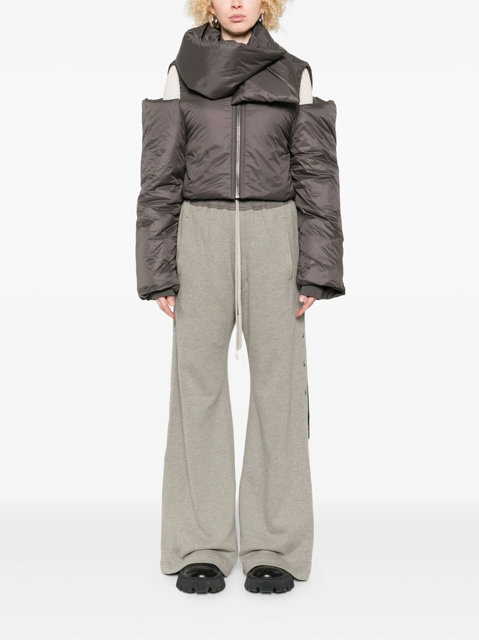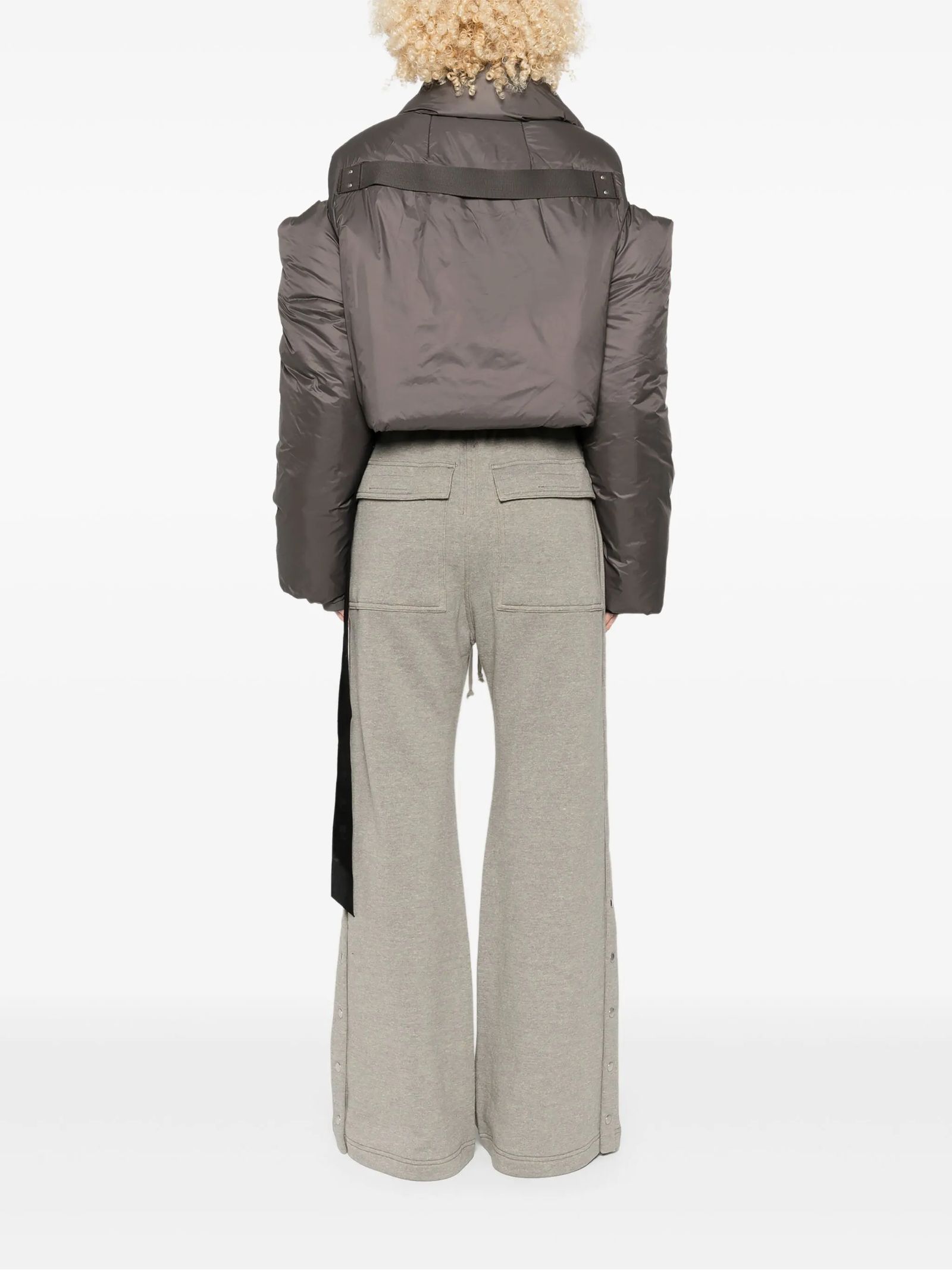 Giacca convertibile corta grigio fango, lunga fino alla vita, con maniche lunghe. Presenta una cerniera centrale sul davanti con bottoni a pressione superiori e sulle spalle, che consentono di indossarla con le spalle ripiegate. È dotata di un collo alto a imbuto rimovibile con bottoni a pressione sul collo. Una volta rimosso, rivela un collo a costine e bottoni a pressione visibili. Presenta una cinghia in cotone con dettagli rivettati sul carré posteriore. È completamente foderata e ha tasche interne con bottoni a pressione