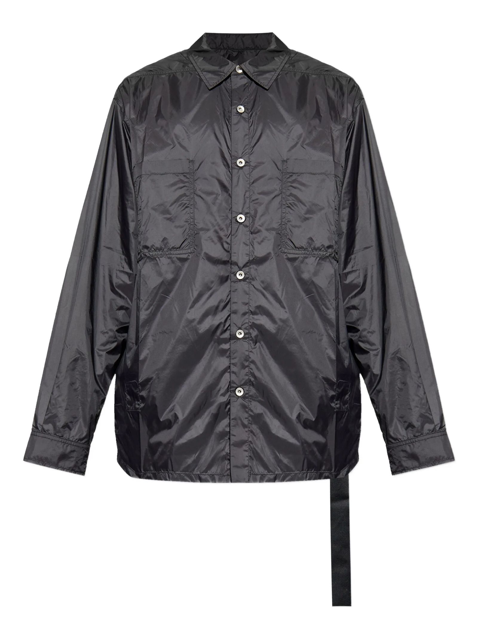 Overshirt grigio scuro, collo a punta, chiusura con bottoni, maniche lunghe, due tasche sul petto, orlo dritto