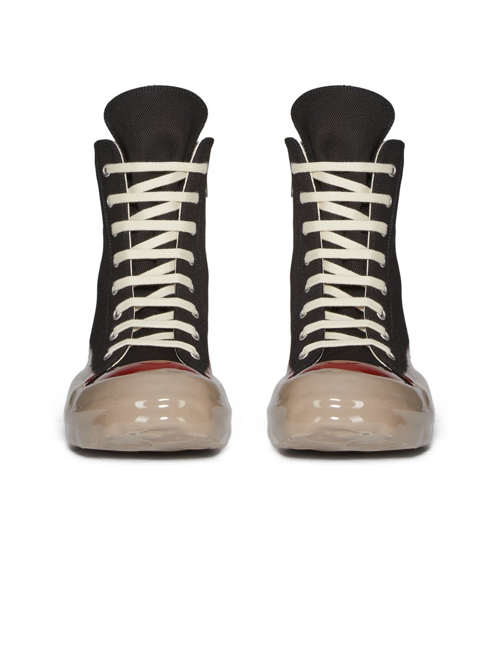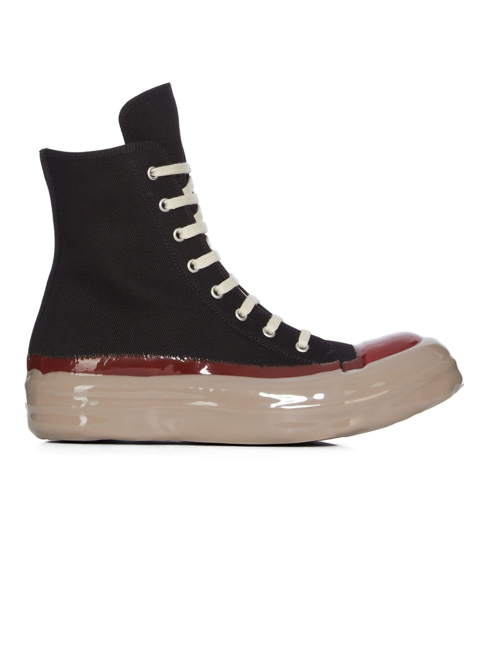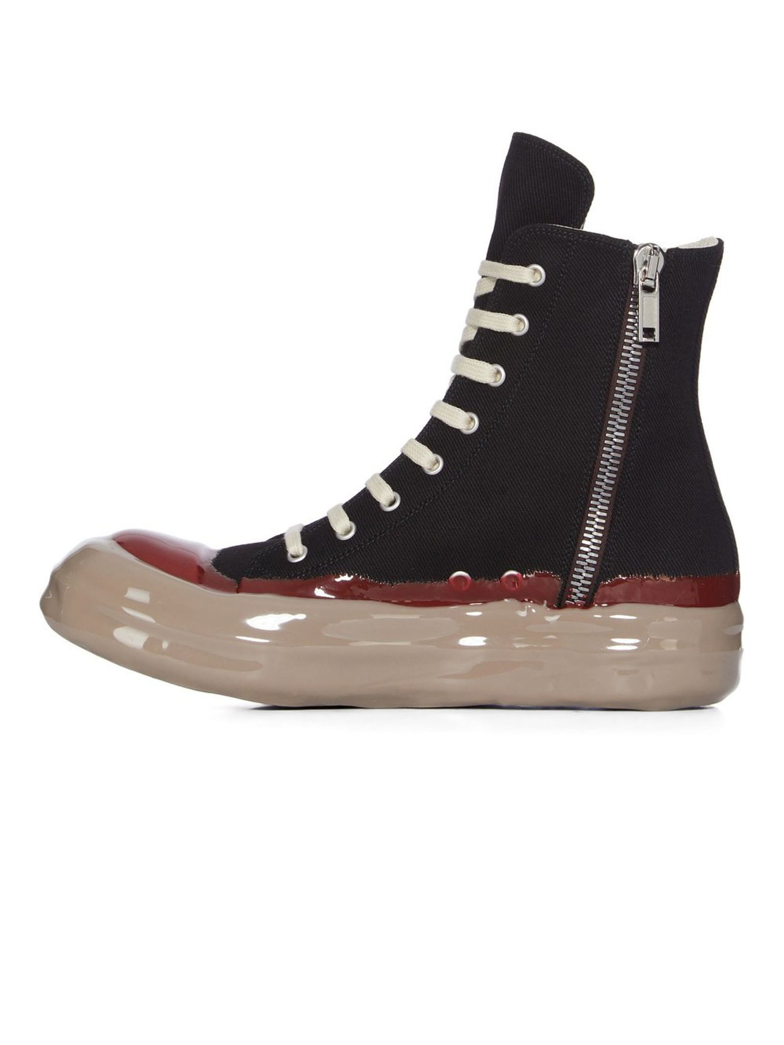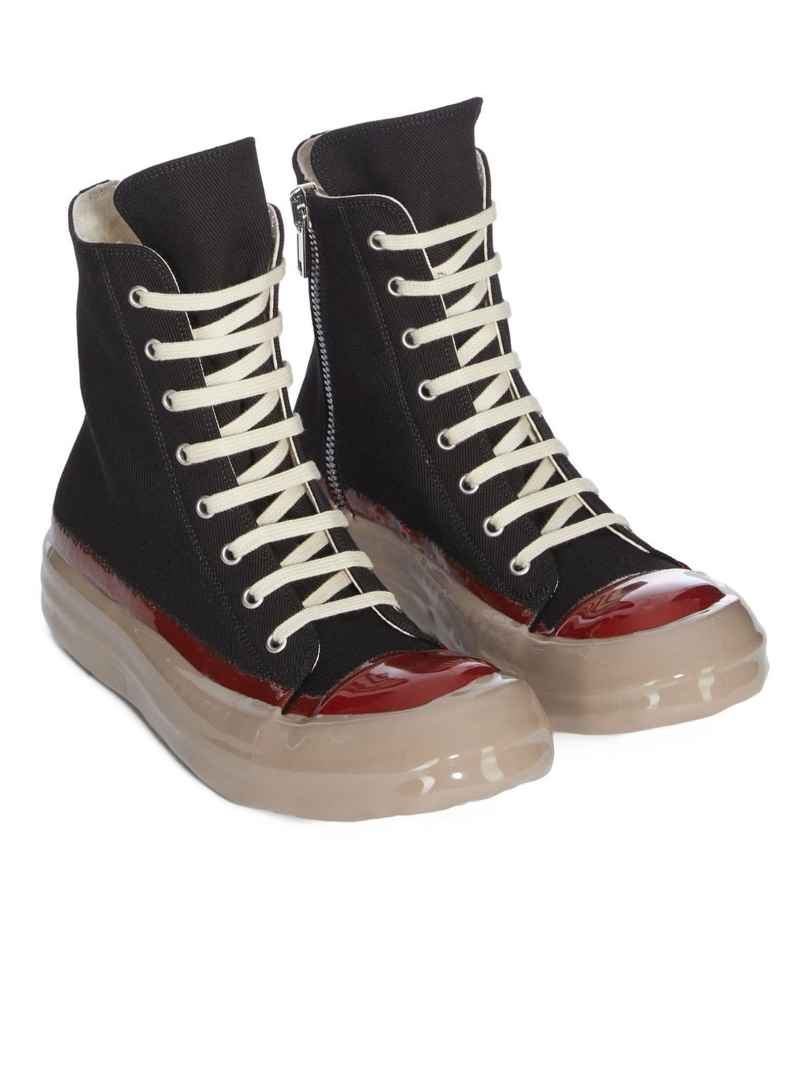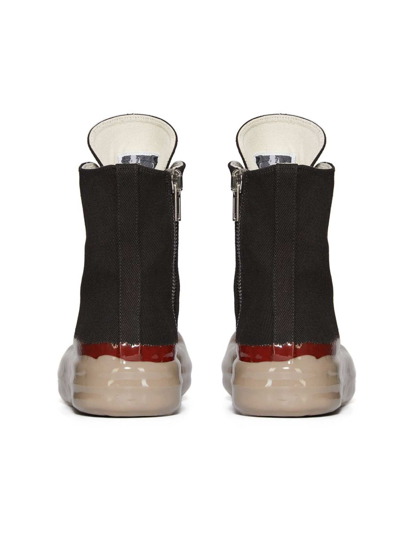Sneakers in denim sovratinto nero/rosso/beige scuro da 13 once, altezza alla caviglia, con otto occhielli, lacci, cerniera interna alla caviglia per una facile chiusura, puntale e suola con dentellatura a squalo, altezza suola 3,5 cm