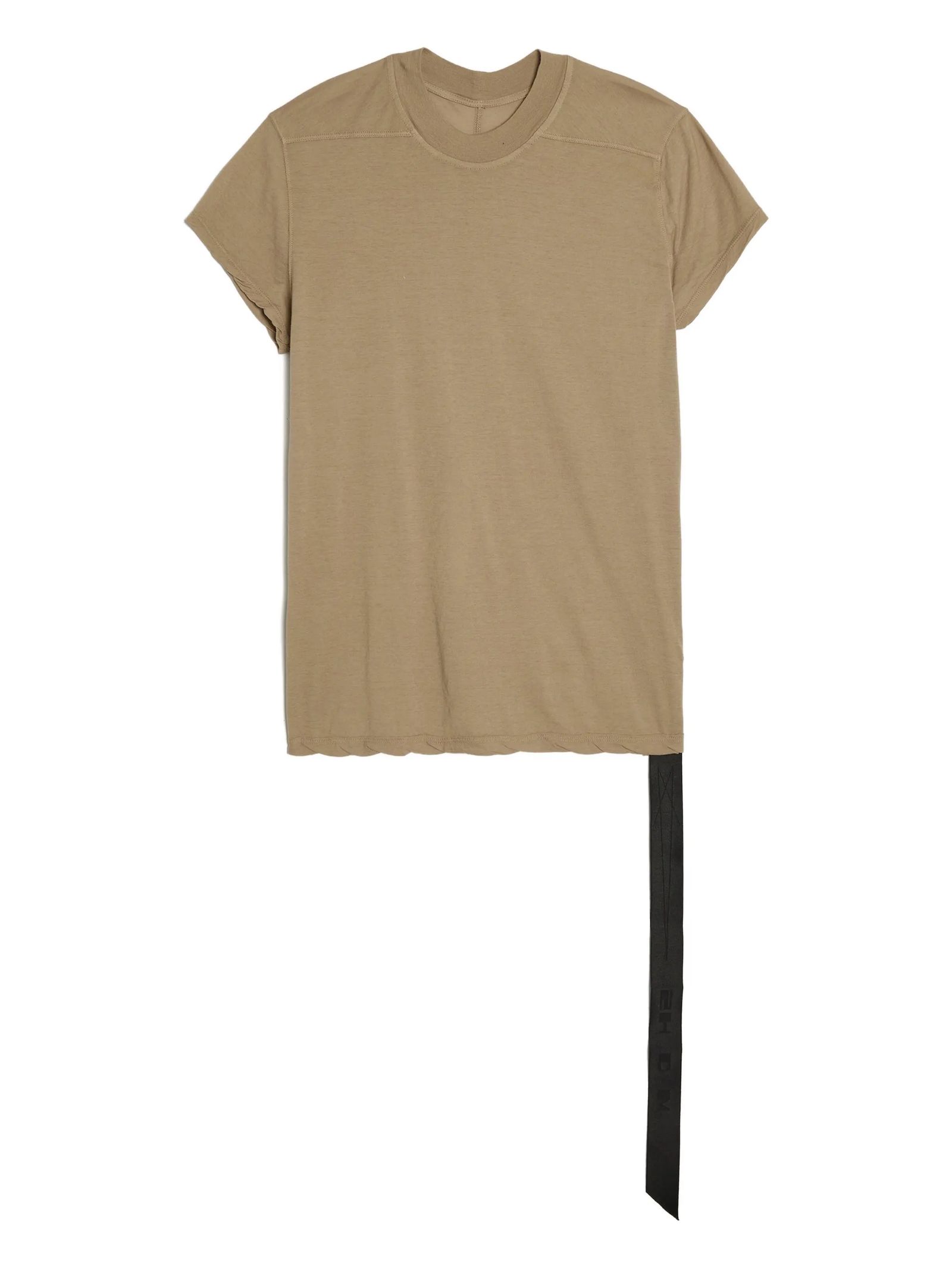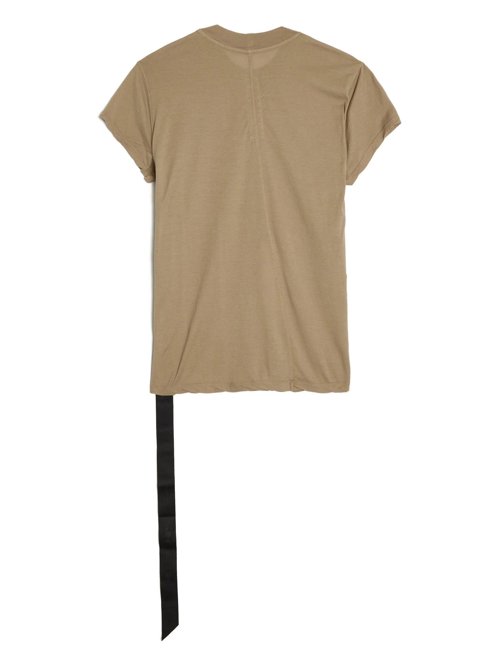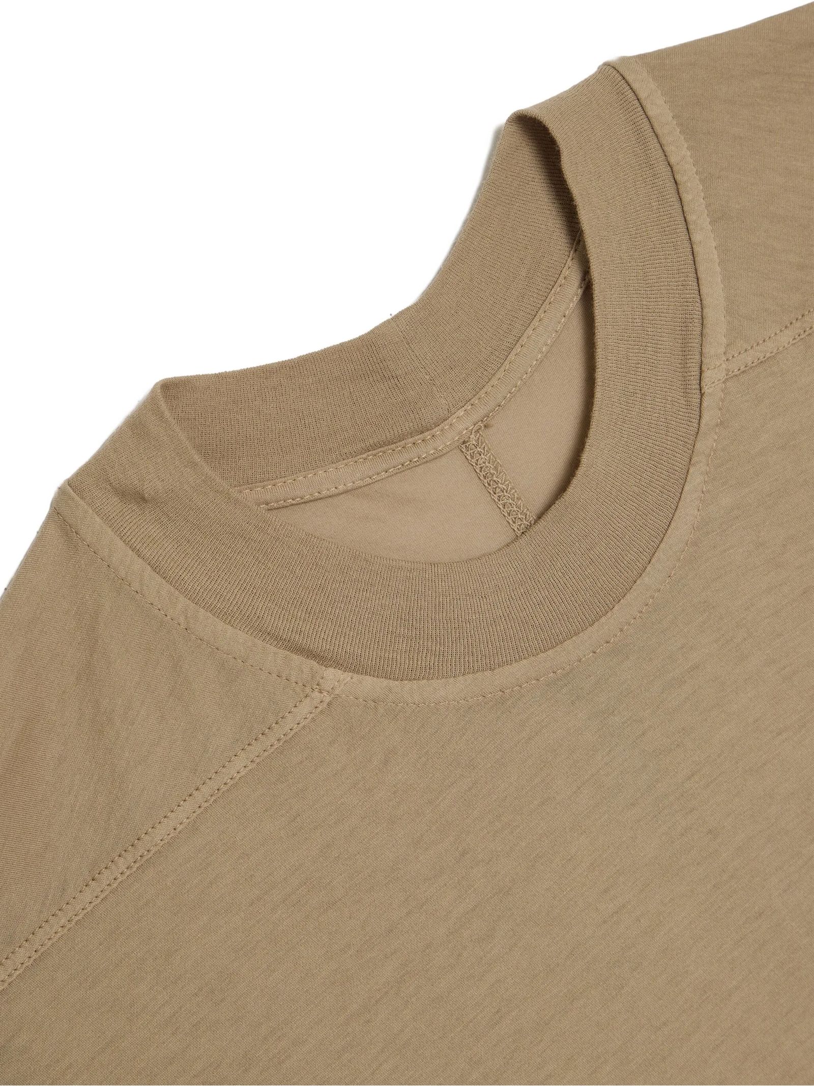 T-shirt in cotone beige dal taglio semi-aderente, lunghezza ai fianchi, maniche corte e girocollo a costine. Presenta le caratteristiche cuciture sulle spalle e una cucitura centrale sul retro