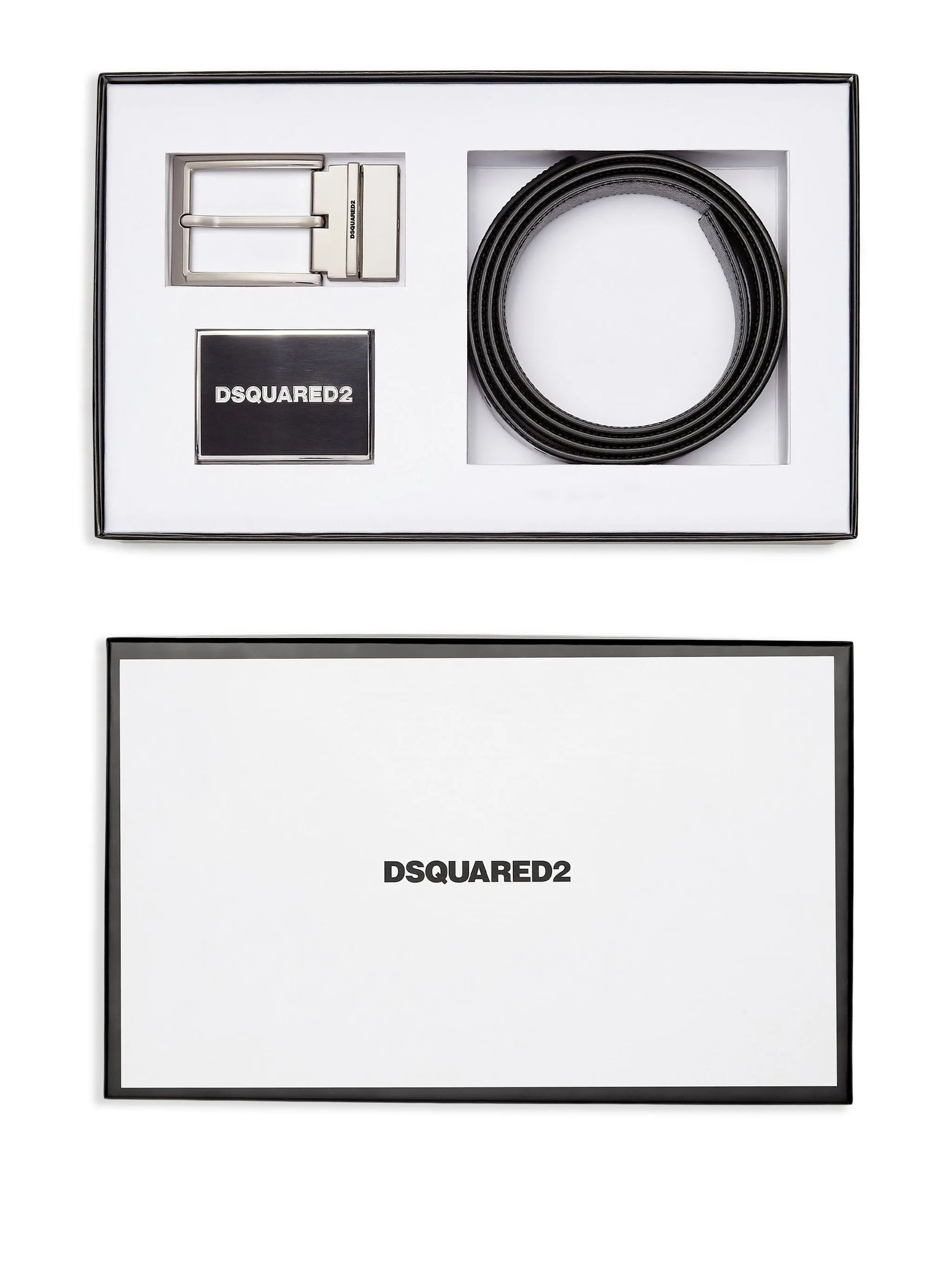 Cintura in pelle nera, confezione regalo, set di tre, placca con logo, chiusura con fibbia