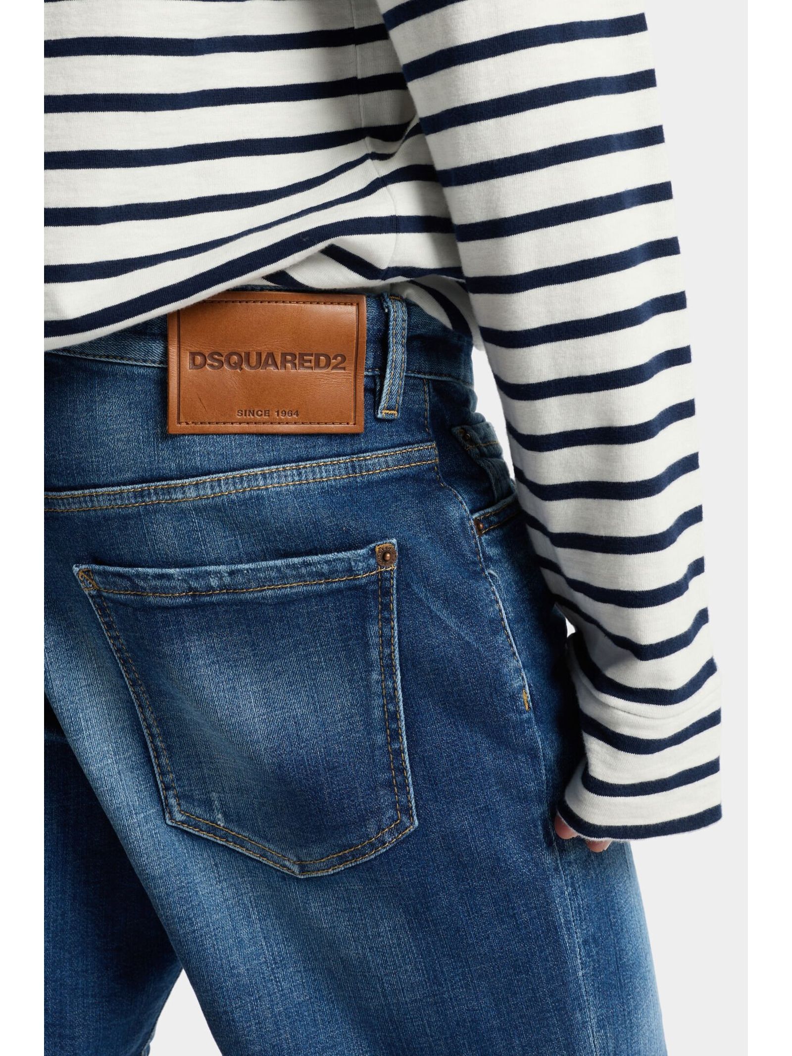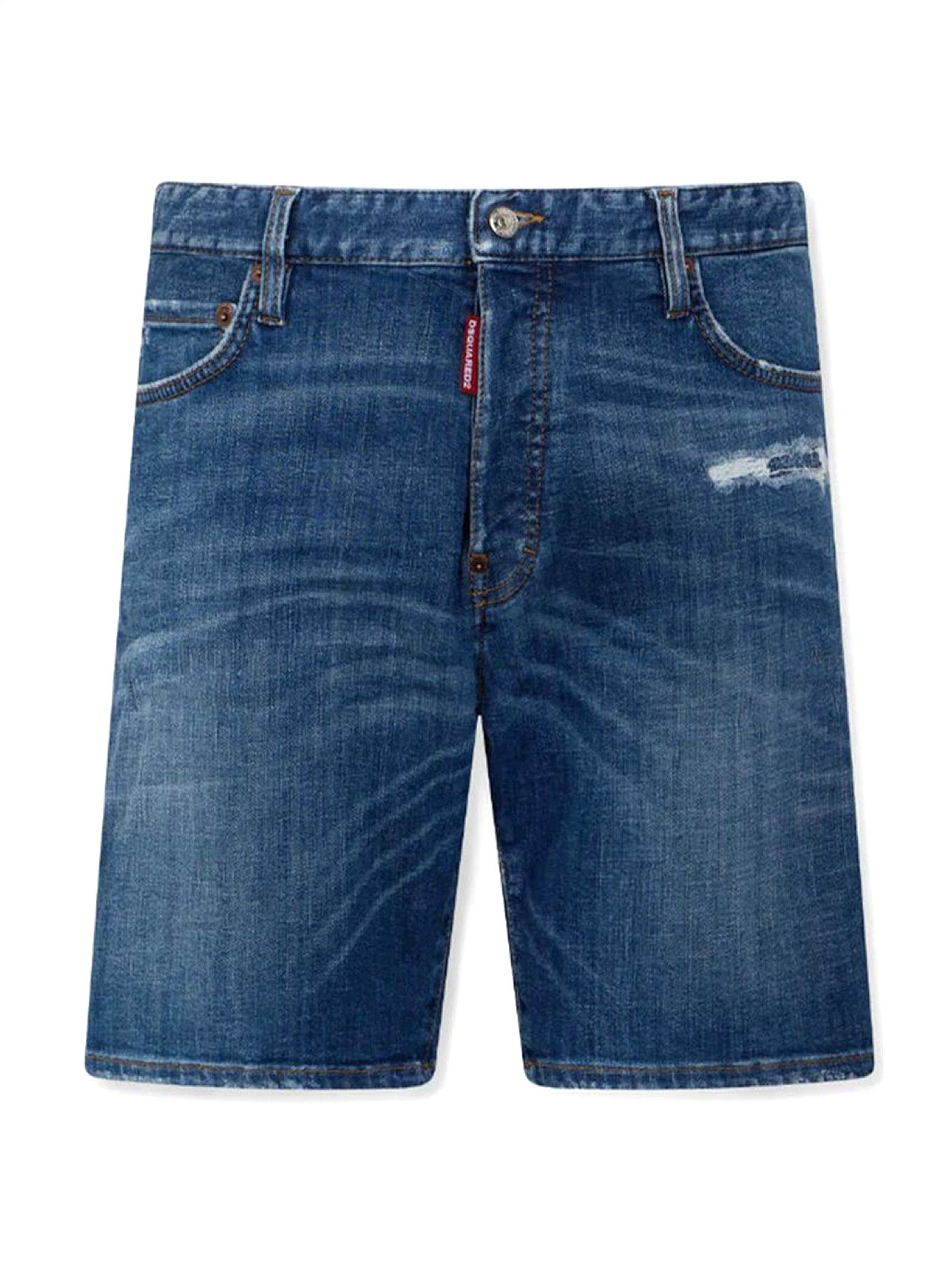 Shorts in denim di cotone elasticizzato blu, effetto consumato, chiusura nascosta, modello a cinque tasche, etichetta Dsquared2 rossa, toppa Dsquared2