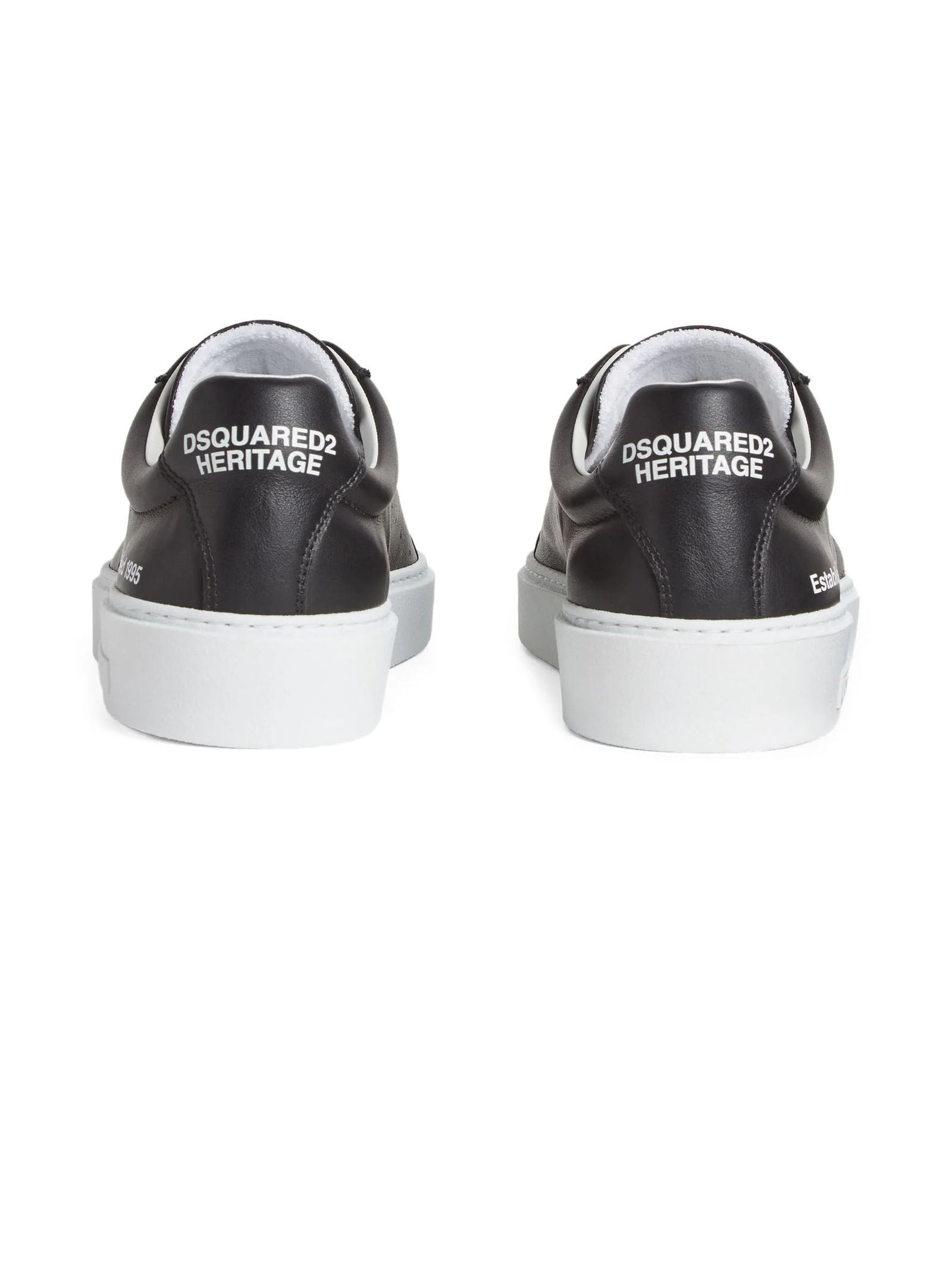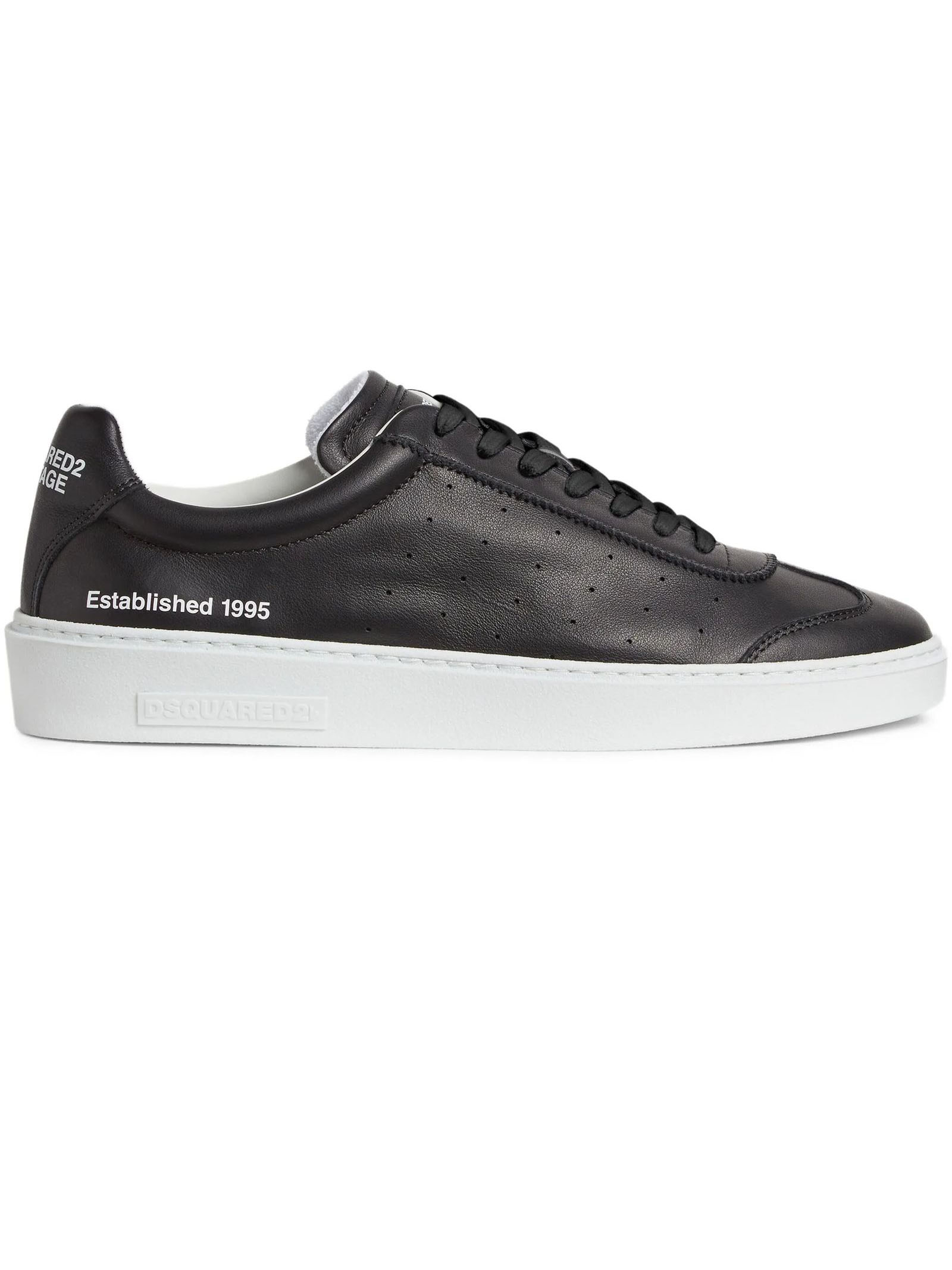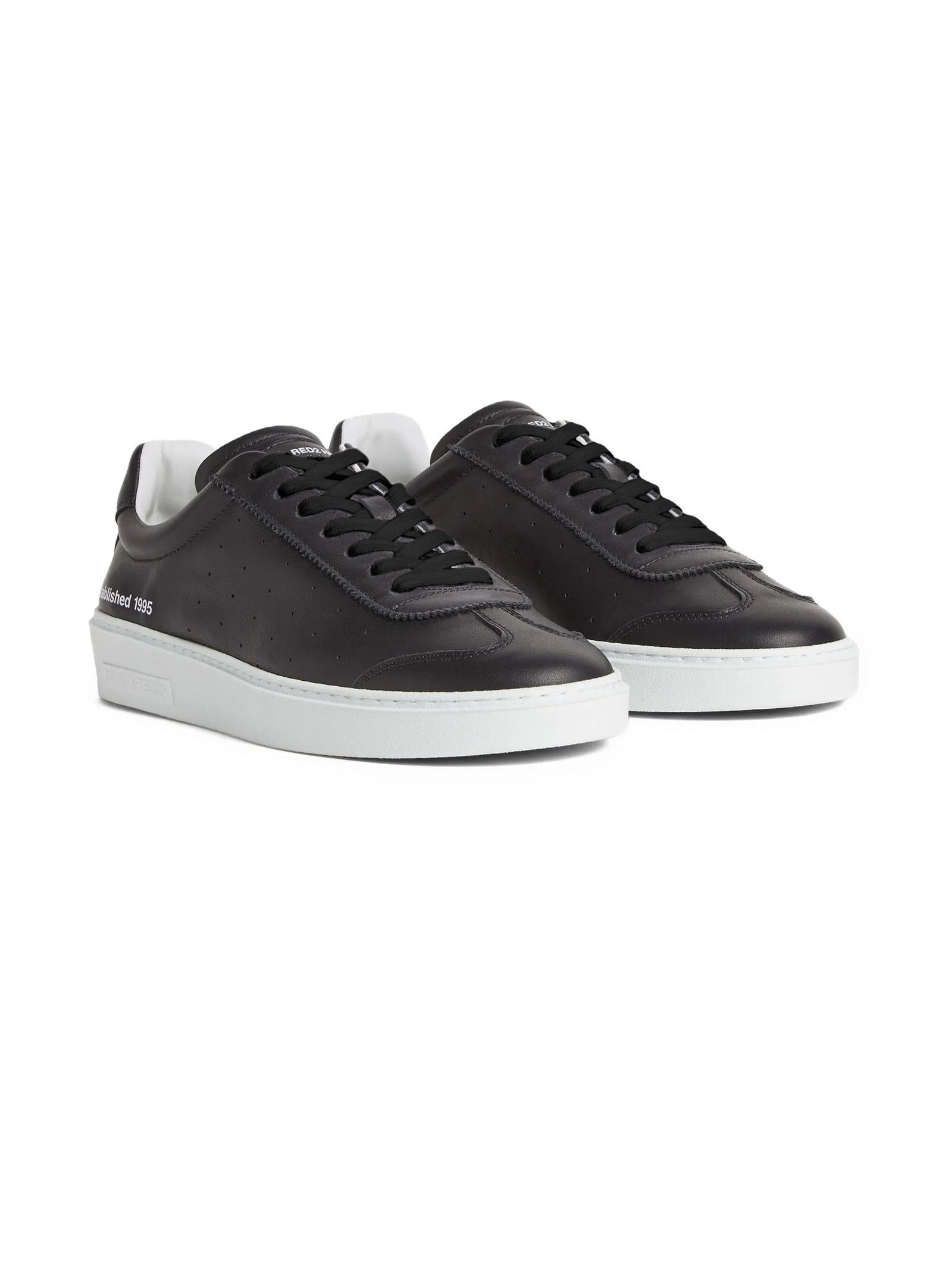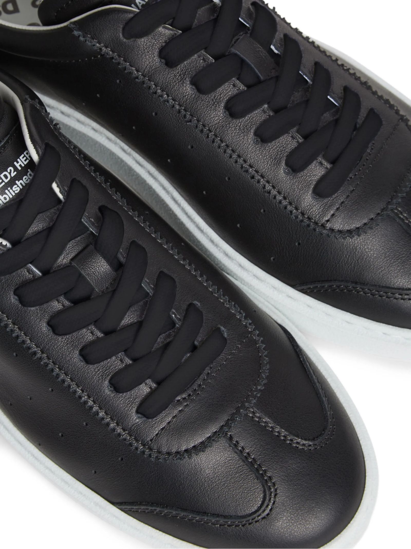 Sneakers in pelle nera, chiusura frontale con lacci, punta tonda, dettaglio traforato, suola piatta in gomma
