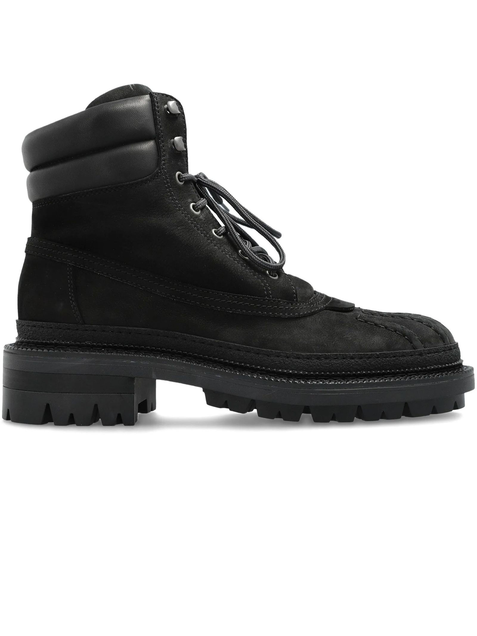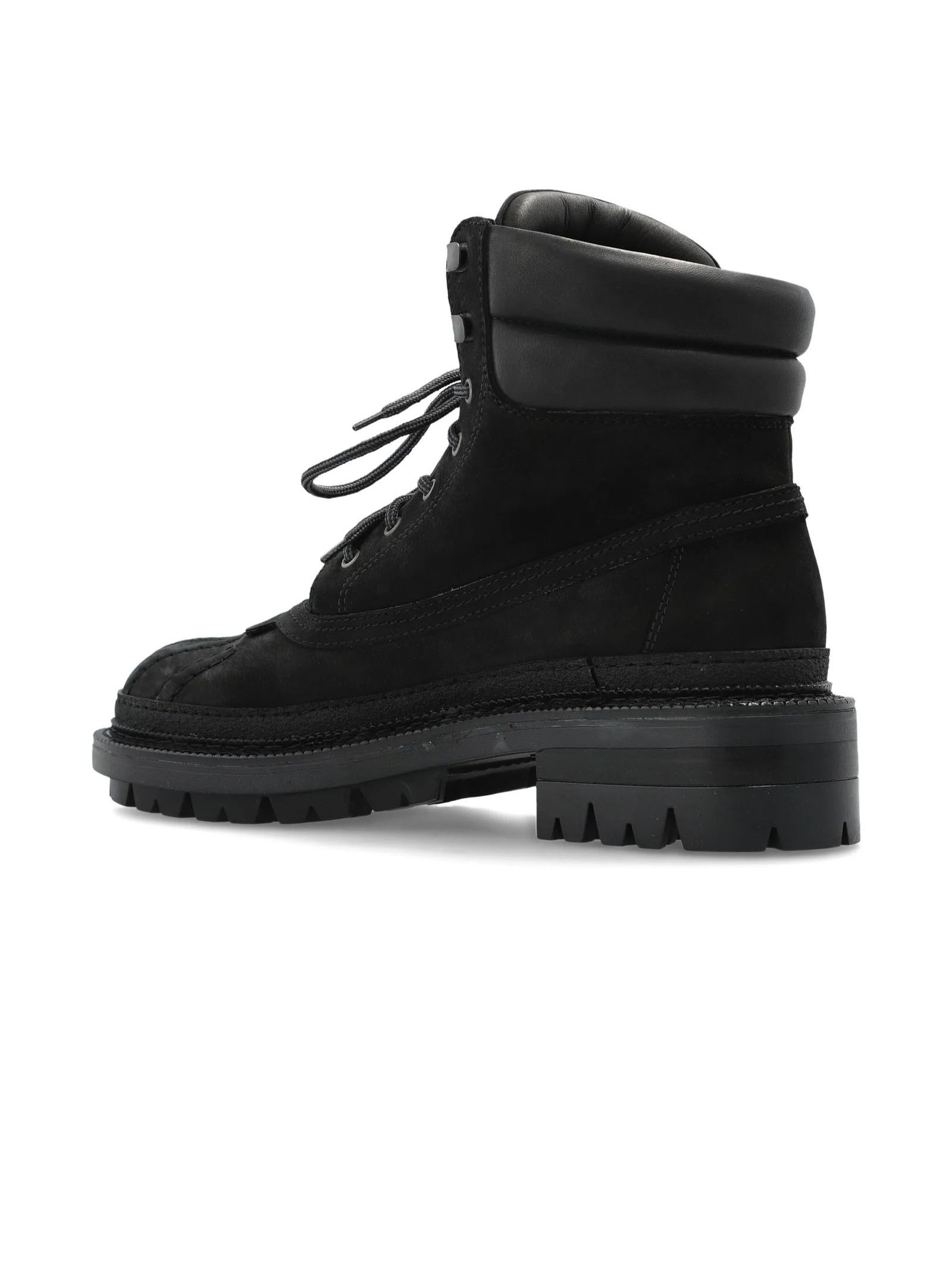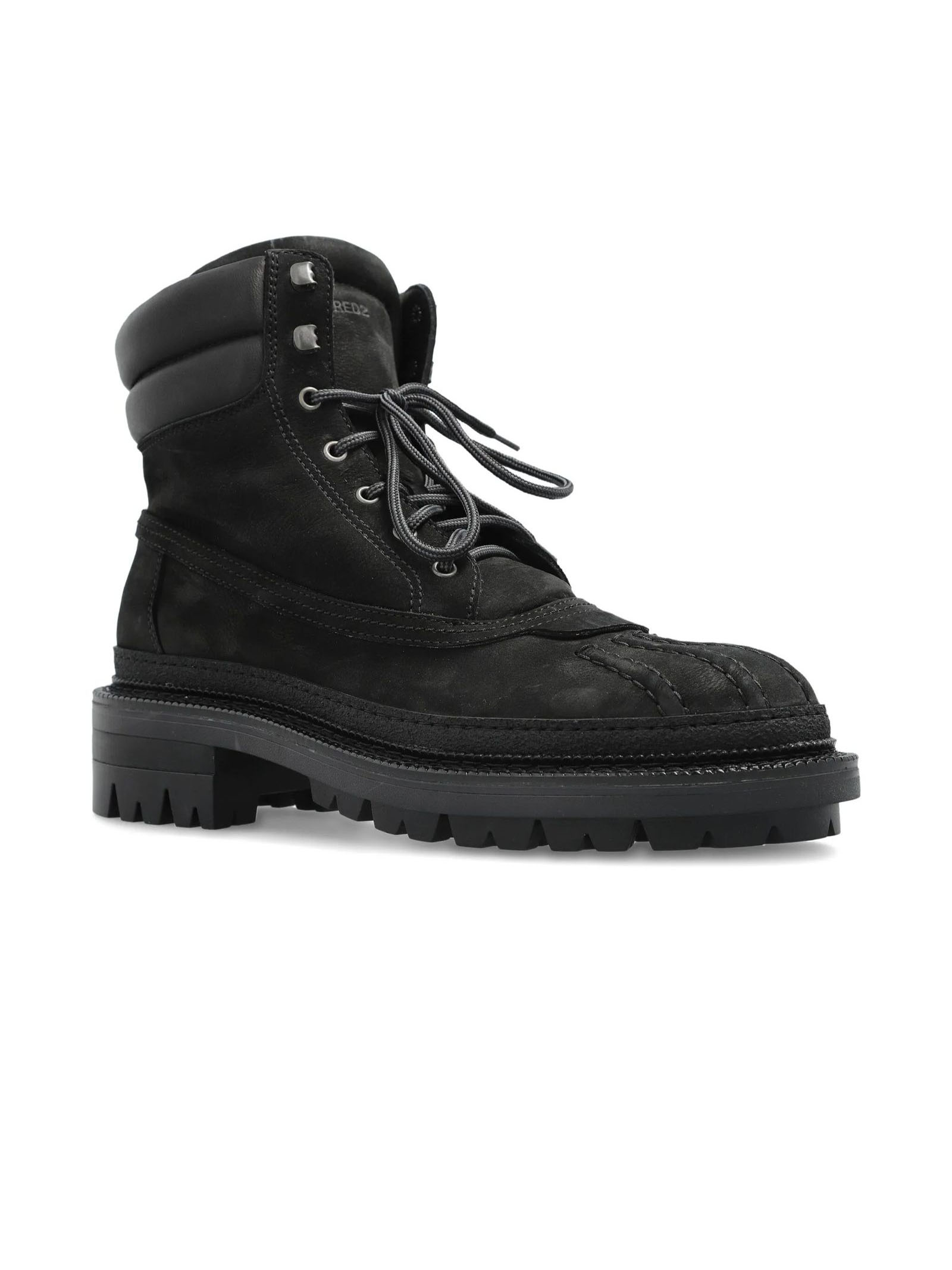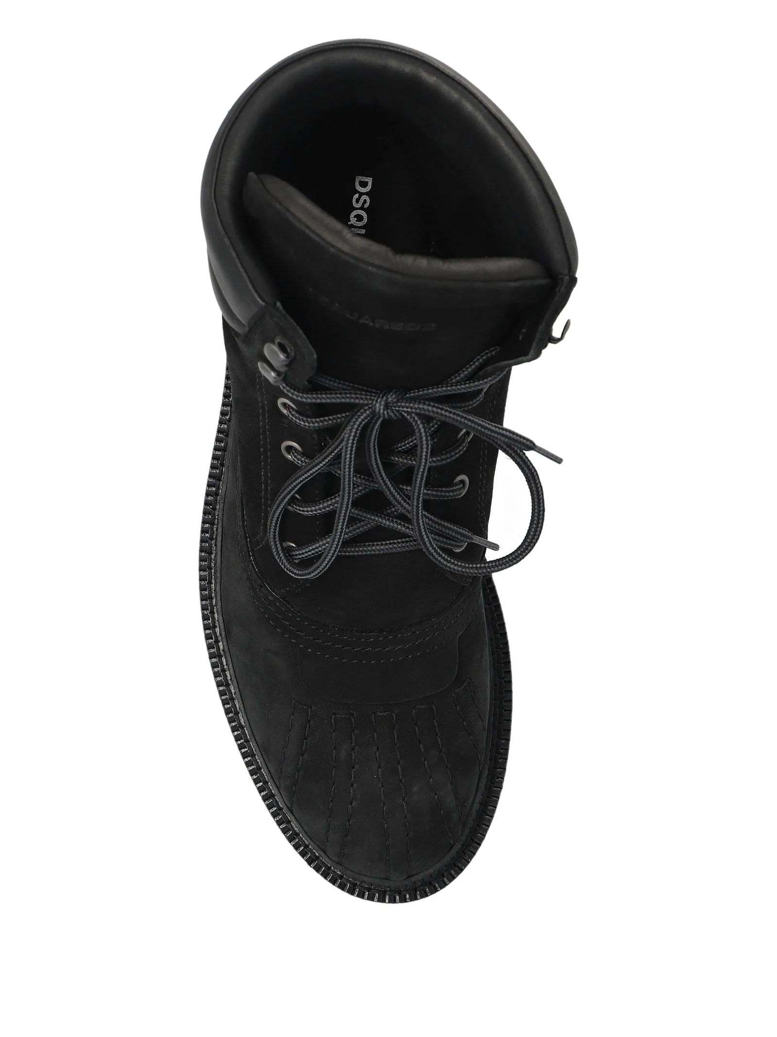 Stivali Army imbottiti in pelle di vitello nero, profilo alla caviglia imbottito, chiusura con lacci, punta tonda, suola in gomma