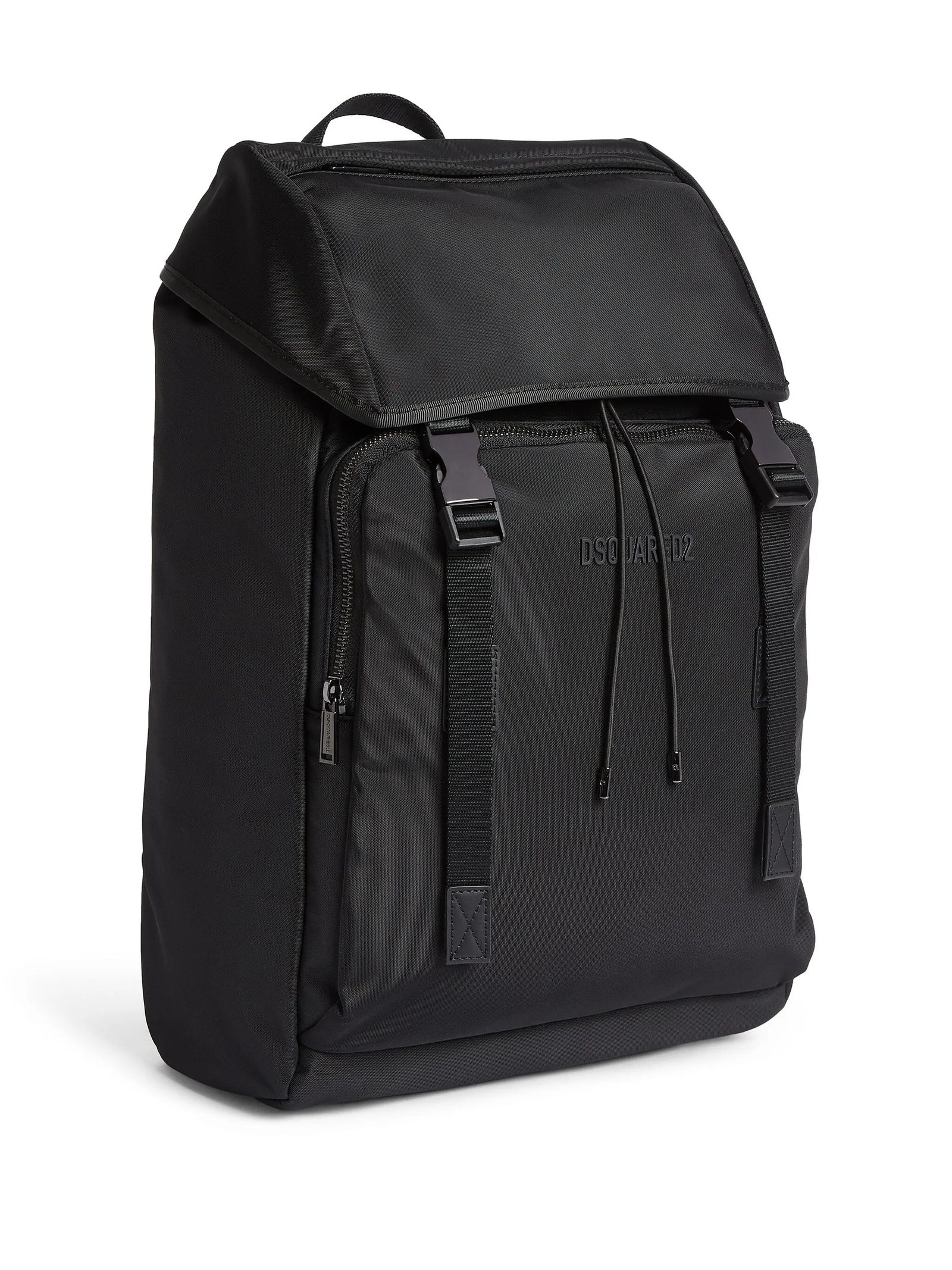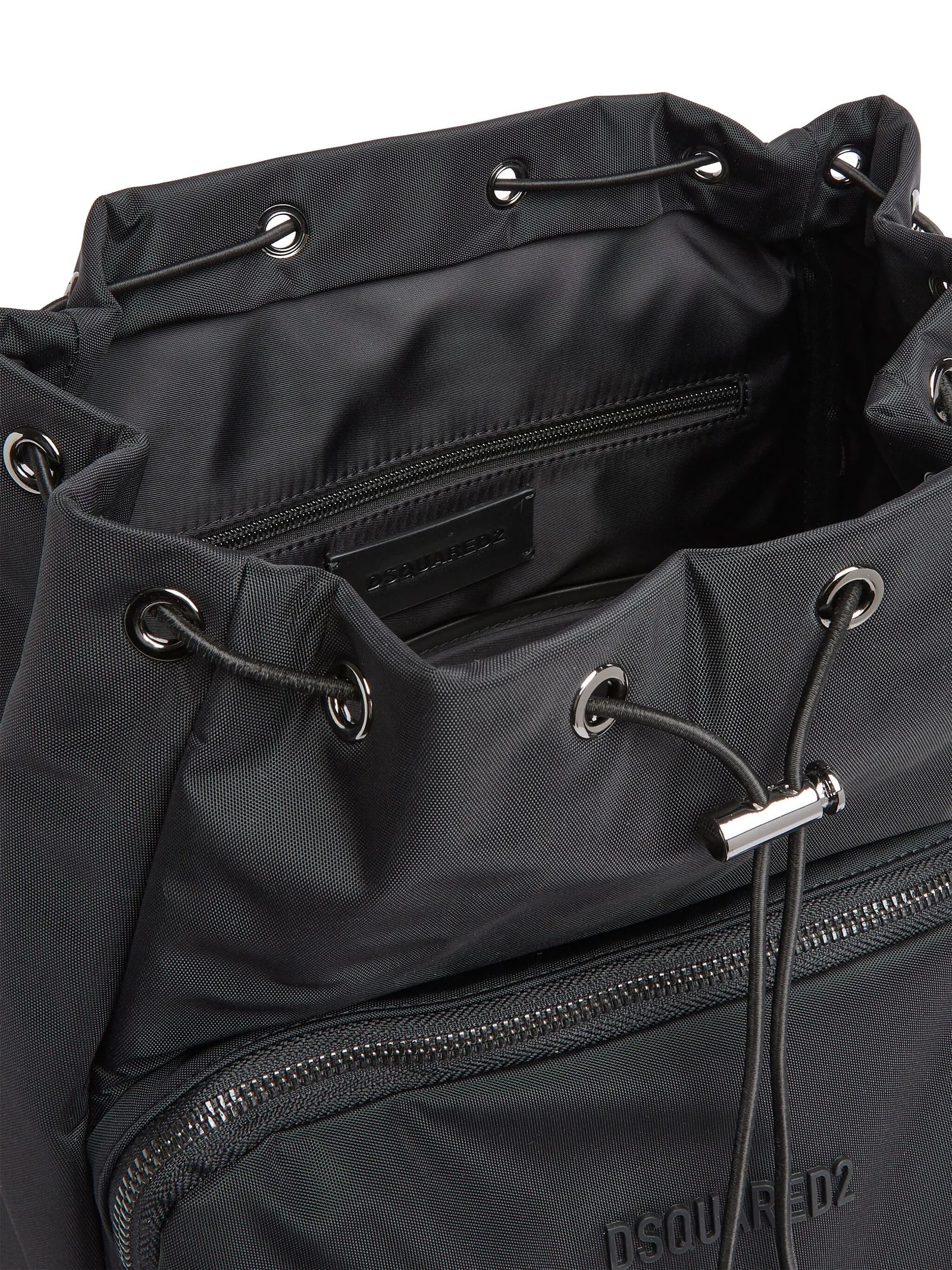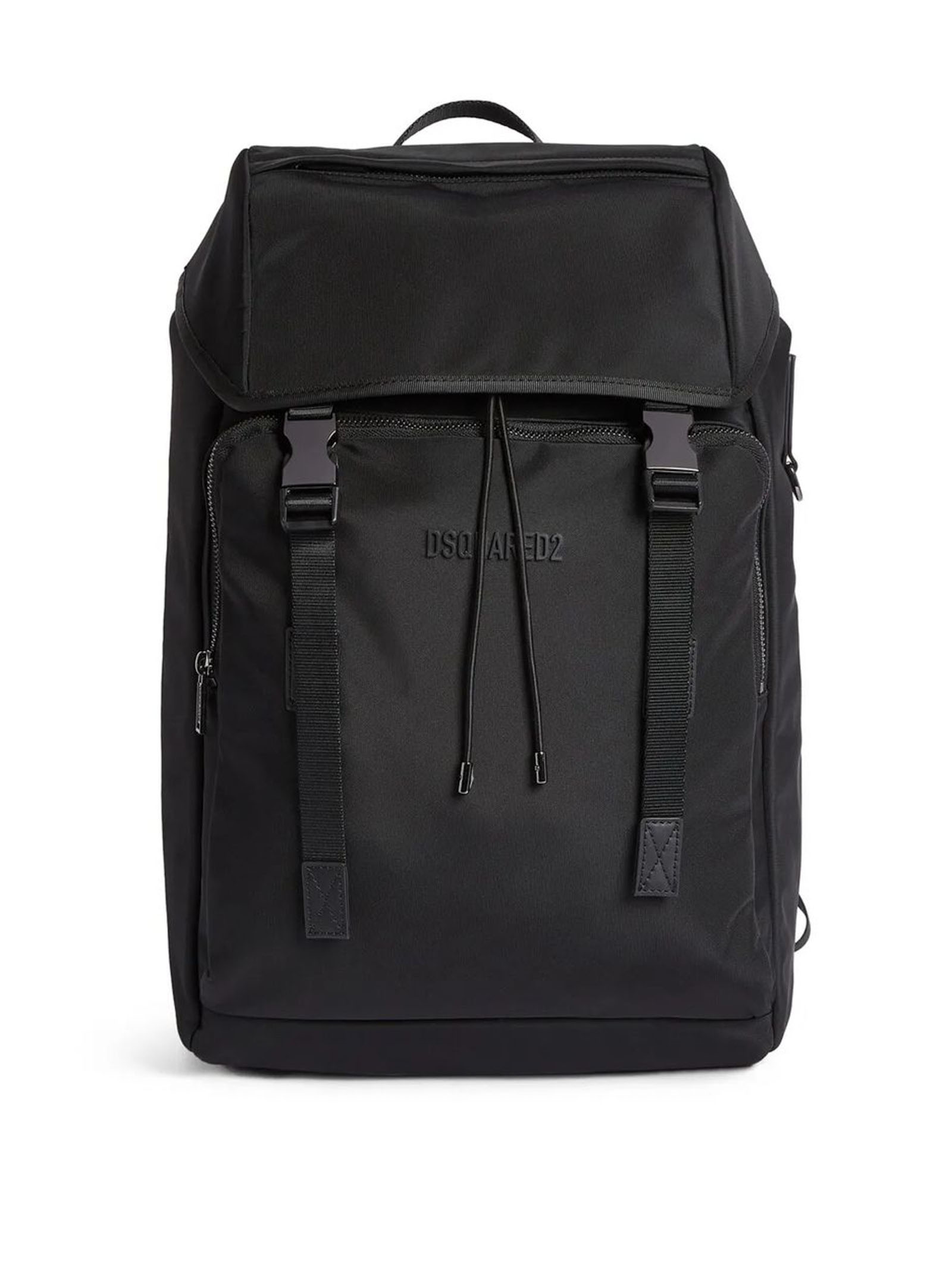 Zaino in tessuto nero, logo goffrato nella parte anteriore, spalline regolabili, manico superiore, pattina nella parte superiore, chiusura con fibbia, scomparto frontale con zip, chiusura superiore a coulisse, scomparto unico, tasca interna con zip, applicazione interna con logo, Profondità 14 cm, Altezza 48 cm, Larghezza 27 cm