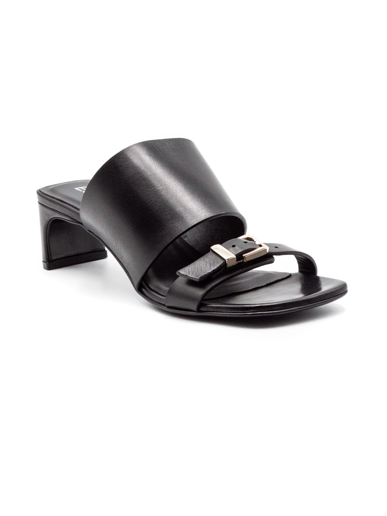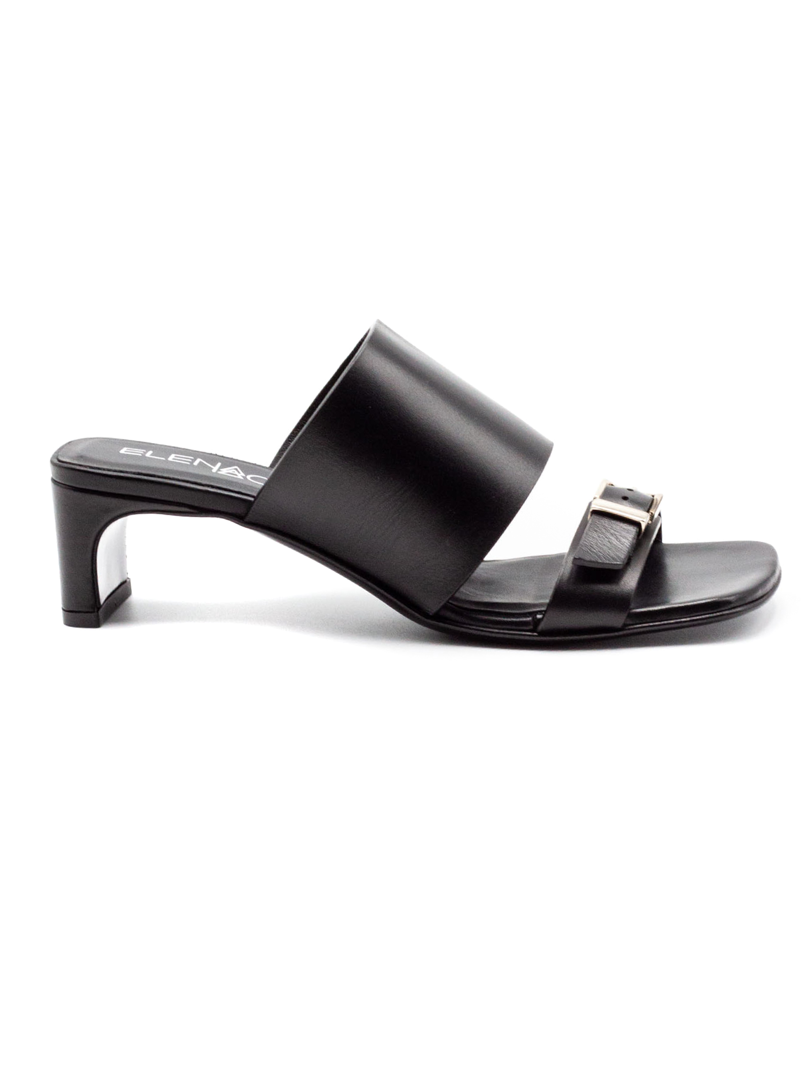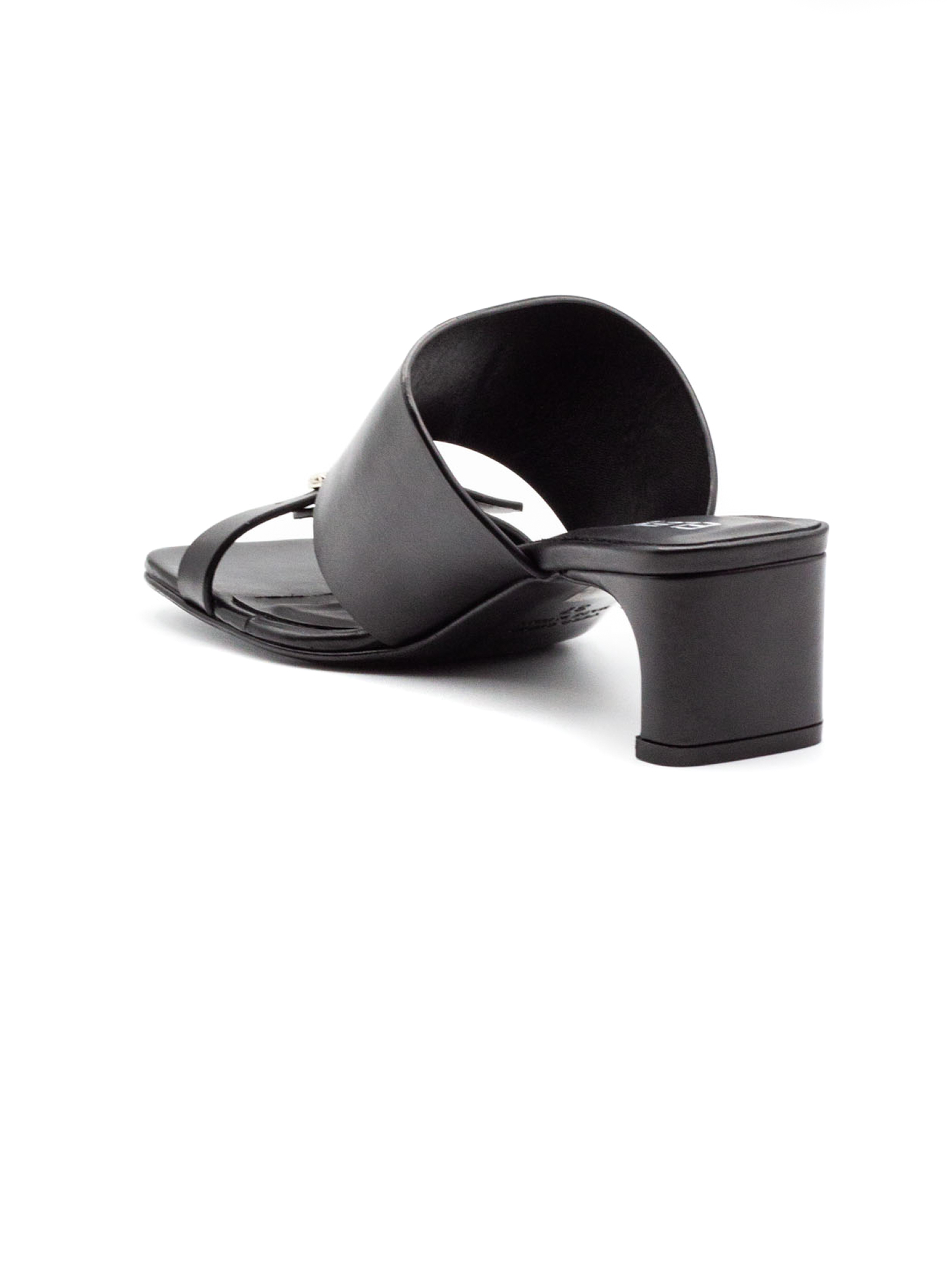 Sandalo in pelle nera con dettaglio fascia ampia sul collo del piede, fibbia in metallo color argento, suola in cuoio con logo, altezza tacco 4 cm