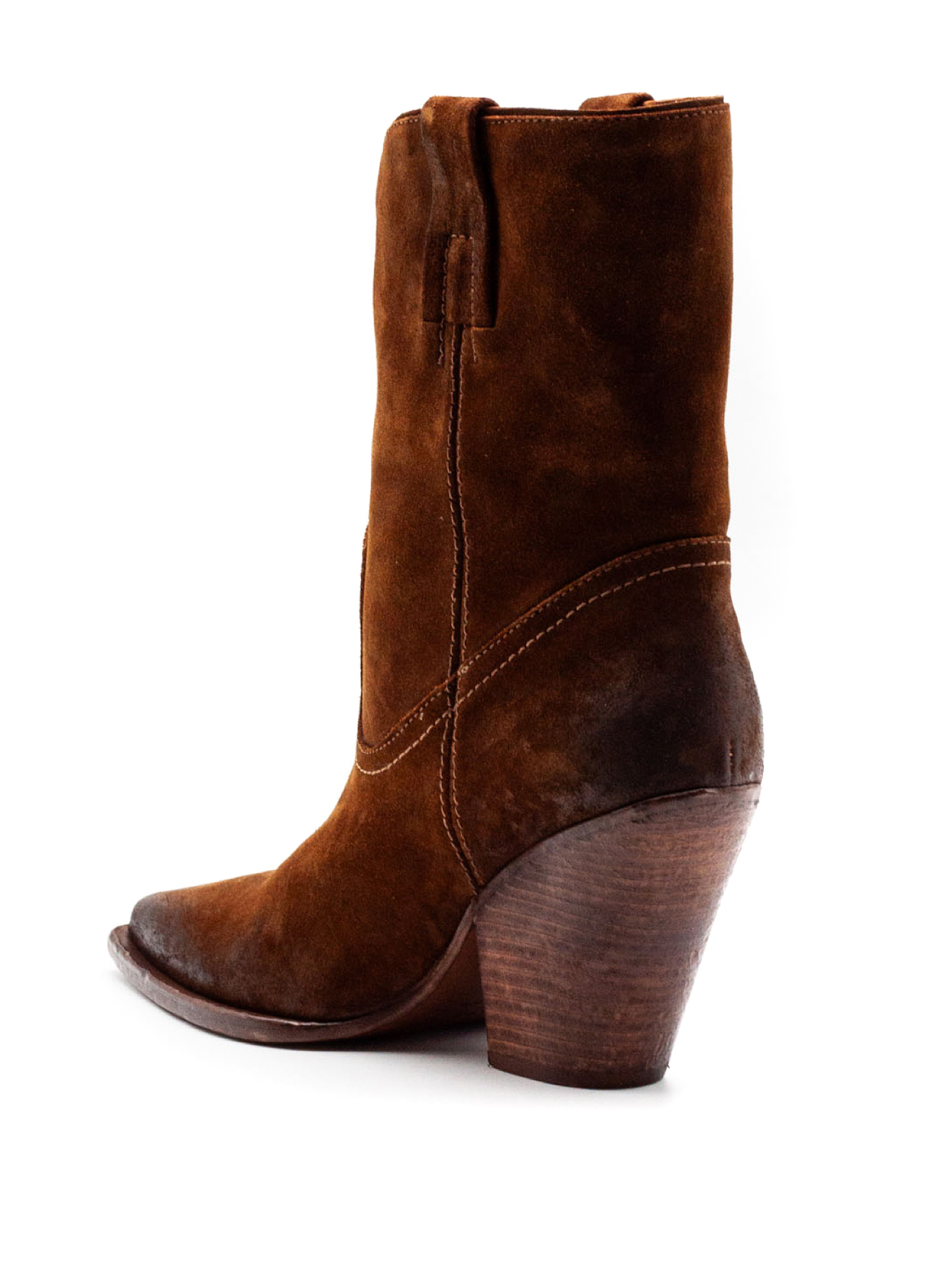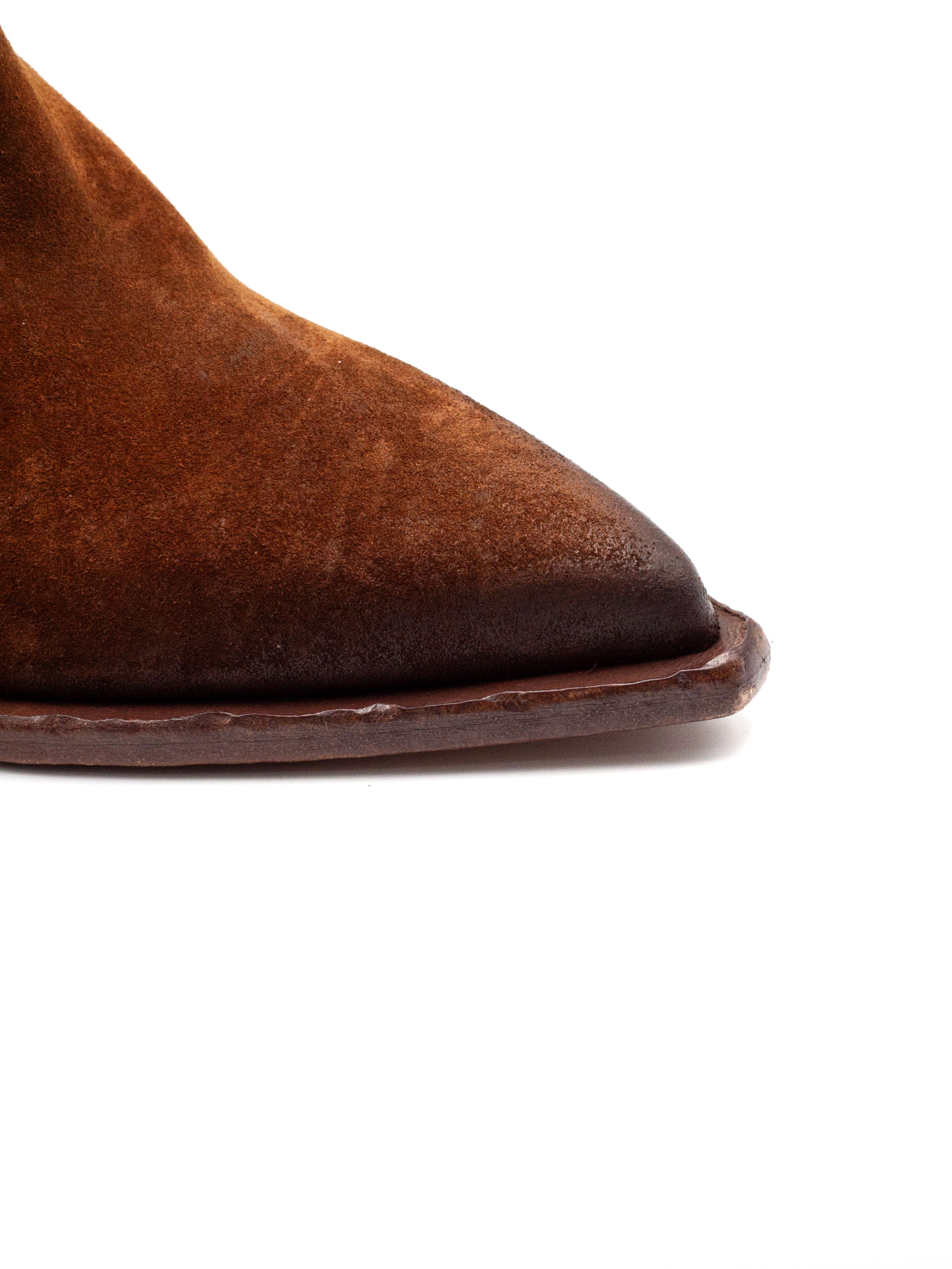 Stivaletto Texano in camoscio marrone con design a punta, effetto vintage fatto a mano, suola in cuoio con logo, altezza tacco 70mm