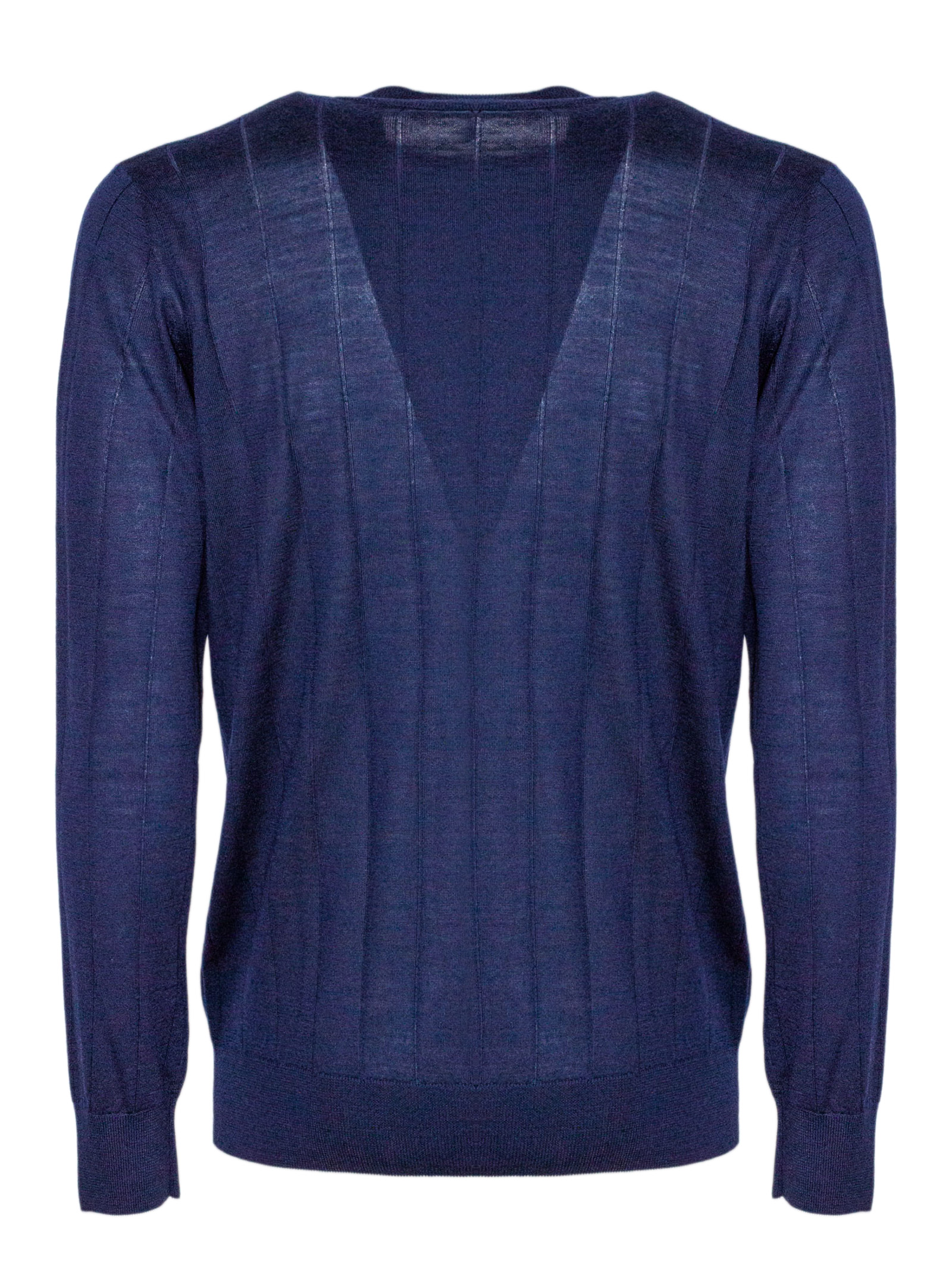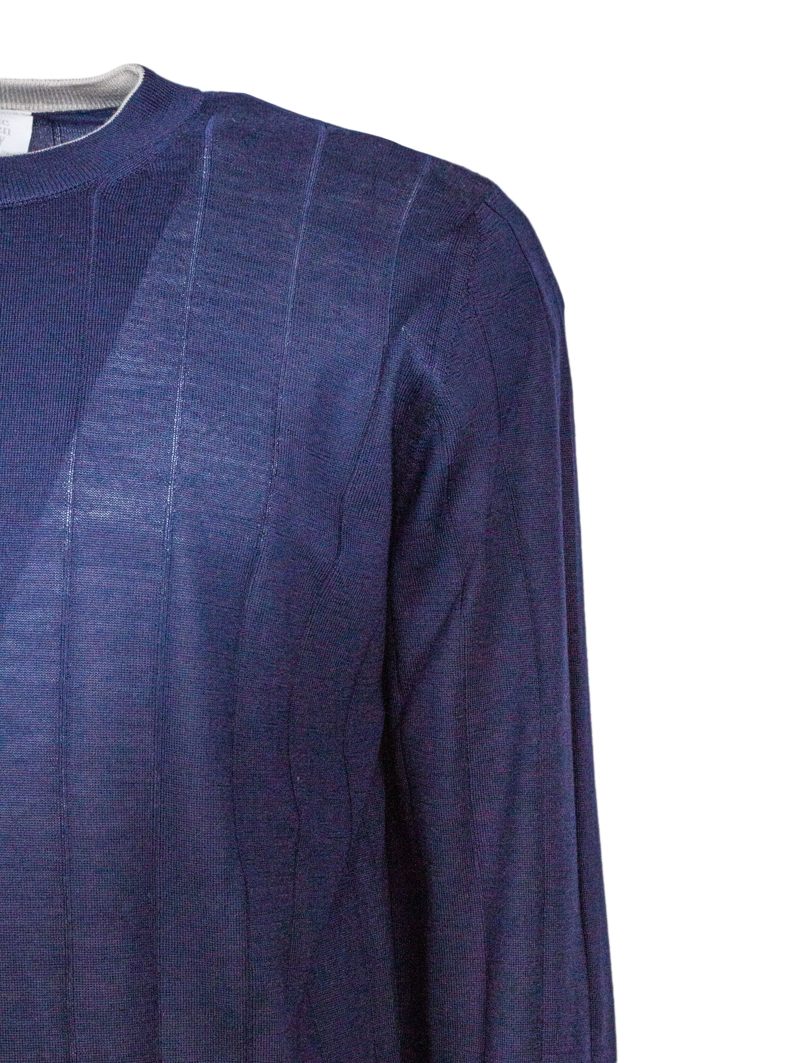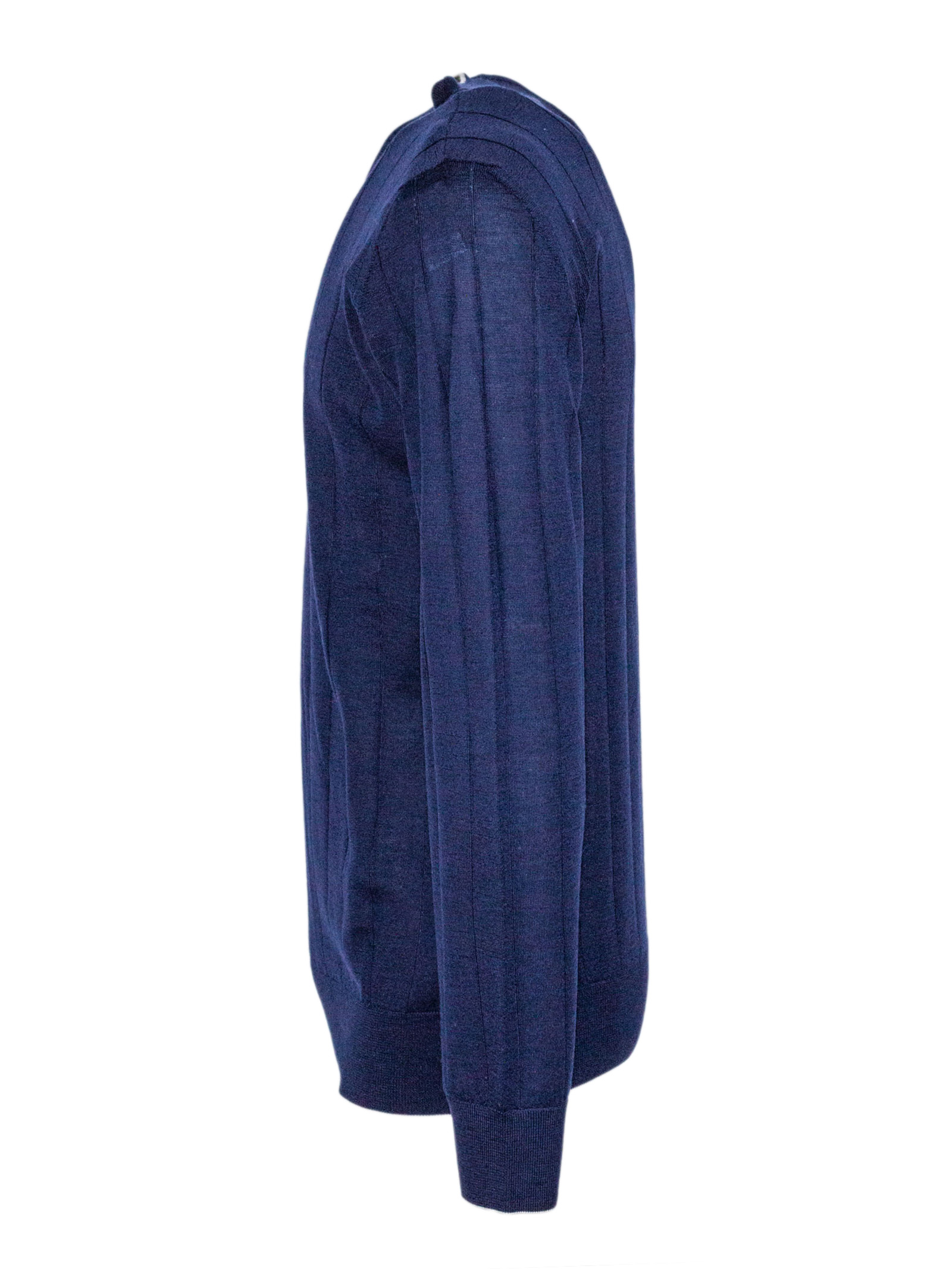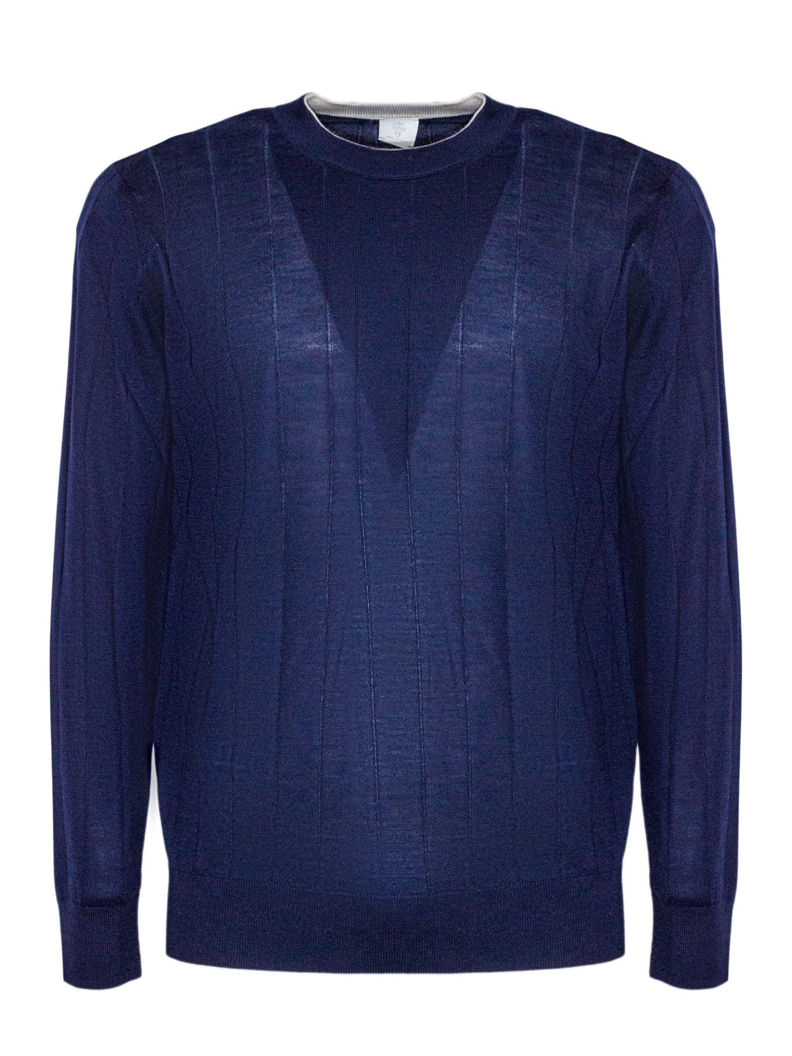 Maglia girocollo blu in maglia fine, lavorazione a coste verticali, vestibilità regolare, polsini e fondo a costine, 70% lana, 30% seta