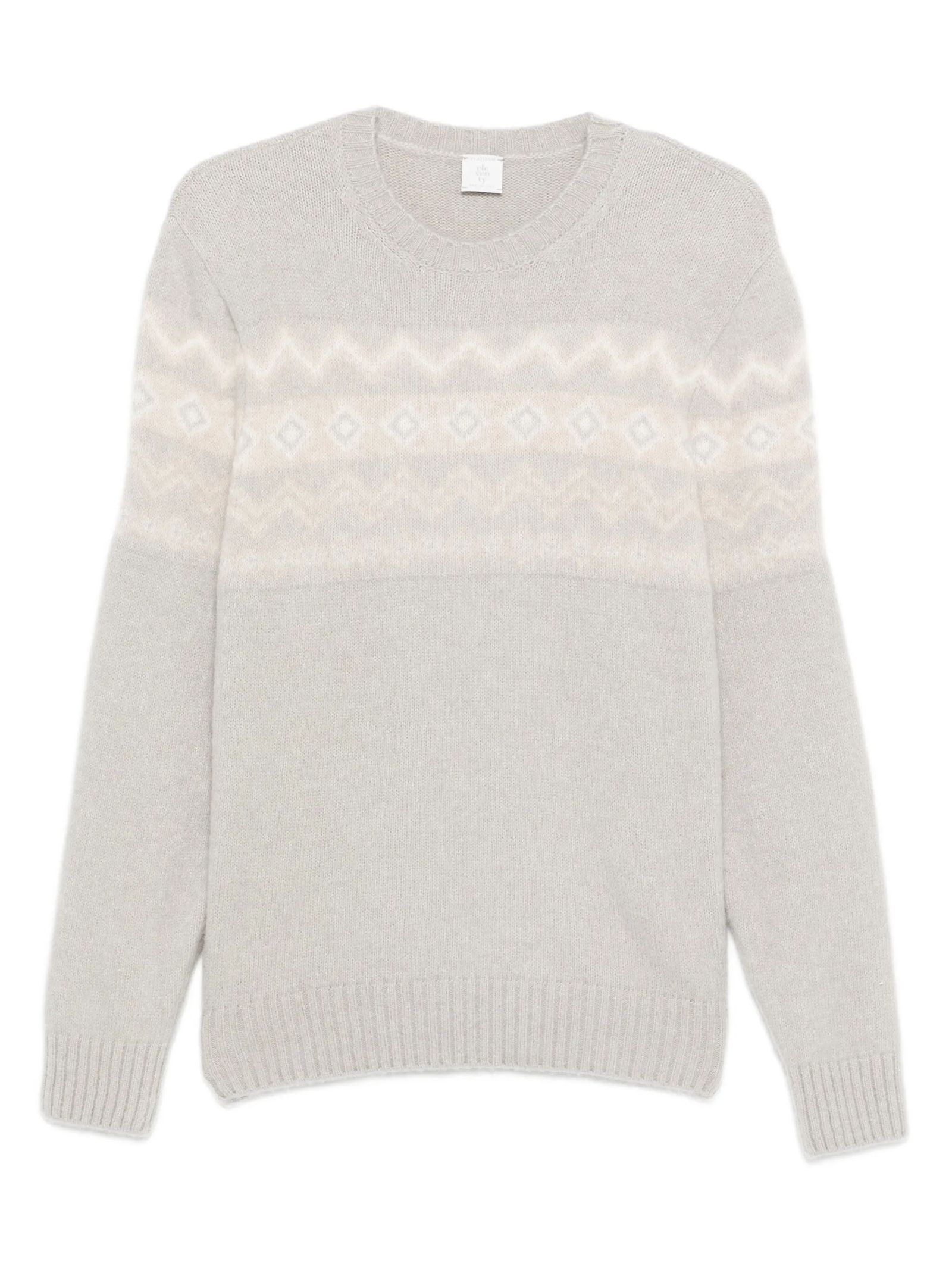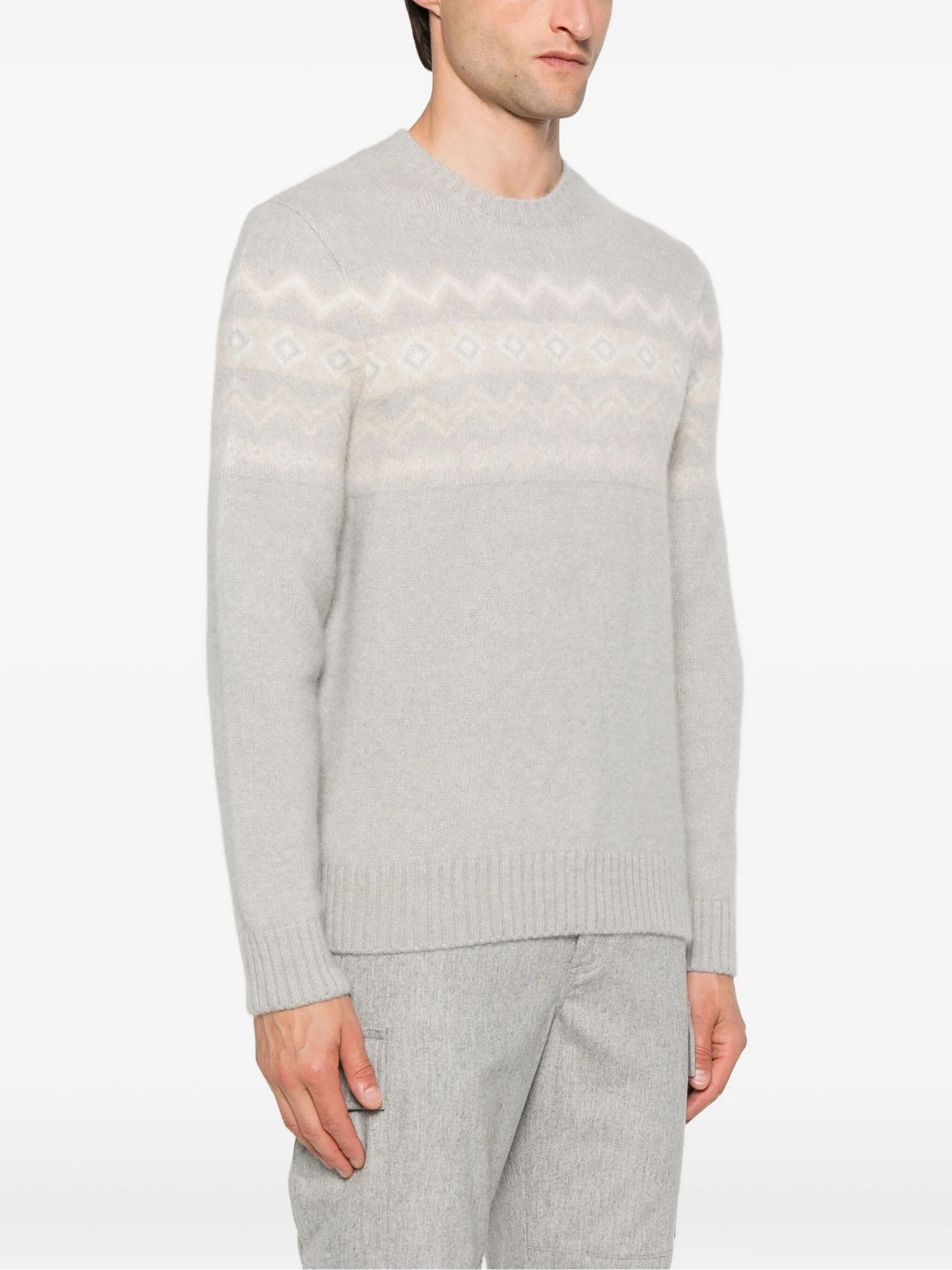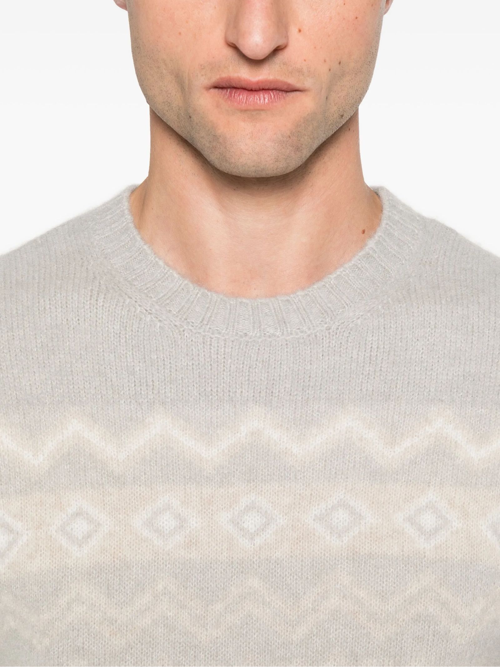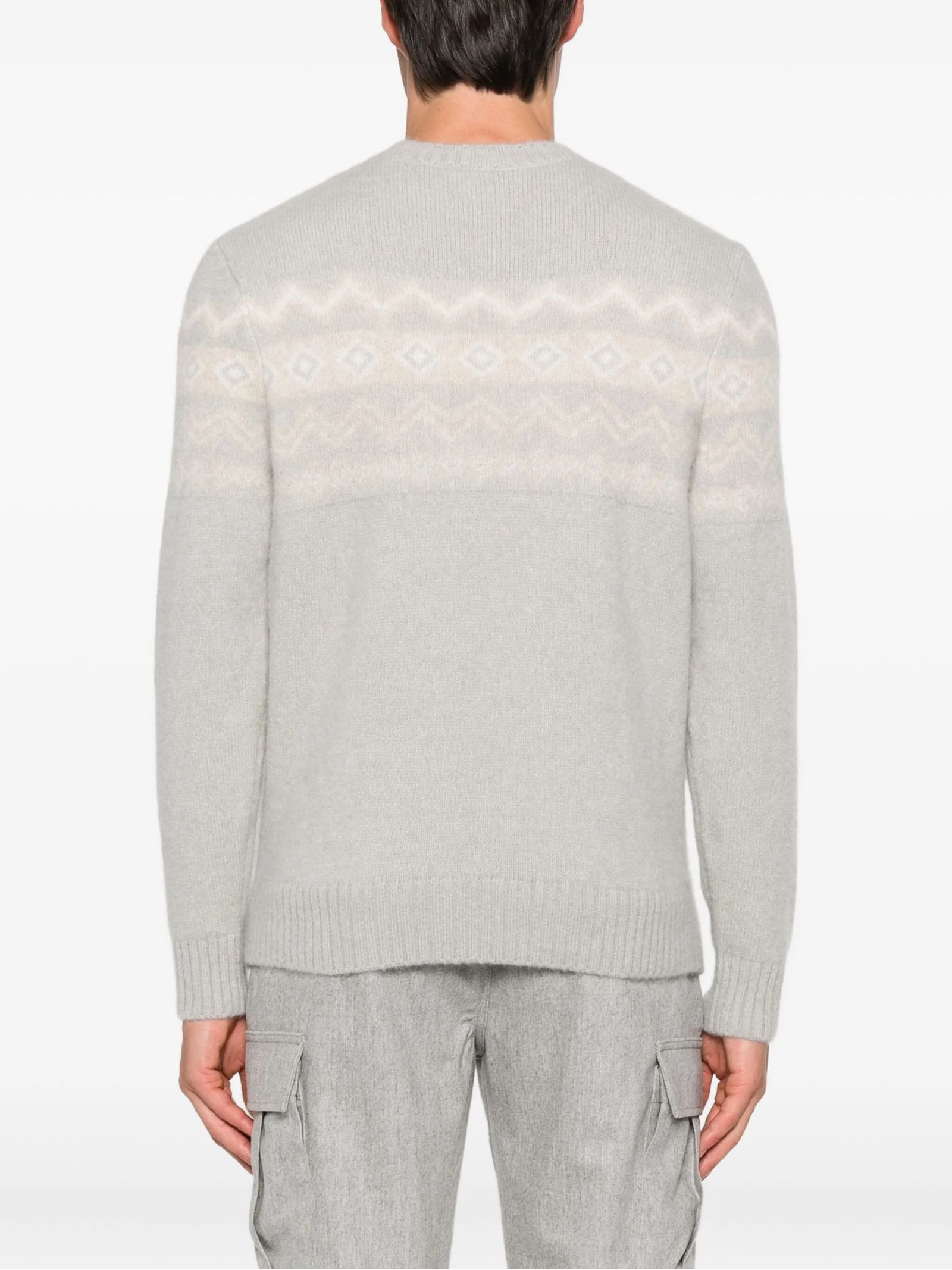 Maglione in misto cashmere e seta grigio, motivo jacquard, scollo rotondo, maniche lunghe, polsini a coste, orlo a coste