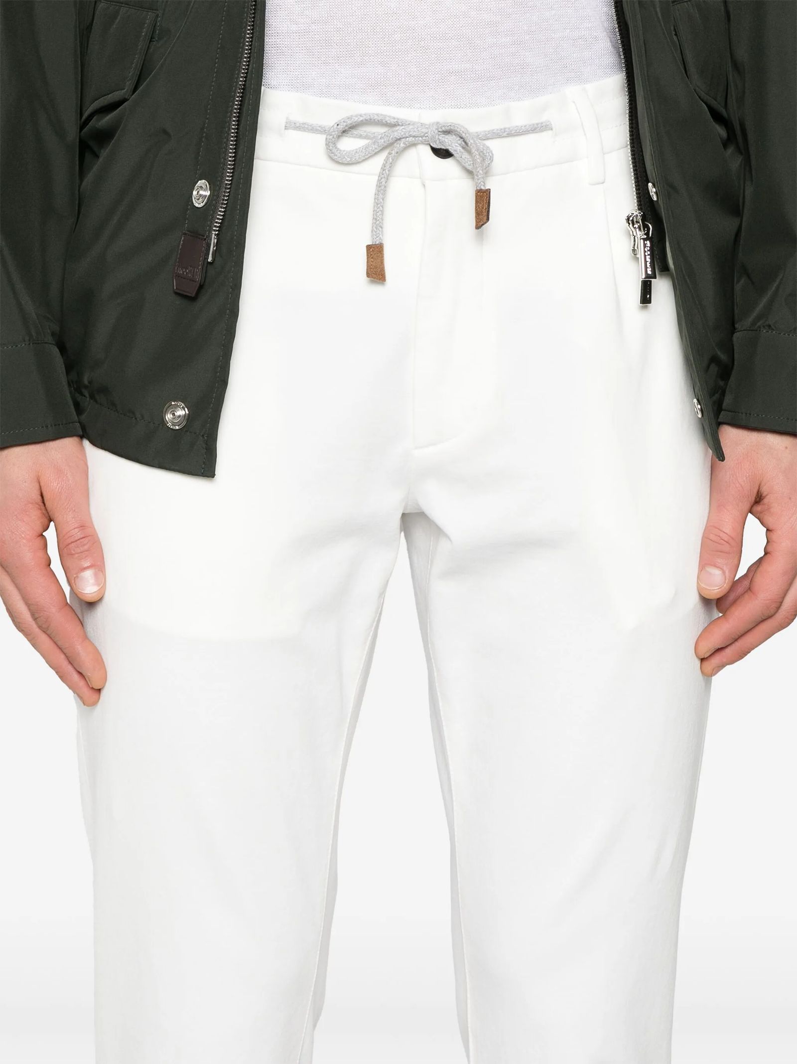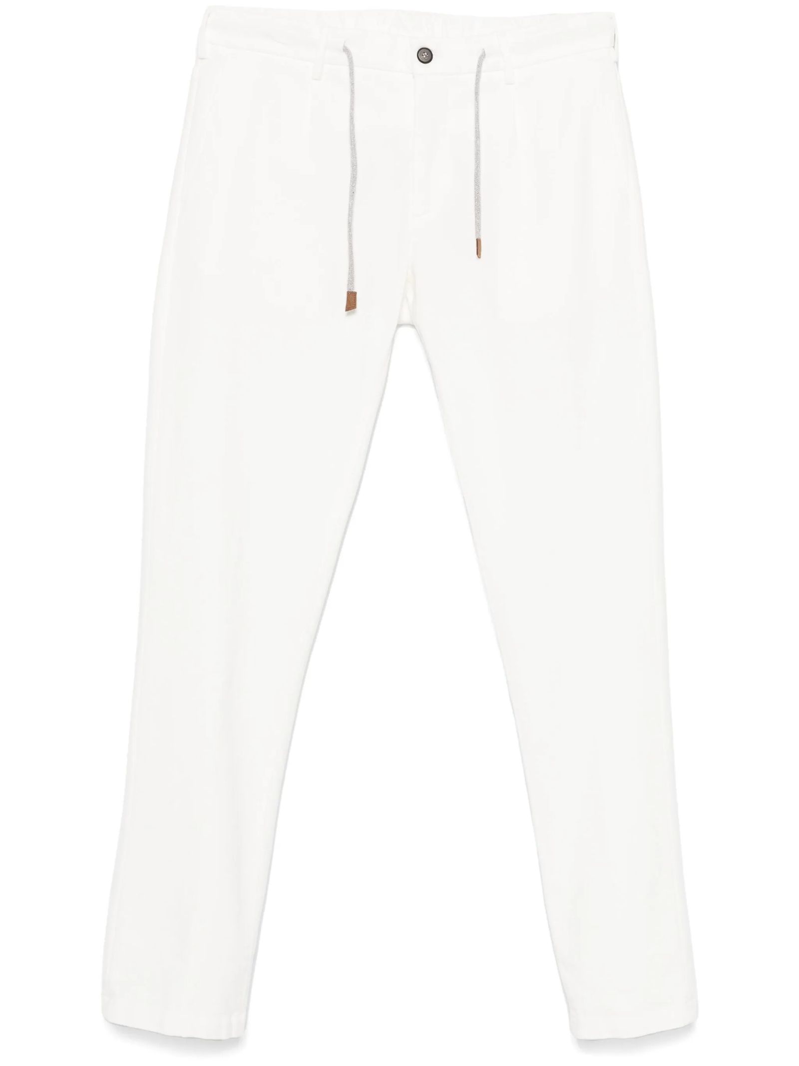 Pantaloni in cotone bianco, chiusura frontale con bottoni e zip, vita con coulisse, due tasche laterali oblique, due tasche posteriori con patta