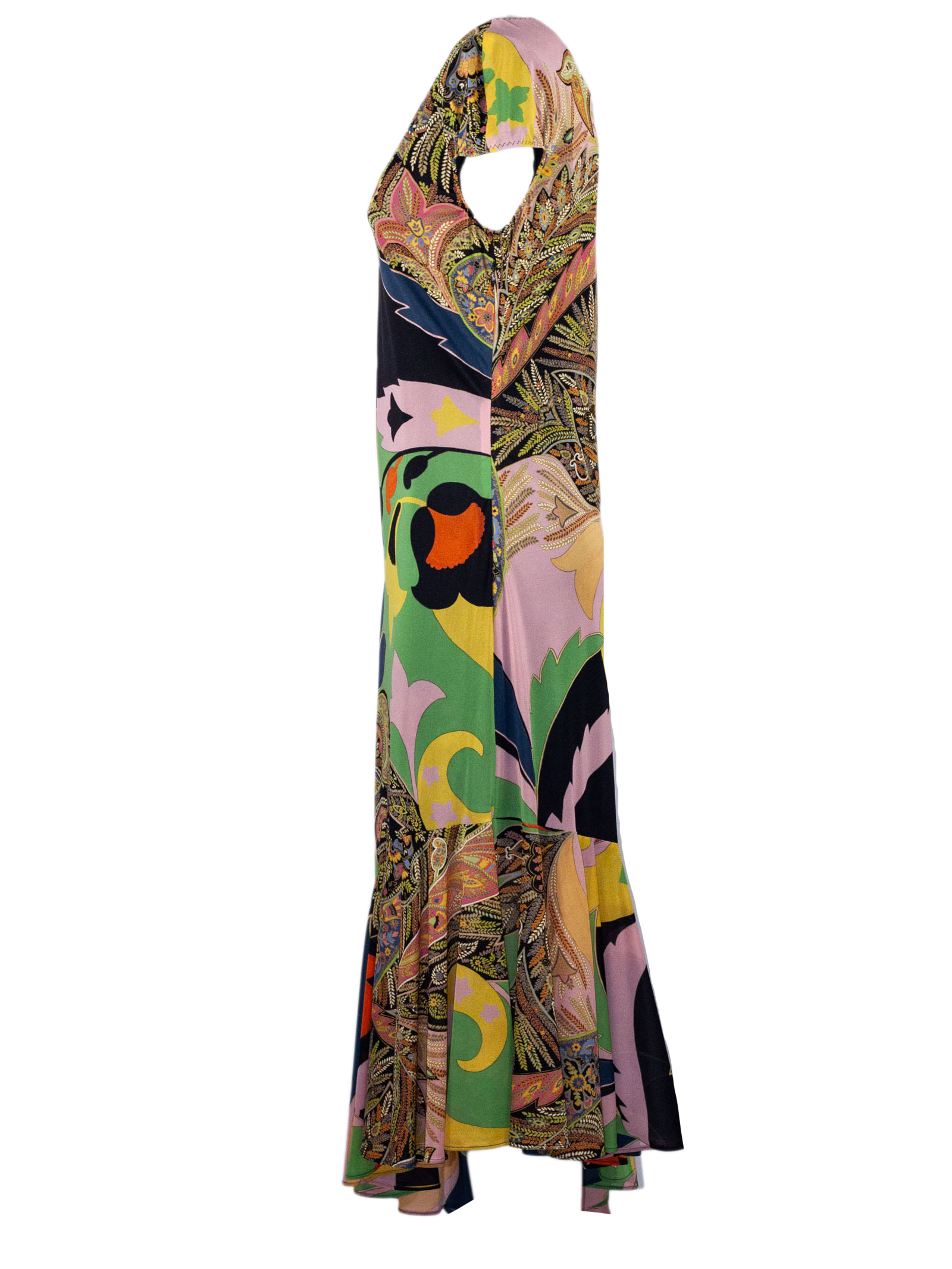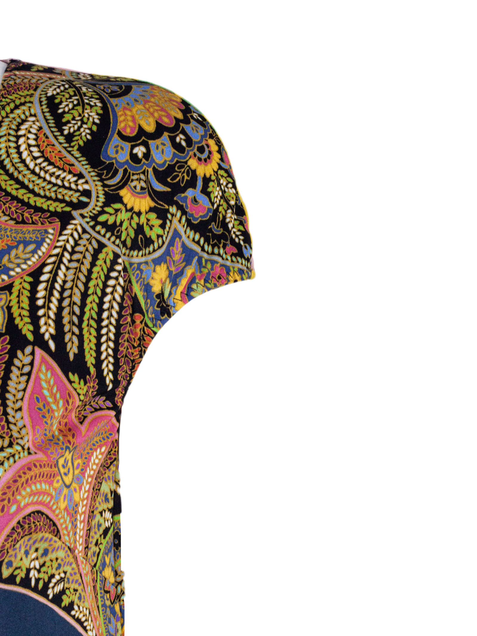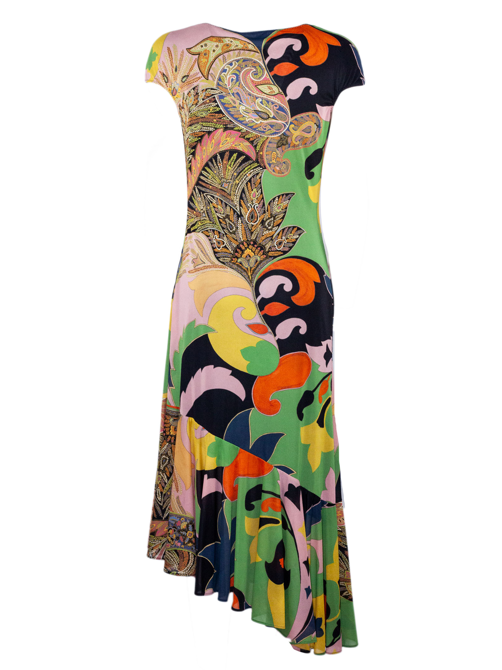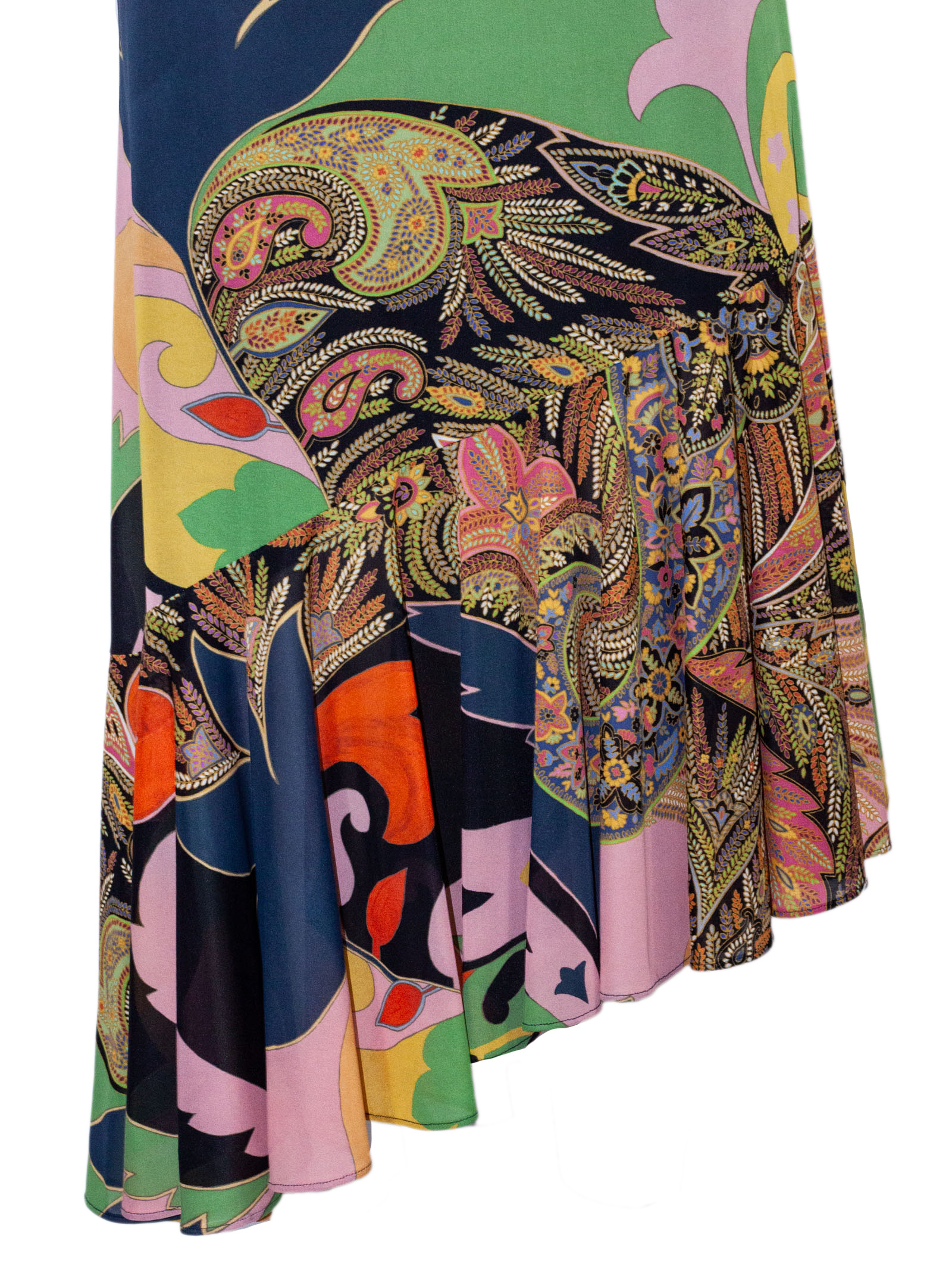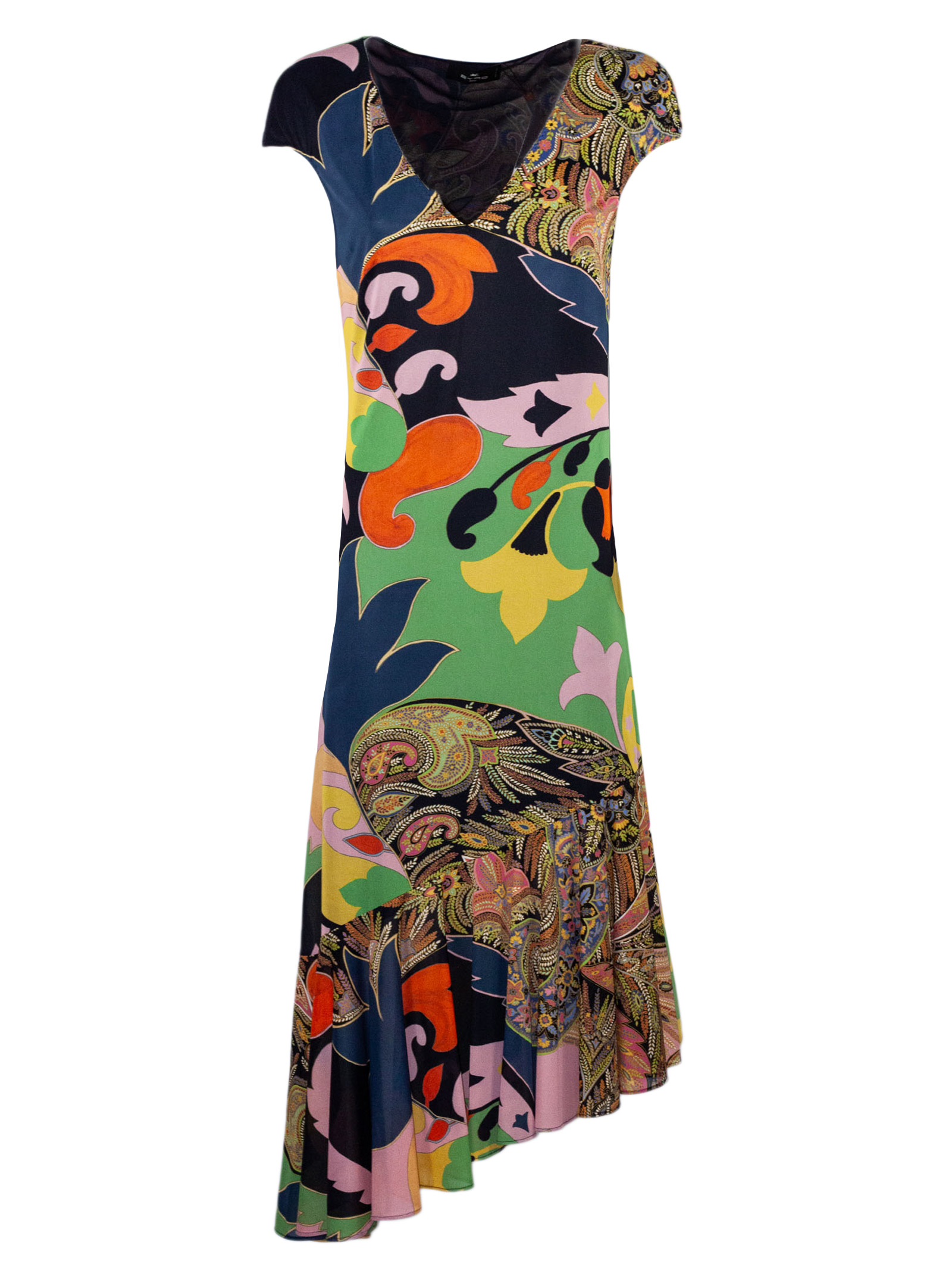 Abito midi stampa multicolor paisley e floreale, scollo ampio con inserto a triangolo, maniche corte, tessuto fluido, gonna asimmetrica con balza, vestibilità sagomata, chiusura pull-on