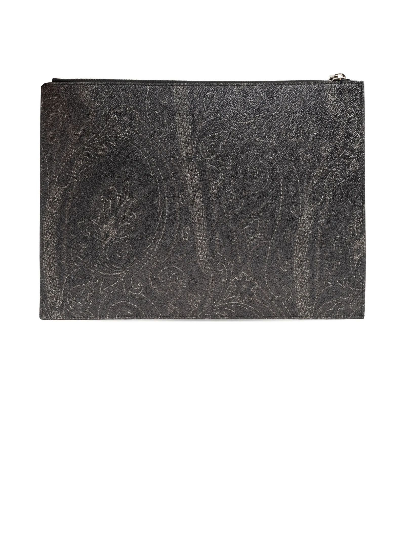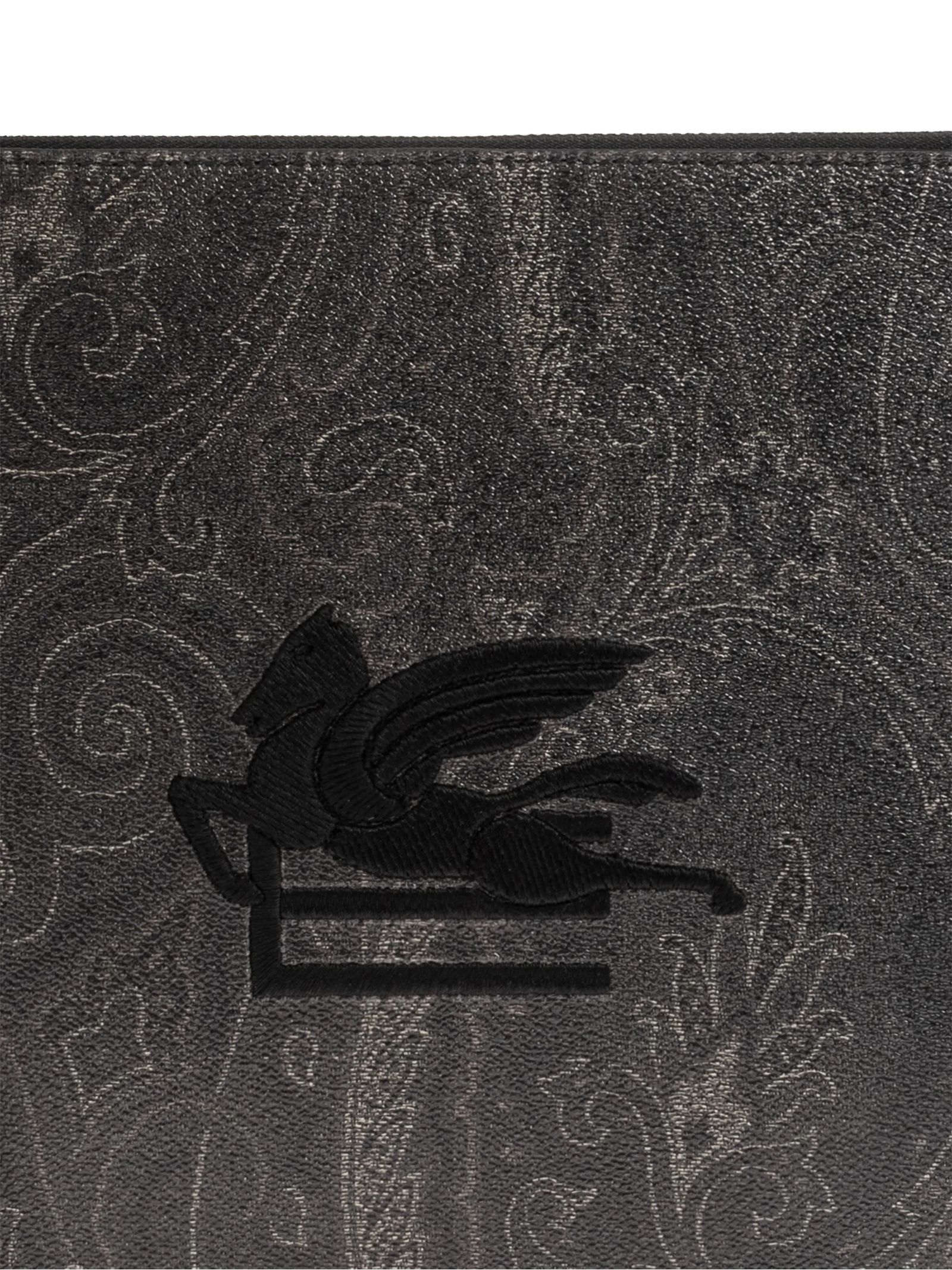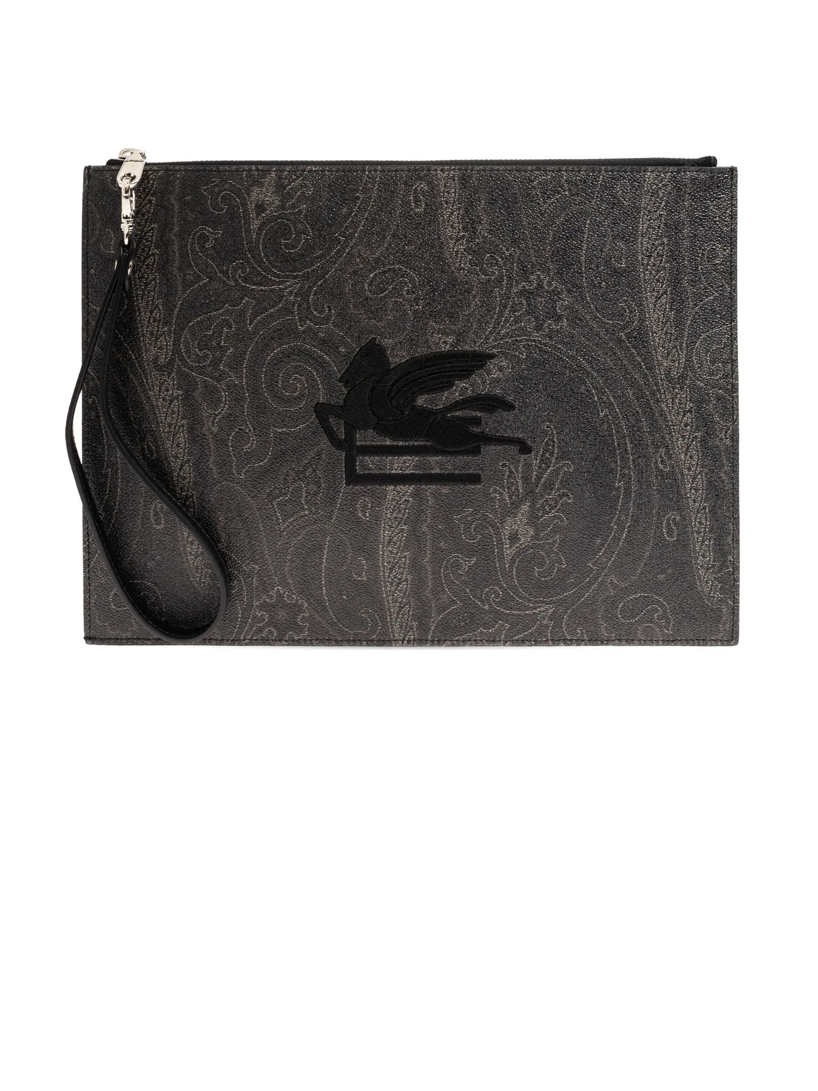 Clutch tessuto di cotone Paisley jacquard spalmato con grana opaca e doppiato in tela, ricamo con logo, cinturino da polso, chiusura con zip, tasca interna a soffietto, Profondità 1 cm, Altezza 22 cm, Larghezza 30 cm