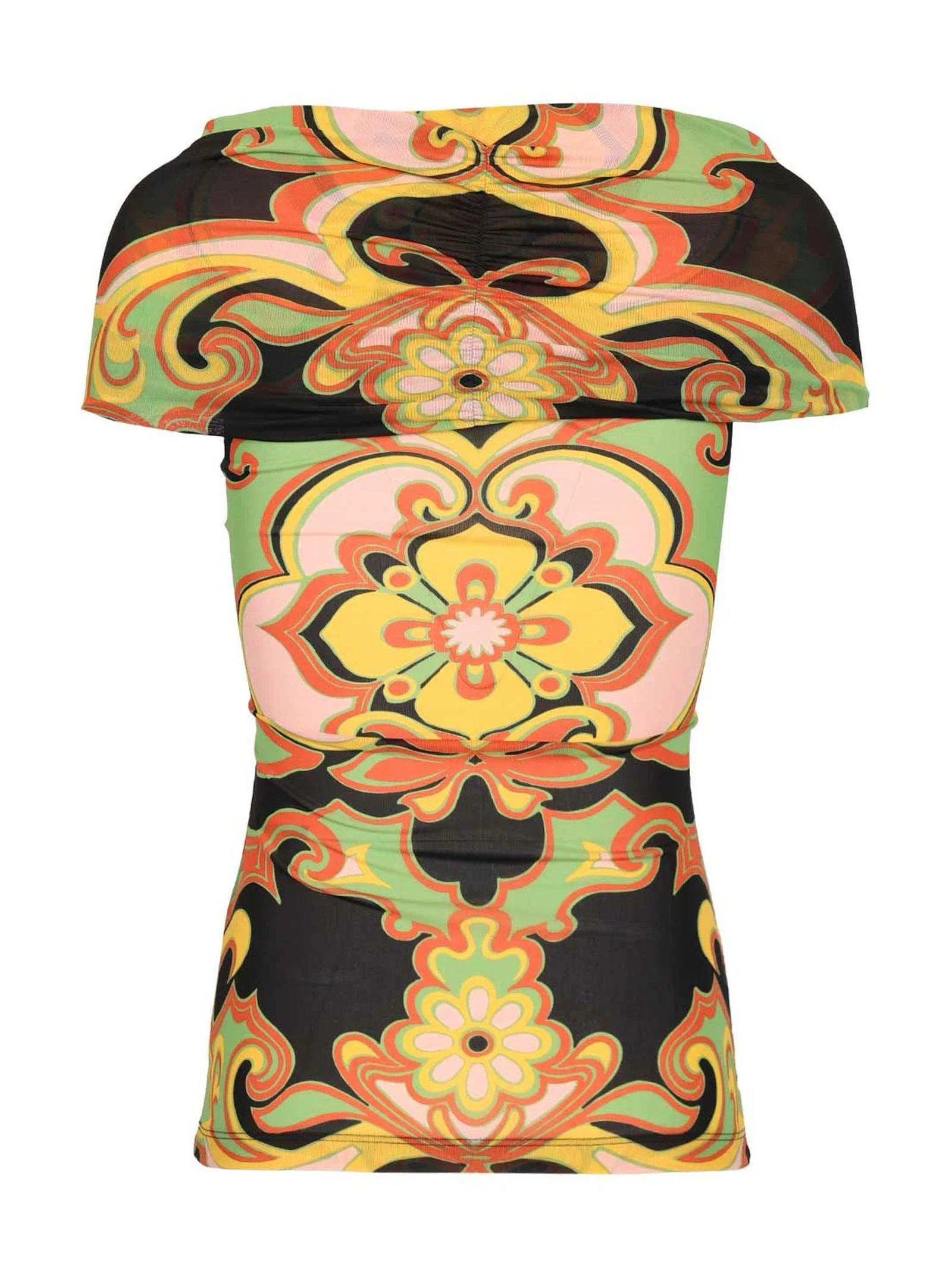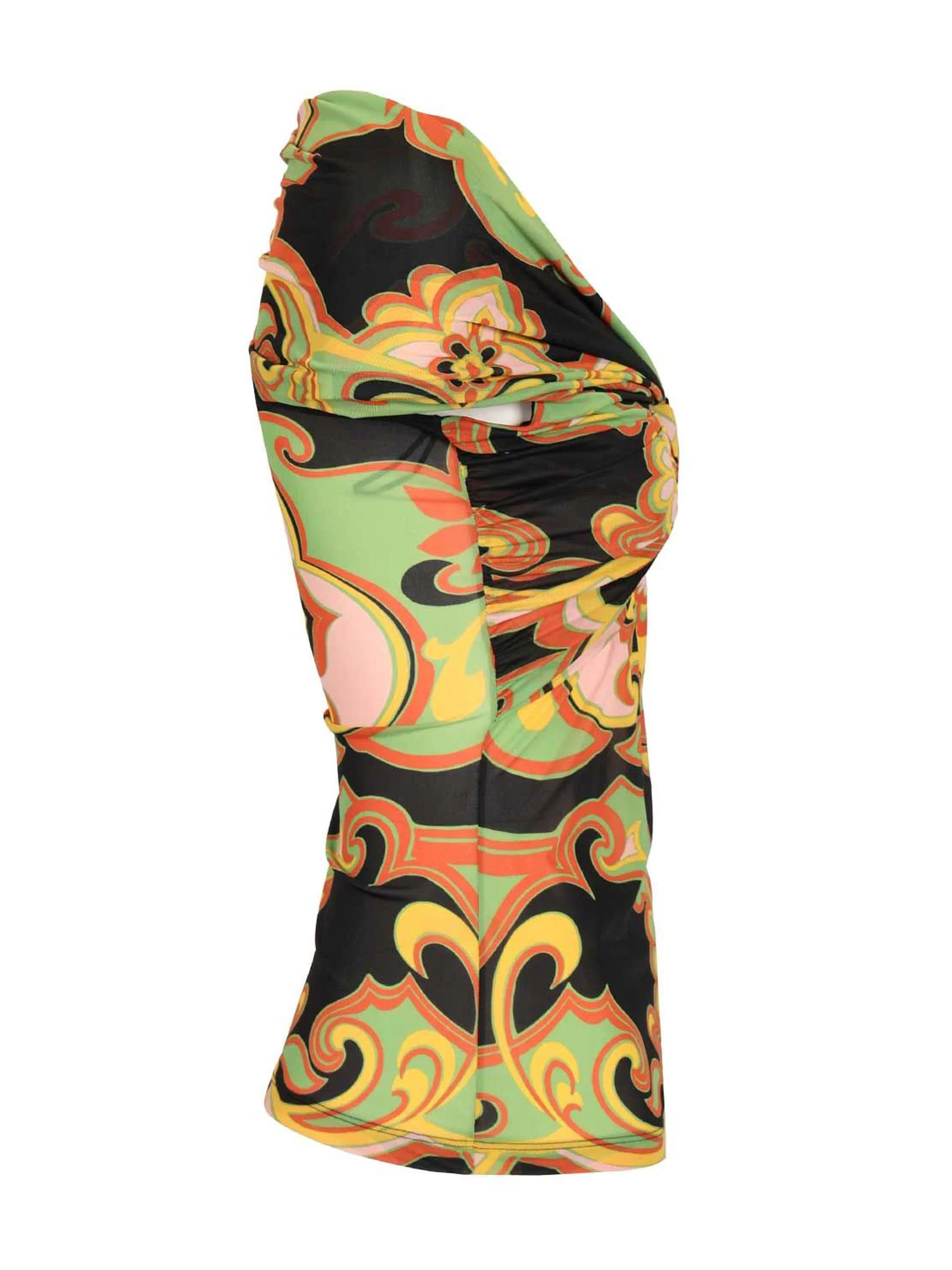 Top in tessuto elasticizzato stampa floreale e geometrica nei toni del verde, giallo, arancio e nero, scollo ampio con raffinato drappeggio e nodo frontale, maniche corte, vestibilità aderente