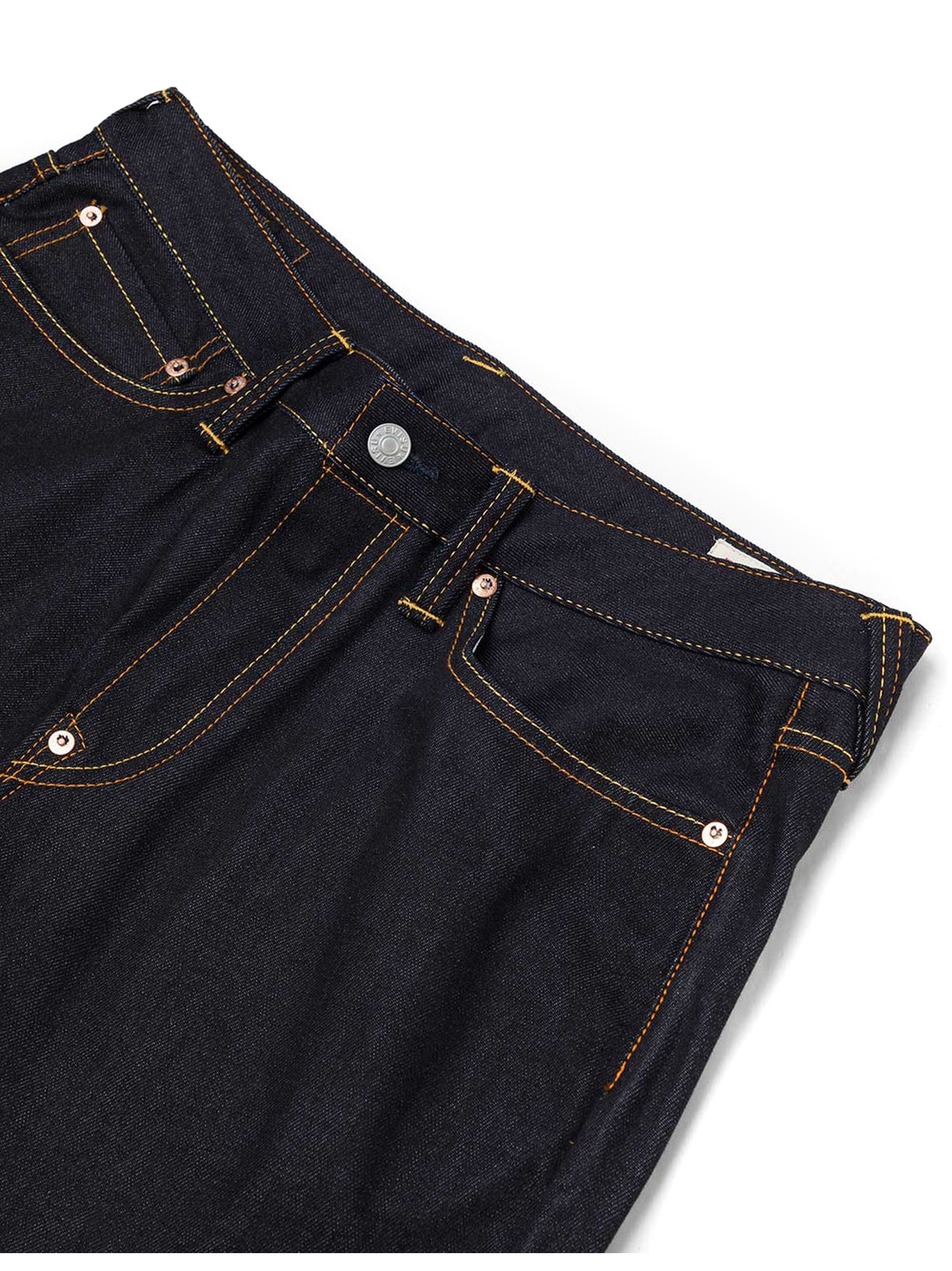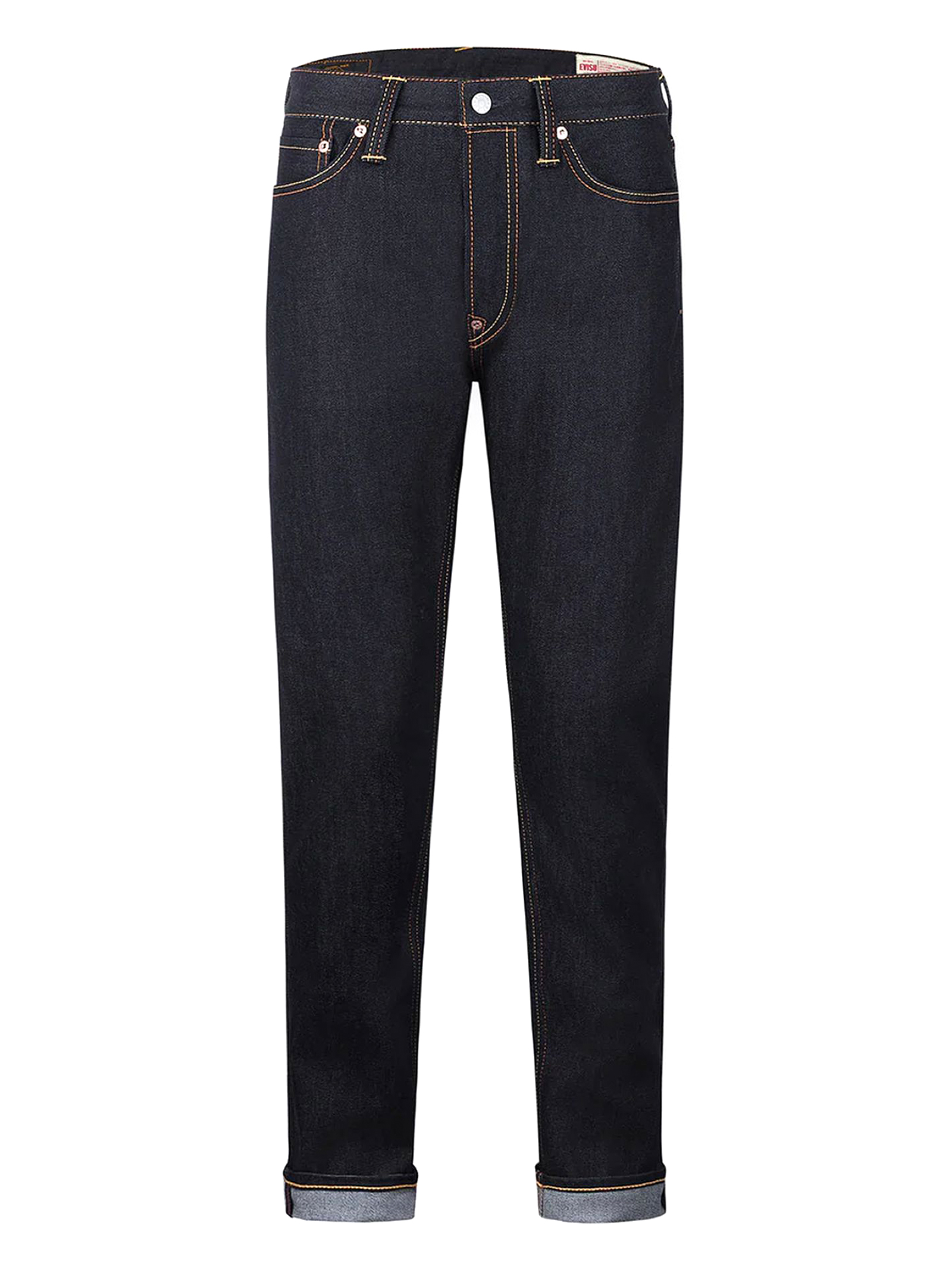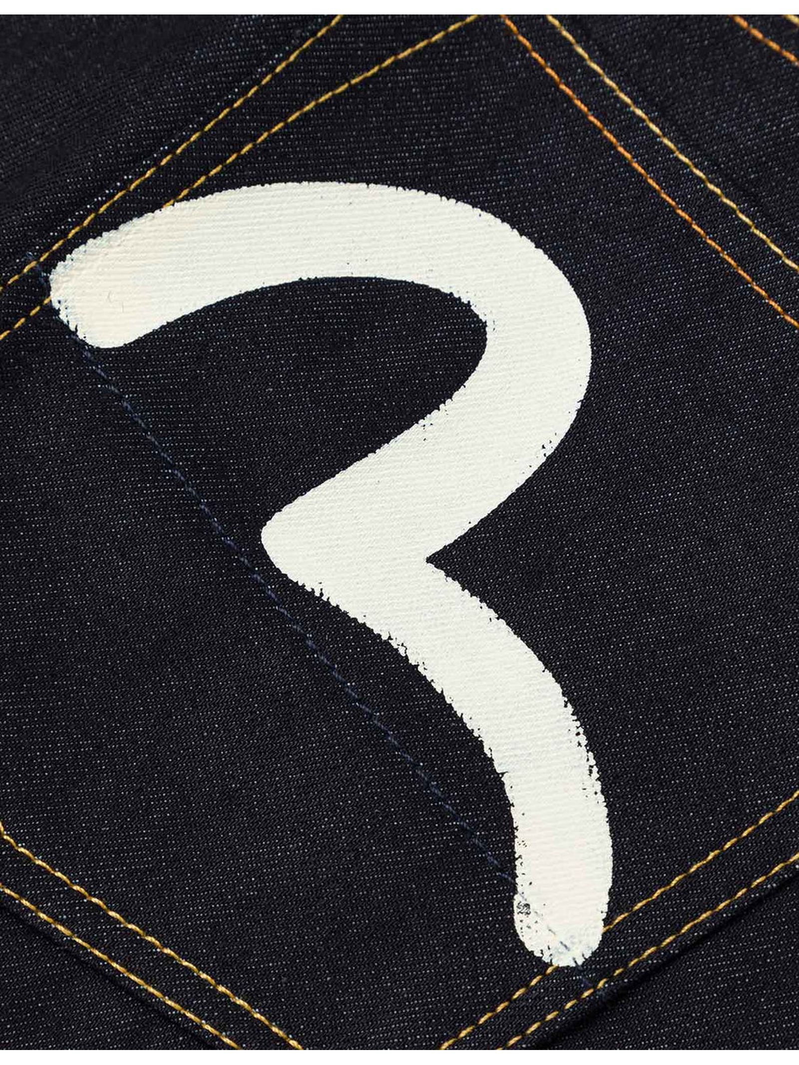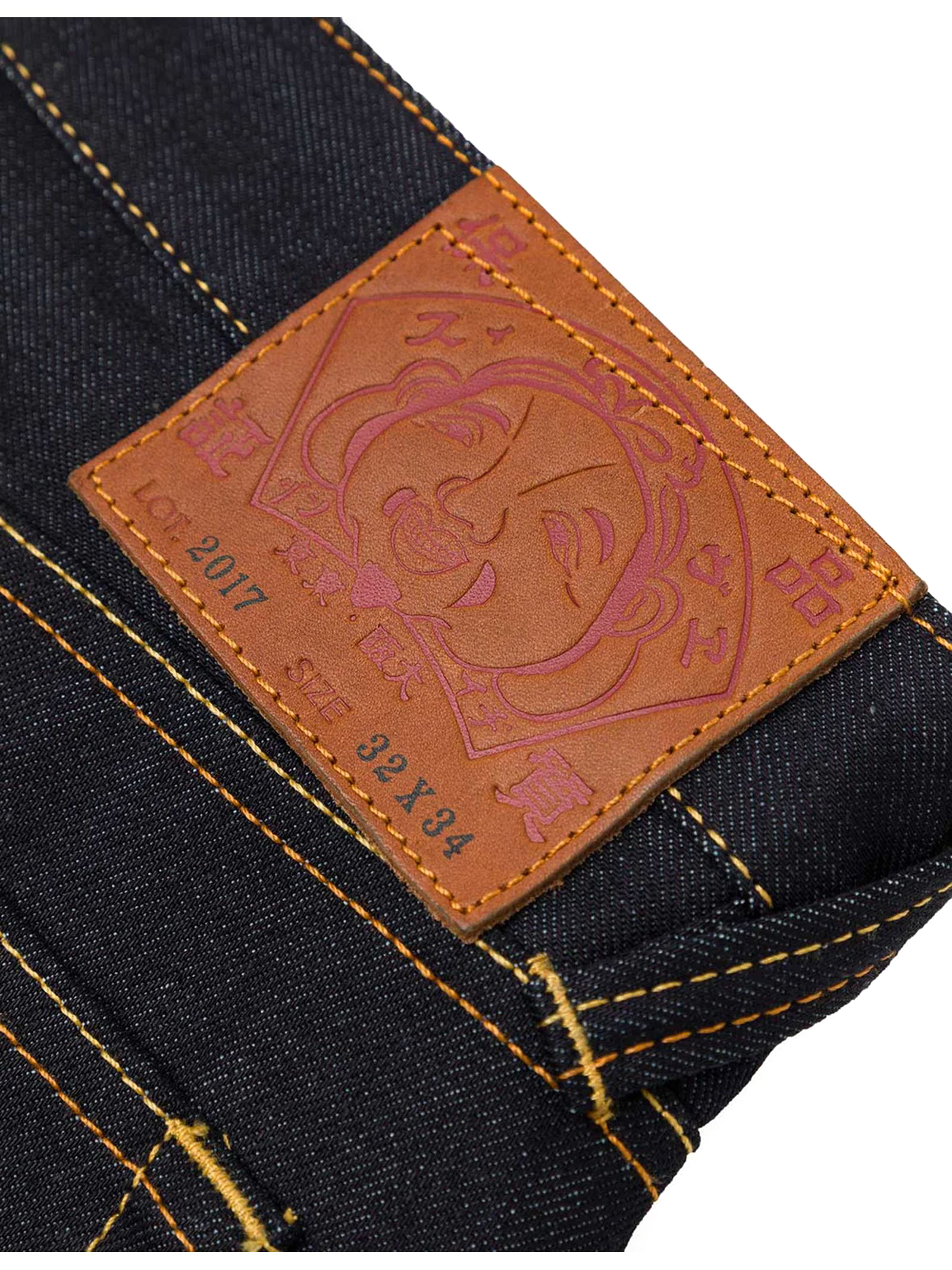 Jeans in denim di cotone indaco con stampa gabbiano, chiusura con cerniera, 5 tasche, toppa in pelle Godhead, vestibilità affusolata