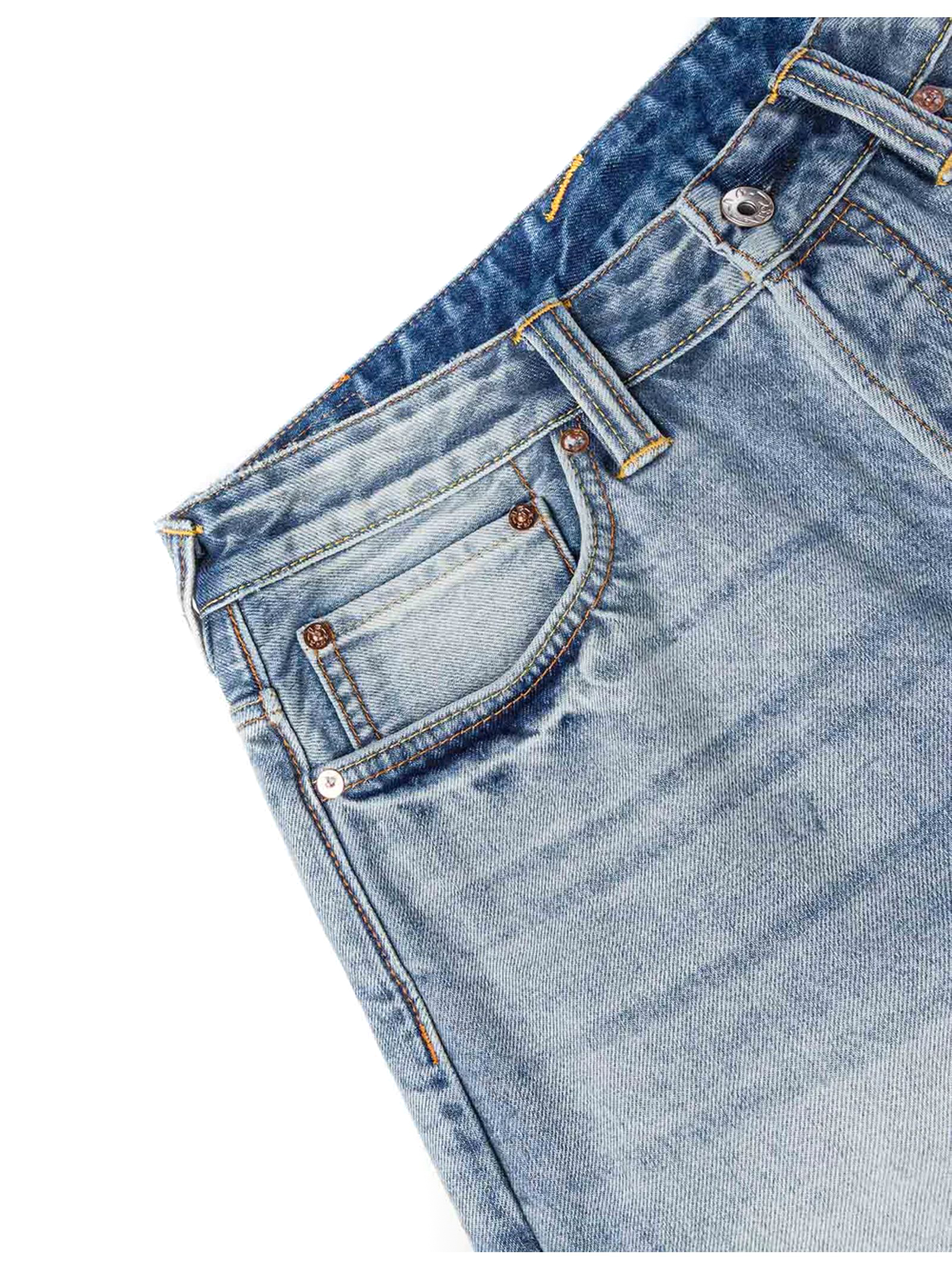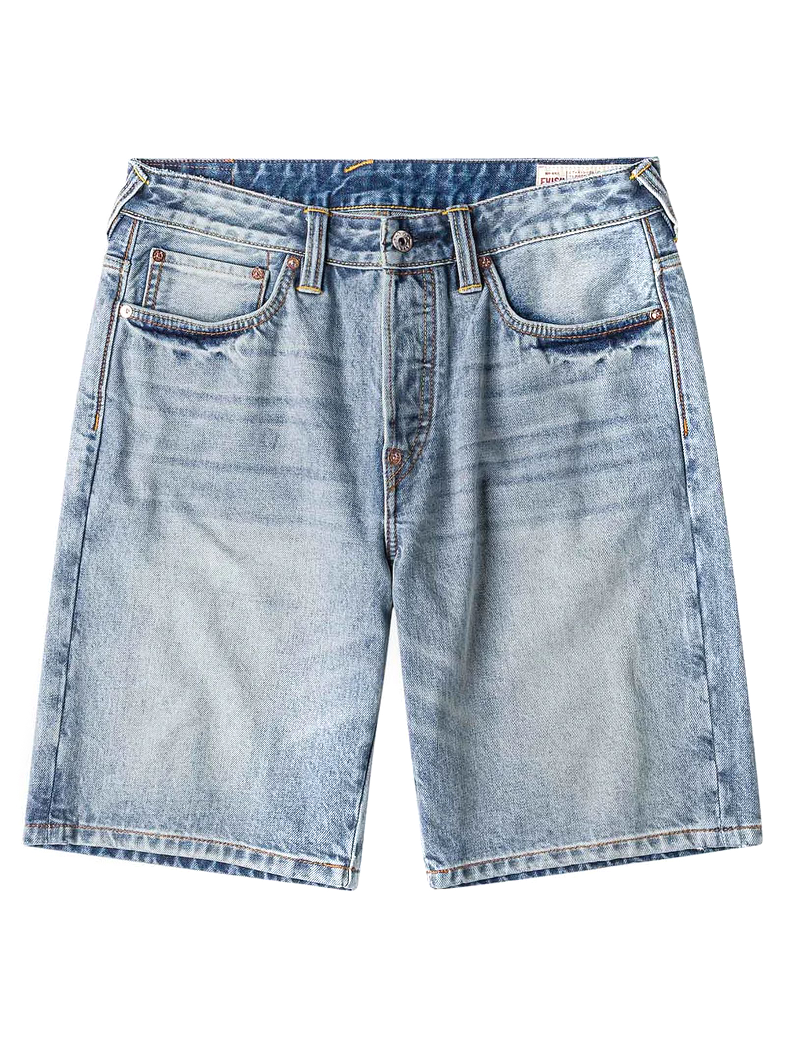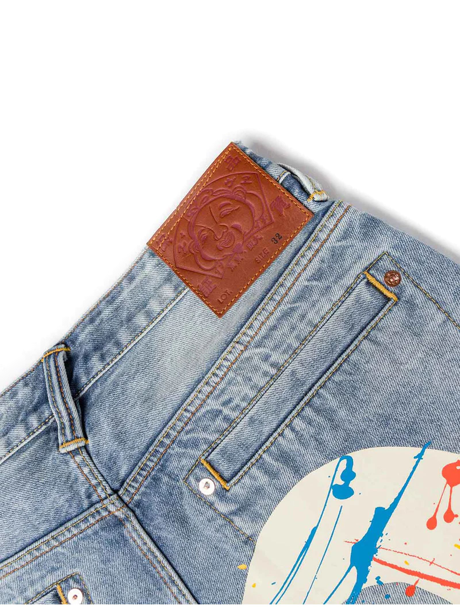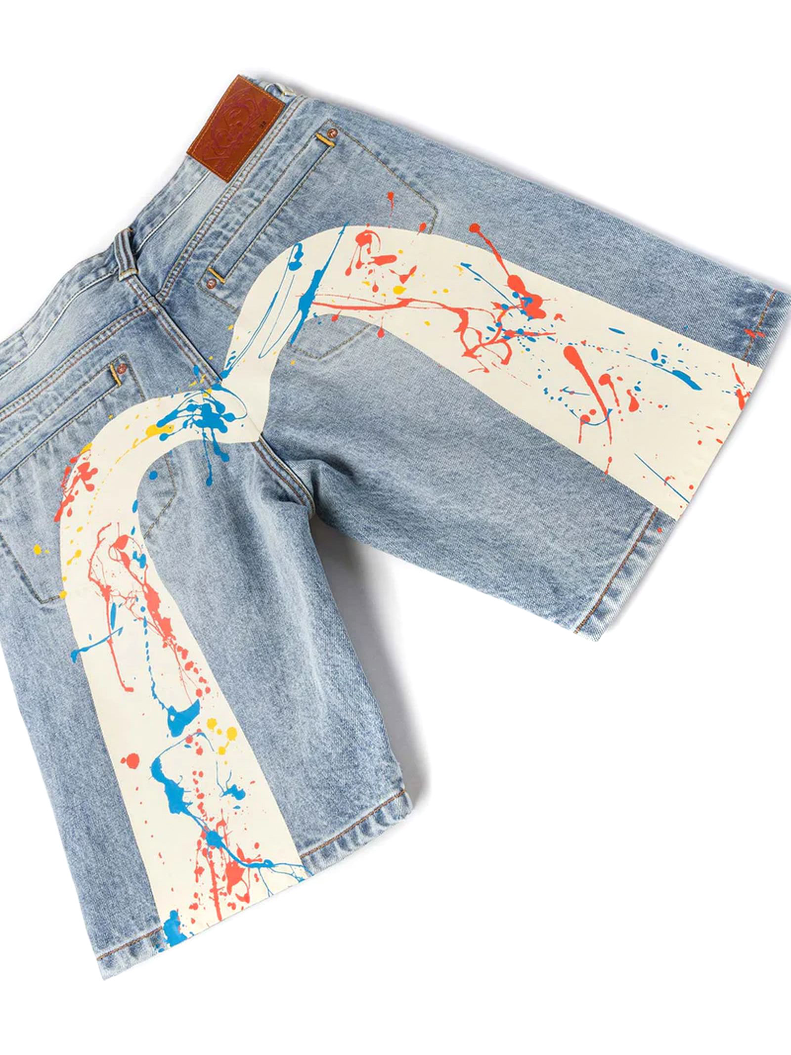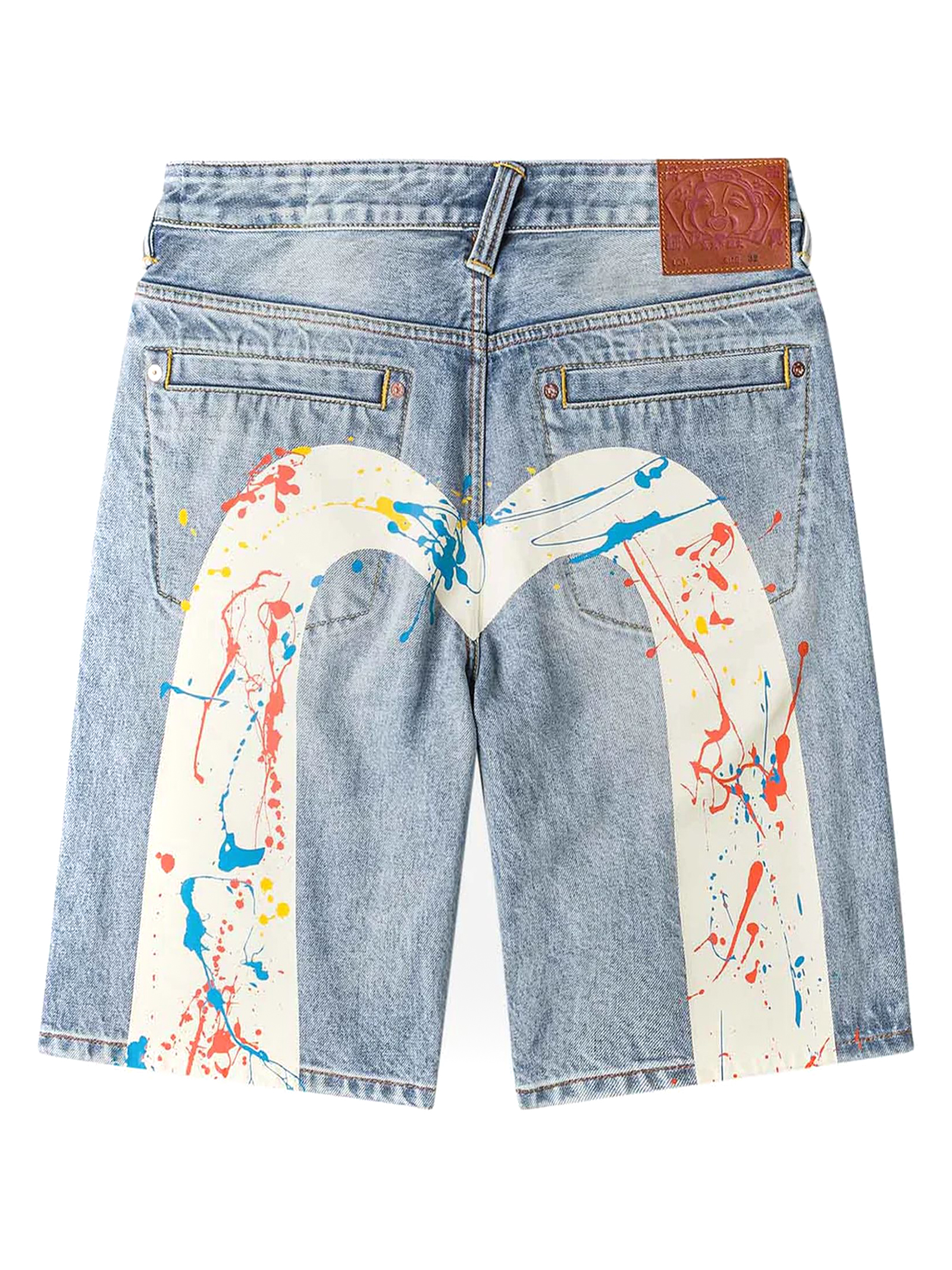 Shorts in denim Daicock con stampa spray, vestibilità regolare, tessuto esterno, 100% cotone, tasche 87% poliestere, 13% cotone, stampa con motivo Daicock e effetto spray multicolore, chiusura con bottoni, 5 tasche