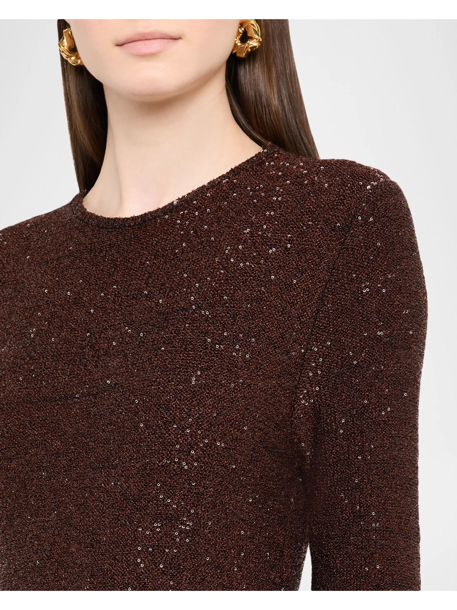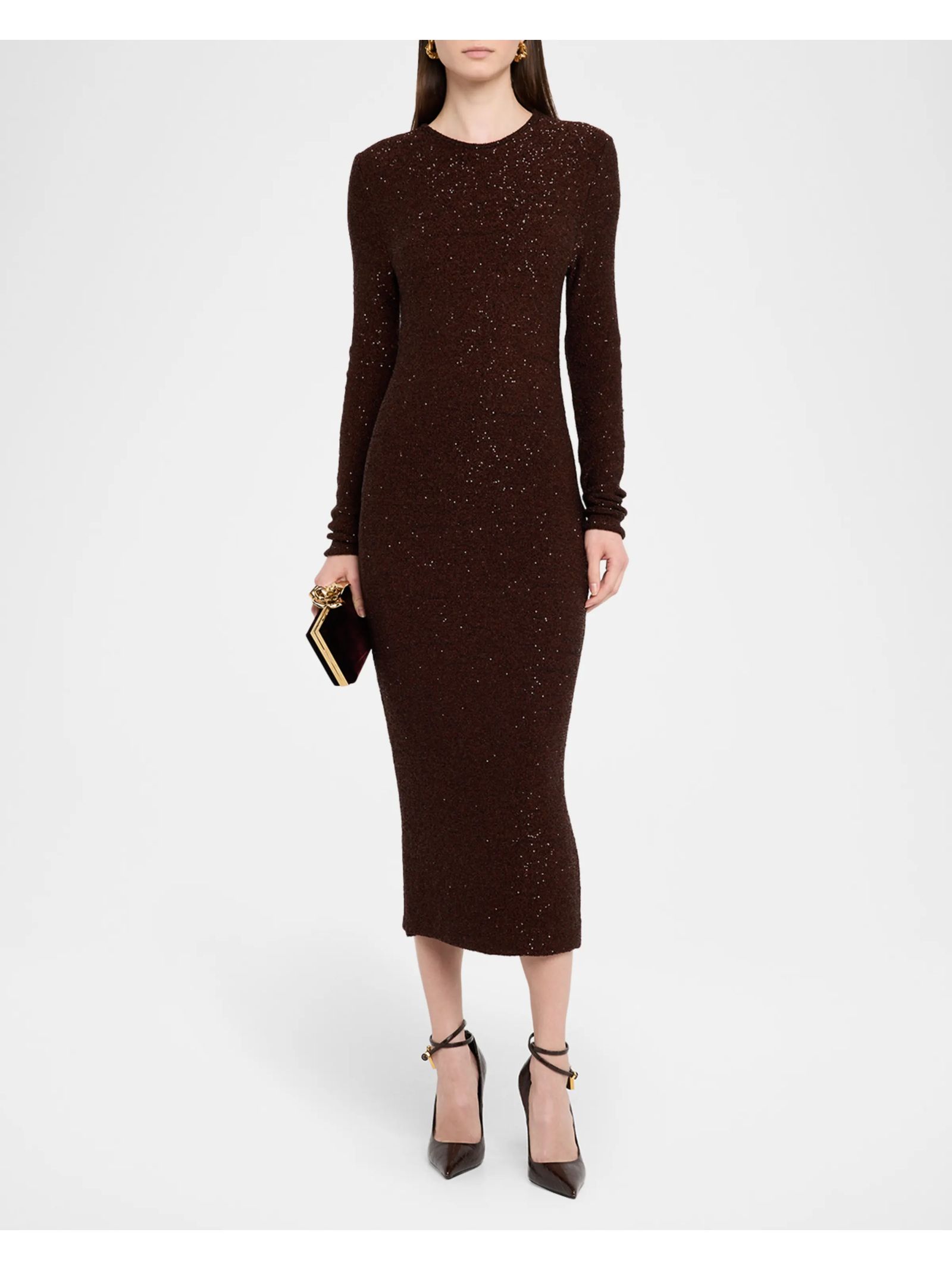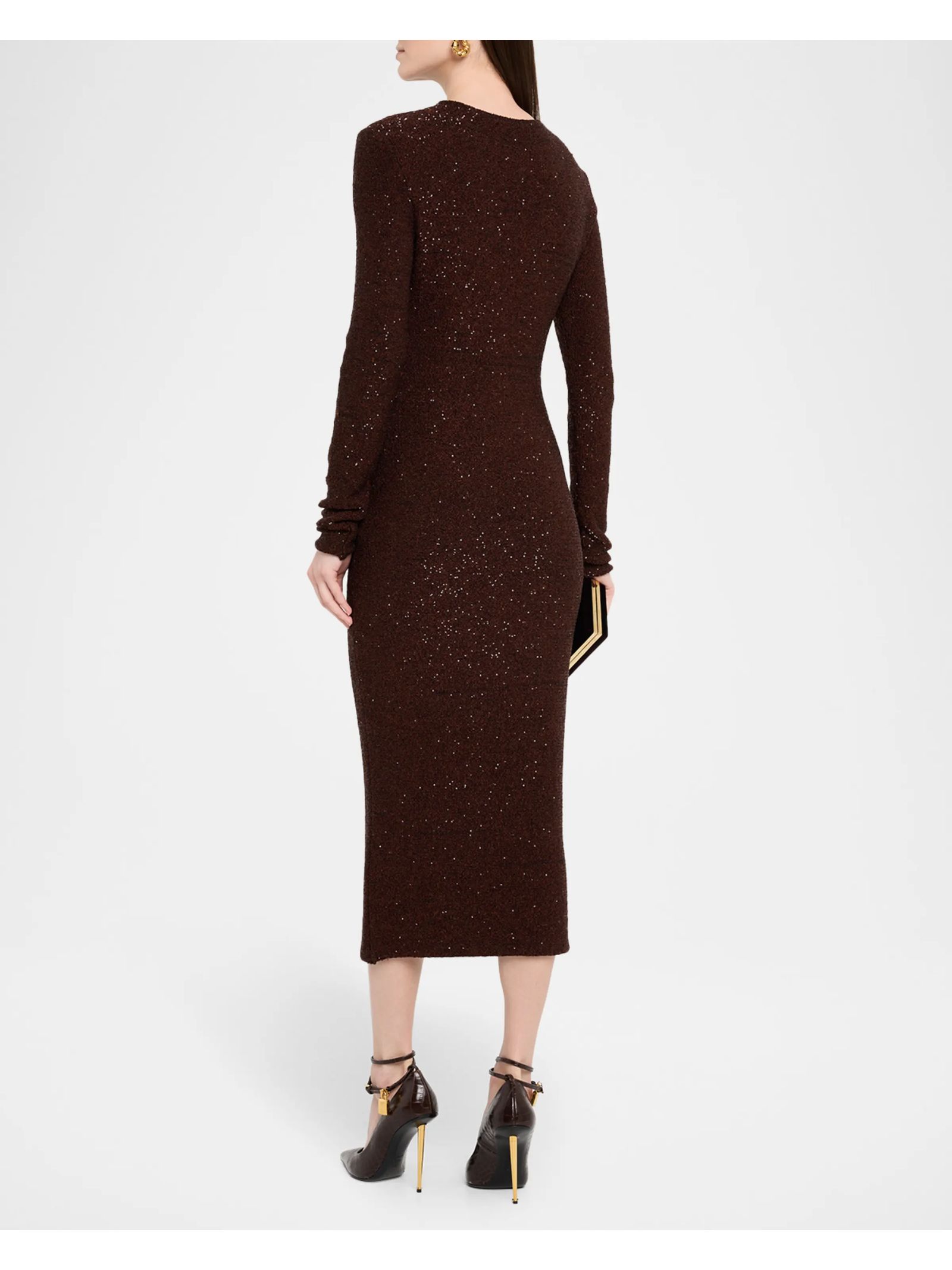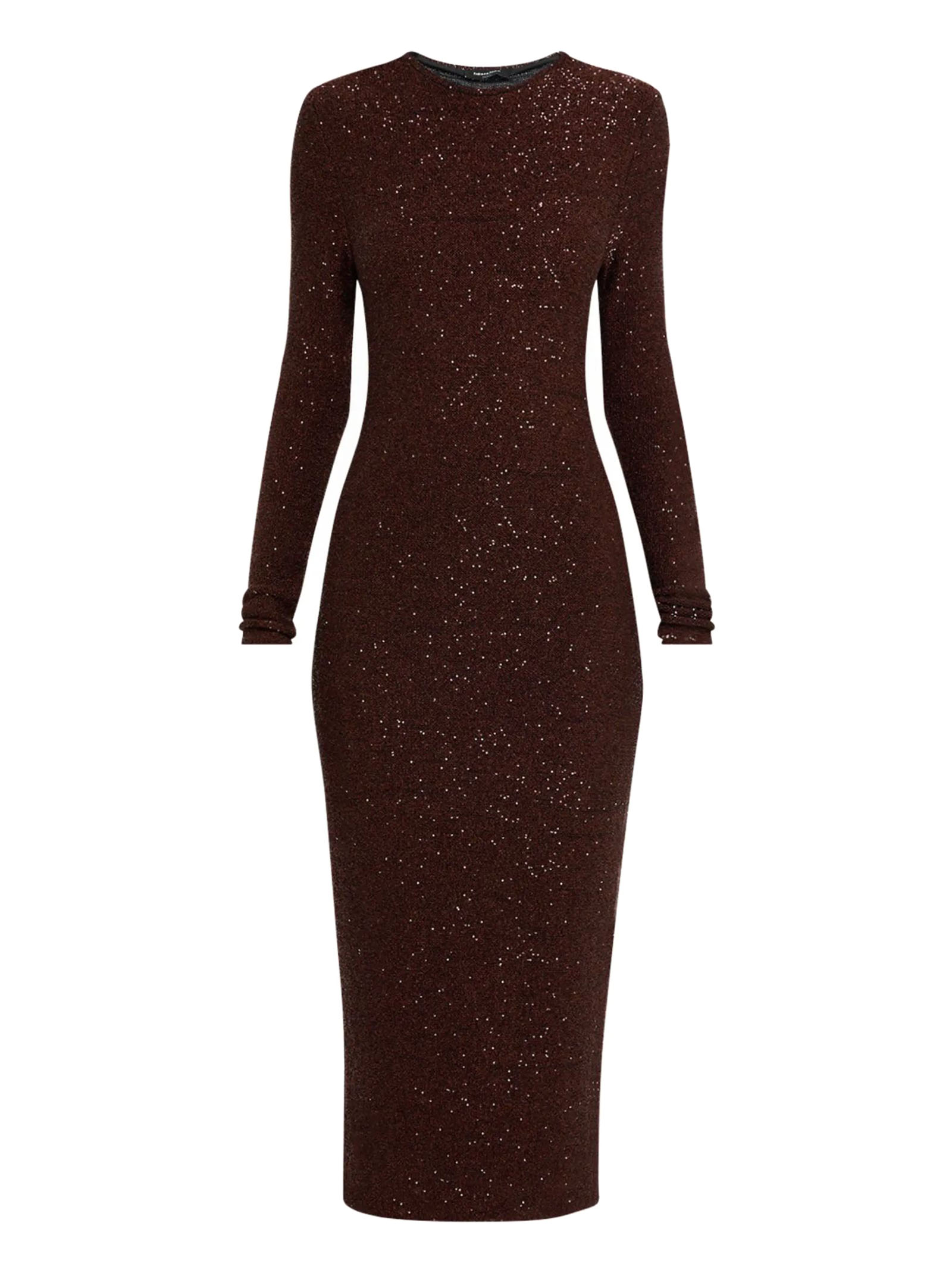 Abito midi con paillettes marroni, scollo a gioiello, maniche lunghe, orlo sotto il ginocchio, silhouette aderente, stile slipover