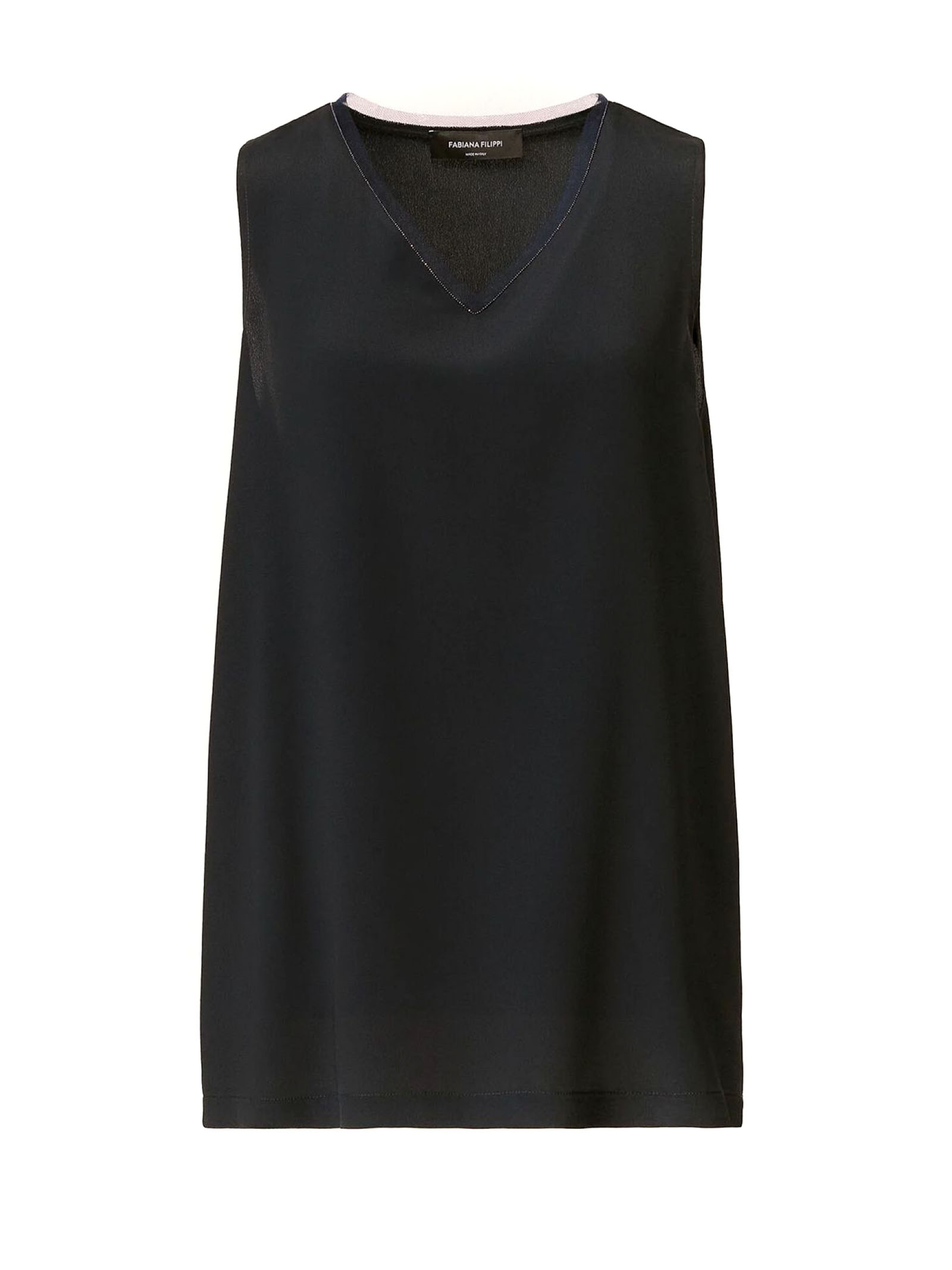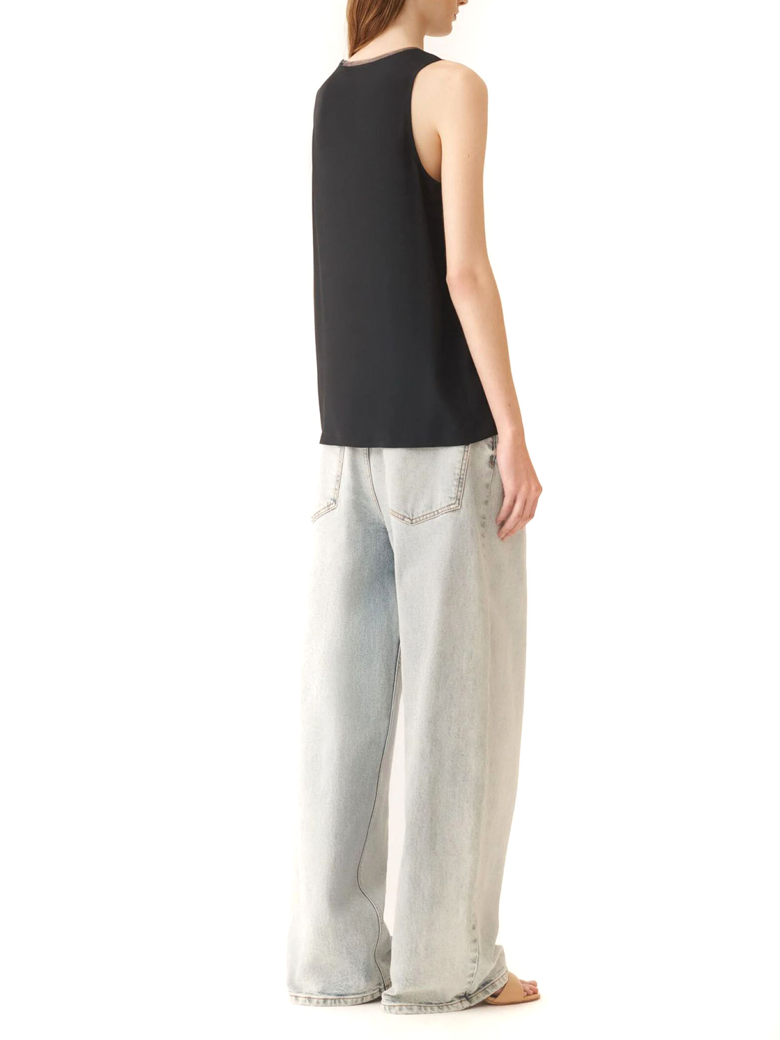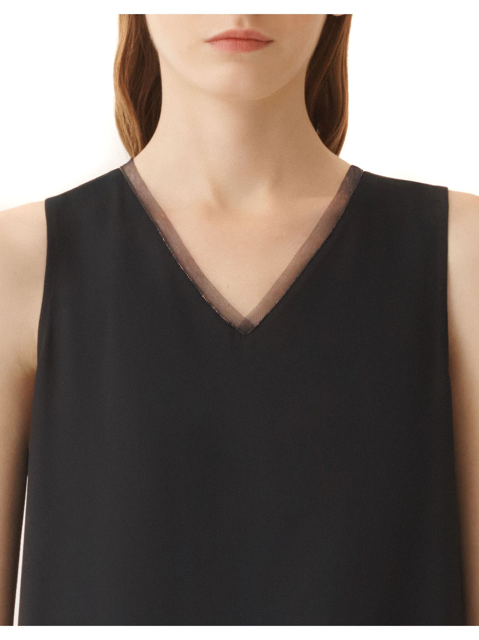Canotta scollo a V in un innovativo crepe de chine misto seta, caratterizzato da una finitura lavata che dona una texture opaca e una mano fluida, bordo in tulle e il dettaglio filo diamante