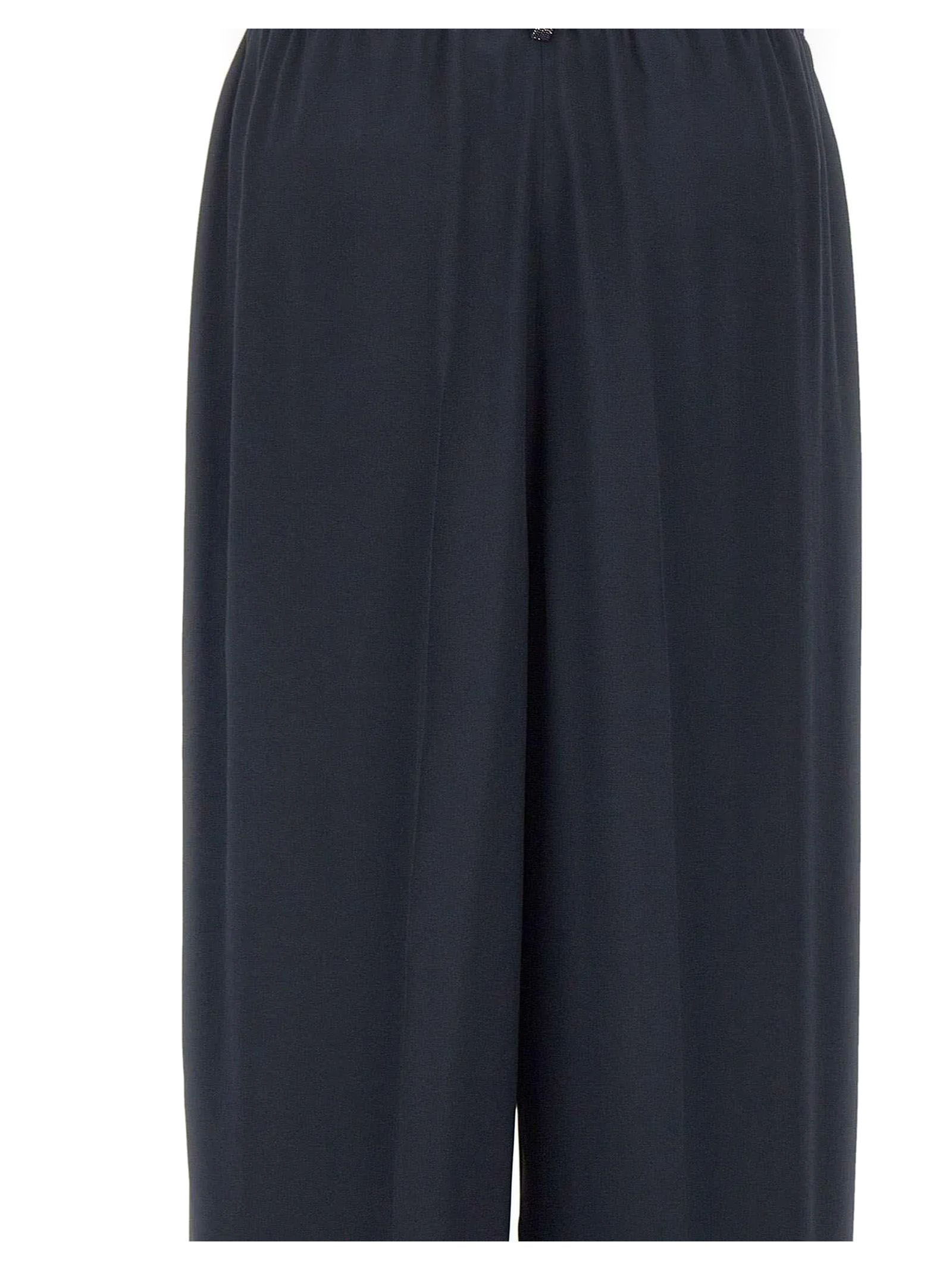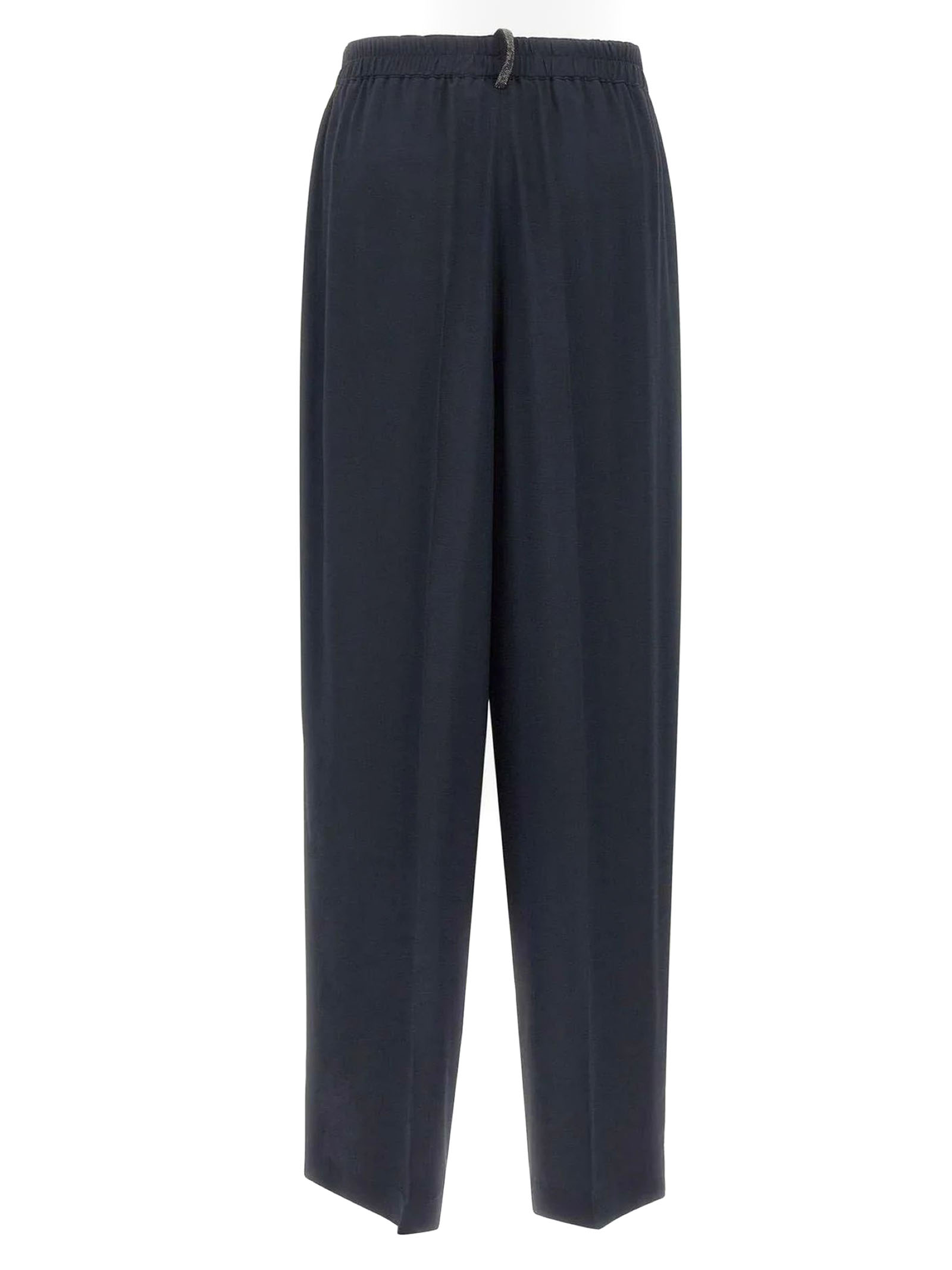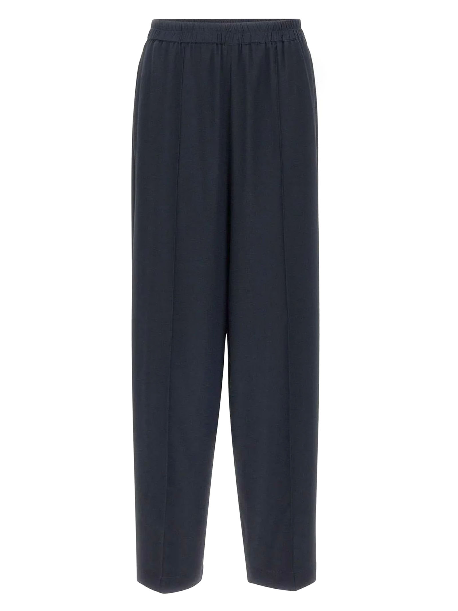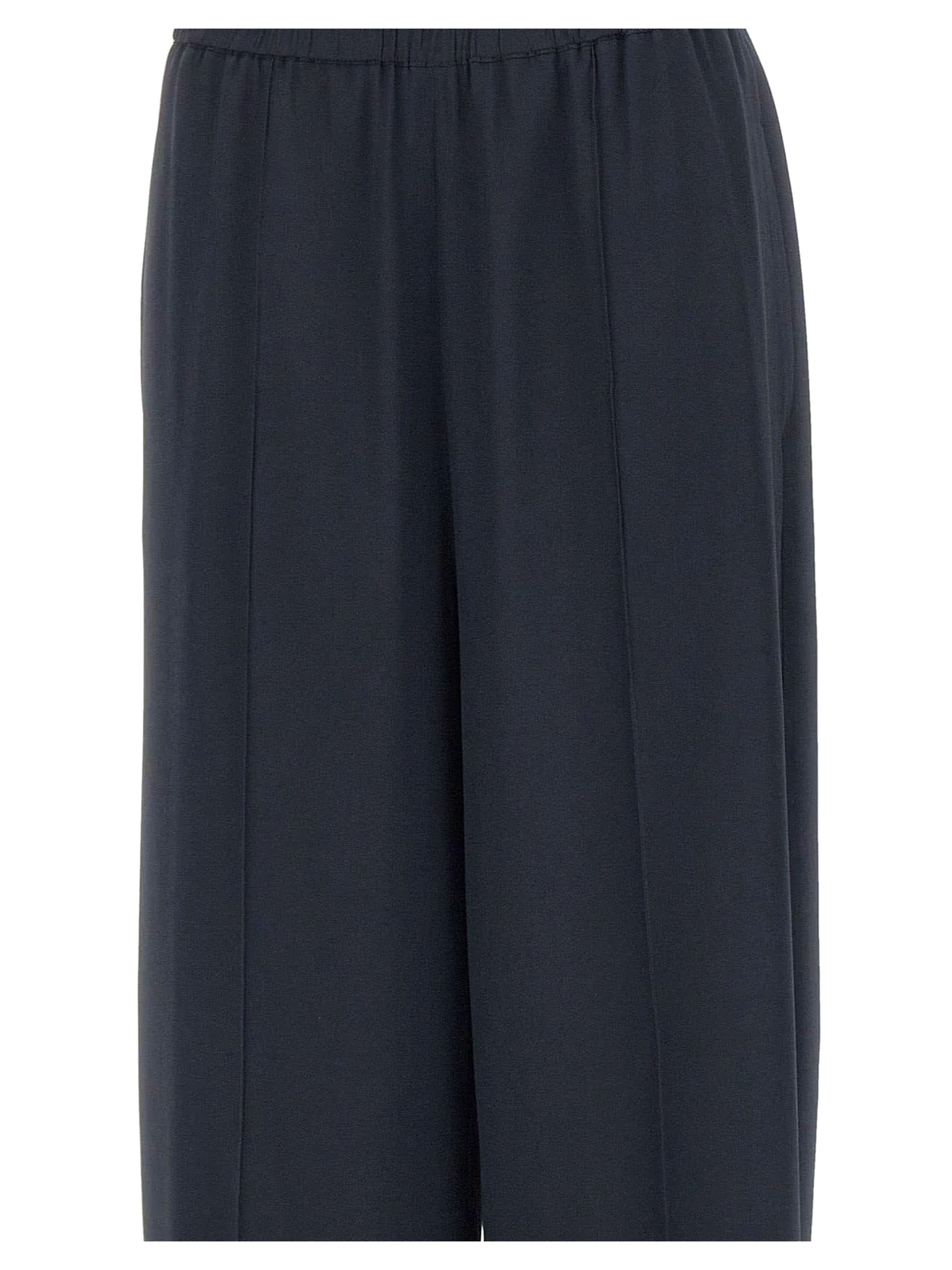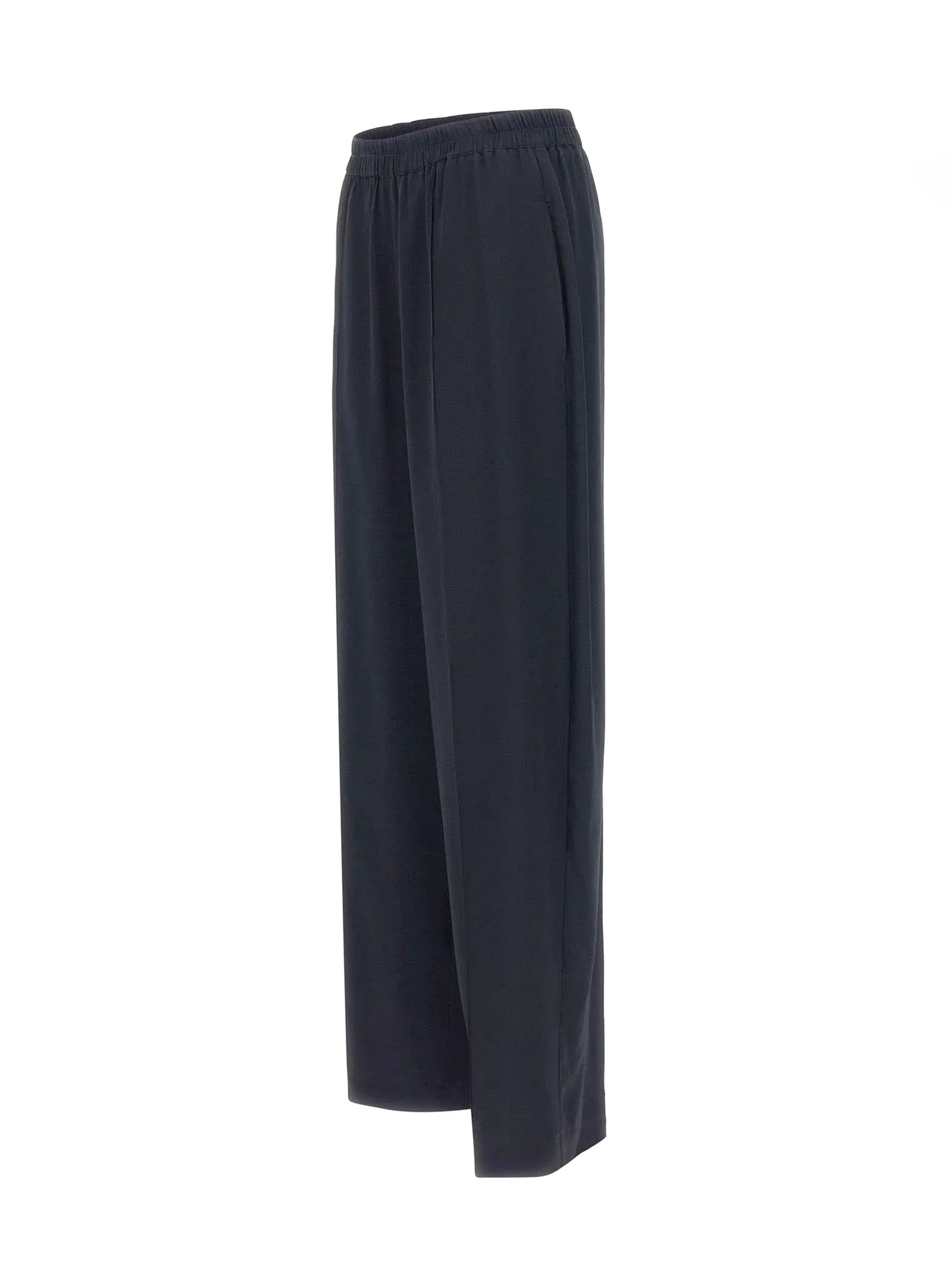 Pantalone in crepe de chine misto seta con raffinata finitura lavata color blu scuro, gamba ampia, texture opaca, dettaglio filo diamante sul passante, tasche laterali, vestibilità regolare